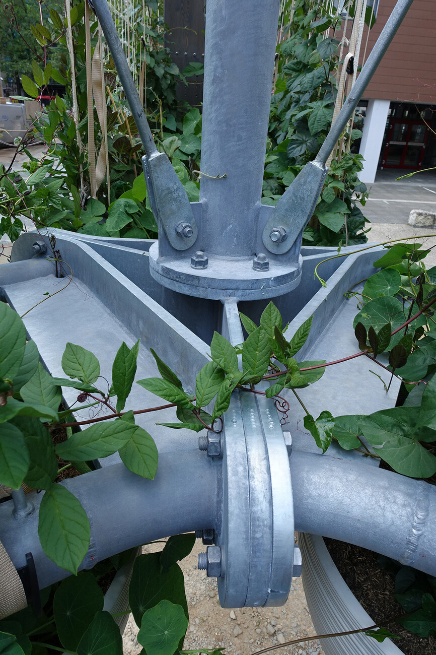 Die vertikale Begrünung spendet im Sommer Schatten, kühlt die Umgebung, bindet Feinstaub, mindert die Lärmbelastung und speichert CO2. Aufgrund der Ernte im Herbst entfallen der Aufwand für Rückschnitt und Laubbeseitigung. Die über den Sommer gewachsene Biomasse gelangt als neuer Rohstoff zurück in den Kreislauf. Der Vorteil gegenüber Bäumen: Die Konstruktion greift kaum in die bestehende Infrastruktur ein und wirft ihren Schatten bedeutend schneller als Bäume, die erst nach einigen Jahren eine Krone mit entsprechendem Durchmesser ausbilden.