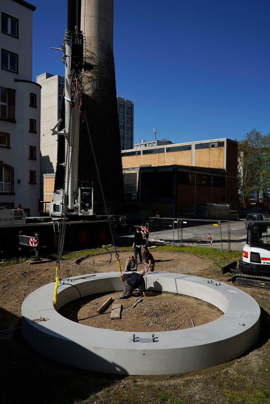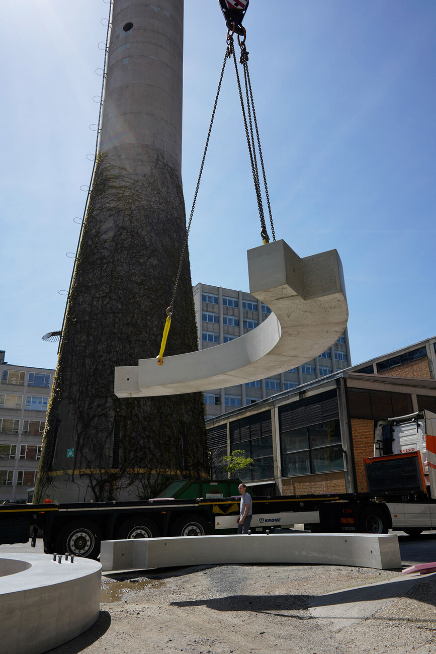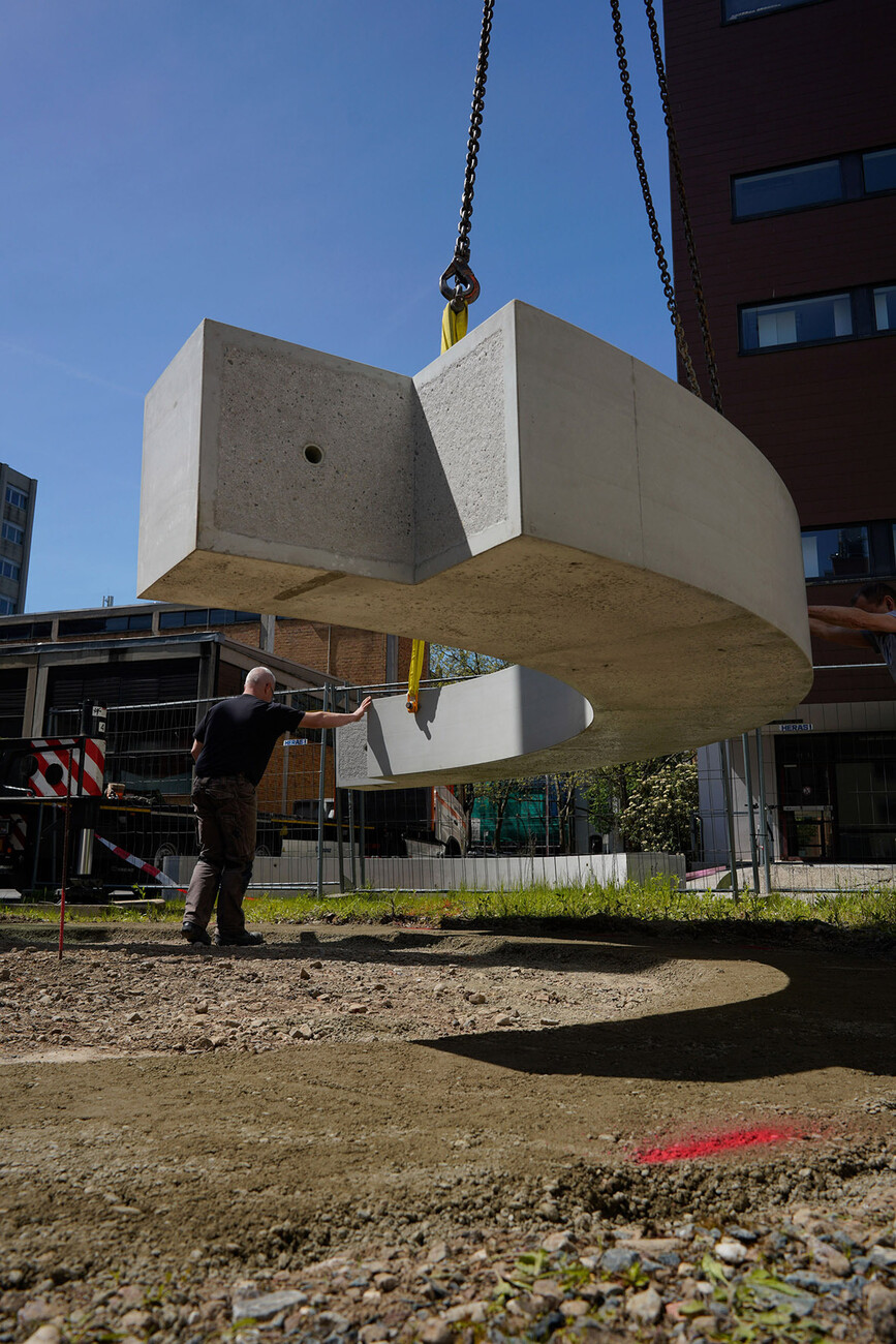 "Obwohl das Projekt klein ist, ist es nicht unkomplex", sagt Philipp Eisenbach. Die Herausforderung: Die Konstruktion sollte modular, komplett zerstörungsfrei ab- und wiederaufbaubar und oberirdisch sein. Dazu traf ein relativ kleiner Grundriss von fünf Metern Durchmesser auf ziemlich viel Windangriffsfläche in sieben bis zehn Metern Höhe, was eine enorme Hebelwirkung verursacht. "Jede/r SeglerIn weiß, welche Windkräfte auf ein Segel – und als solches betrachten wir die Pflanzenwände – wirken können“, erklärt der Ingenieur. "Wir aber konnten keine zugfesten Fundamente im Boden verankern, keine Pfähle setzen, keine Haken, gar nichts." Der Betonring, bestehend aus drei baugleichen Modulen, der den "VERD°"-Prototyp nun am Umkippen hindert, ist knapp 18 Tonnen schwer. Das mag sich nach viel anhören, ist jedoch ein Gewicht, das die meisten öffentlichen Plätze und der Straßenraum aushalten, da diese in der Regel auf Schwerlastverkehr, zu dem auch Feuerwehrfahrzeuge gehören, ausgelegt sind. Die Schwierigkeit bestand in der Verbindung der drei Betonmodule. "Das sind ja keine Bauklötze, die man mal eben so hin und herschiebt. Das sind Schwergewichte, die an einem Kran hängen", so Philipp Eisenbach. Gelöst haben die Ingenieure das Problem mit einer Nutverbindung, durch die horizontal ein Bolzen geschoben wird.