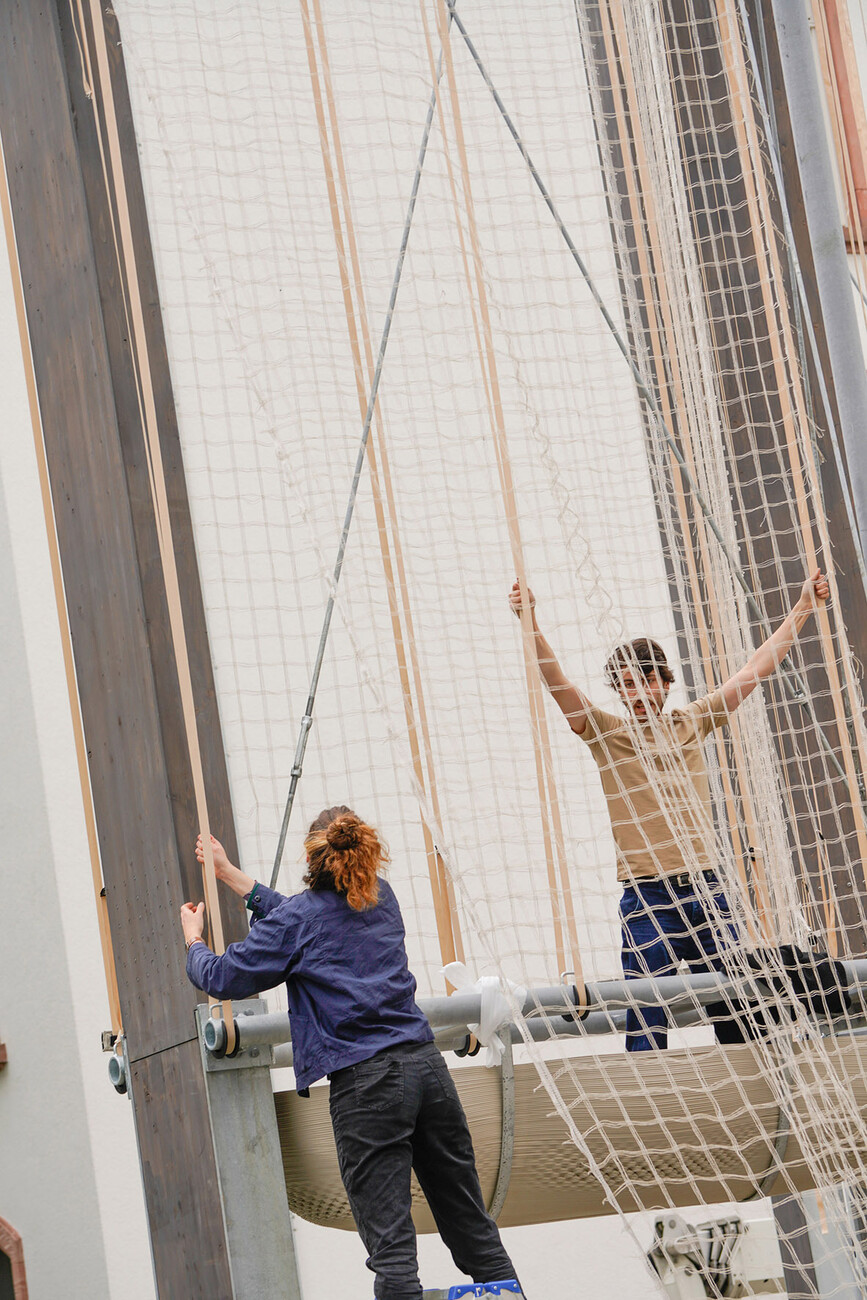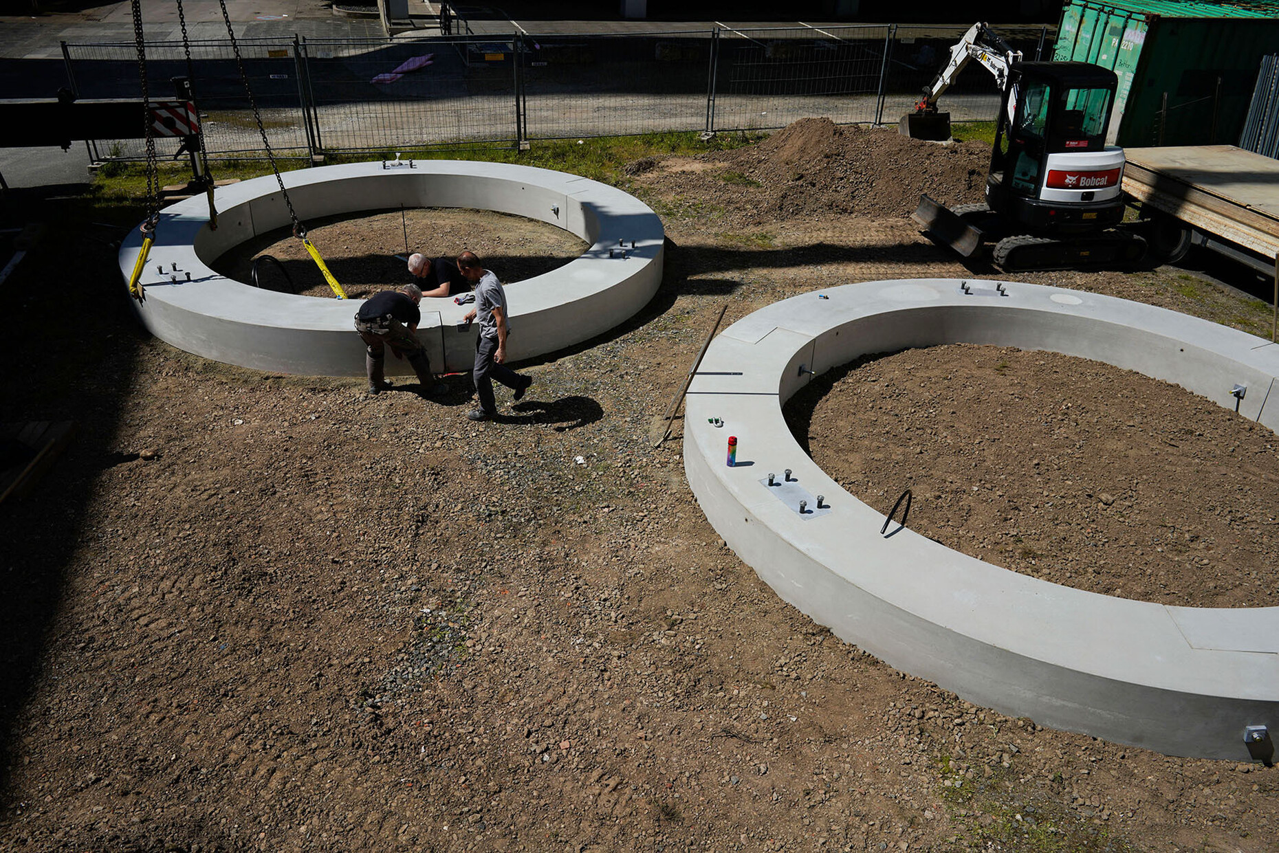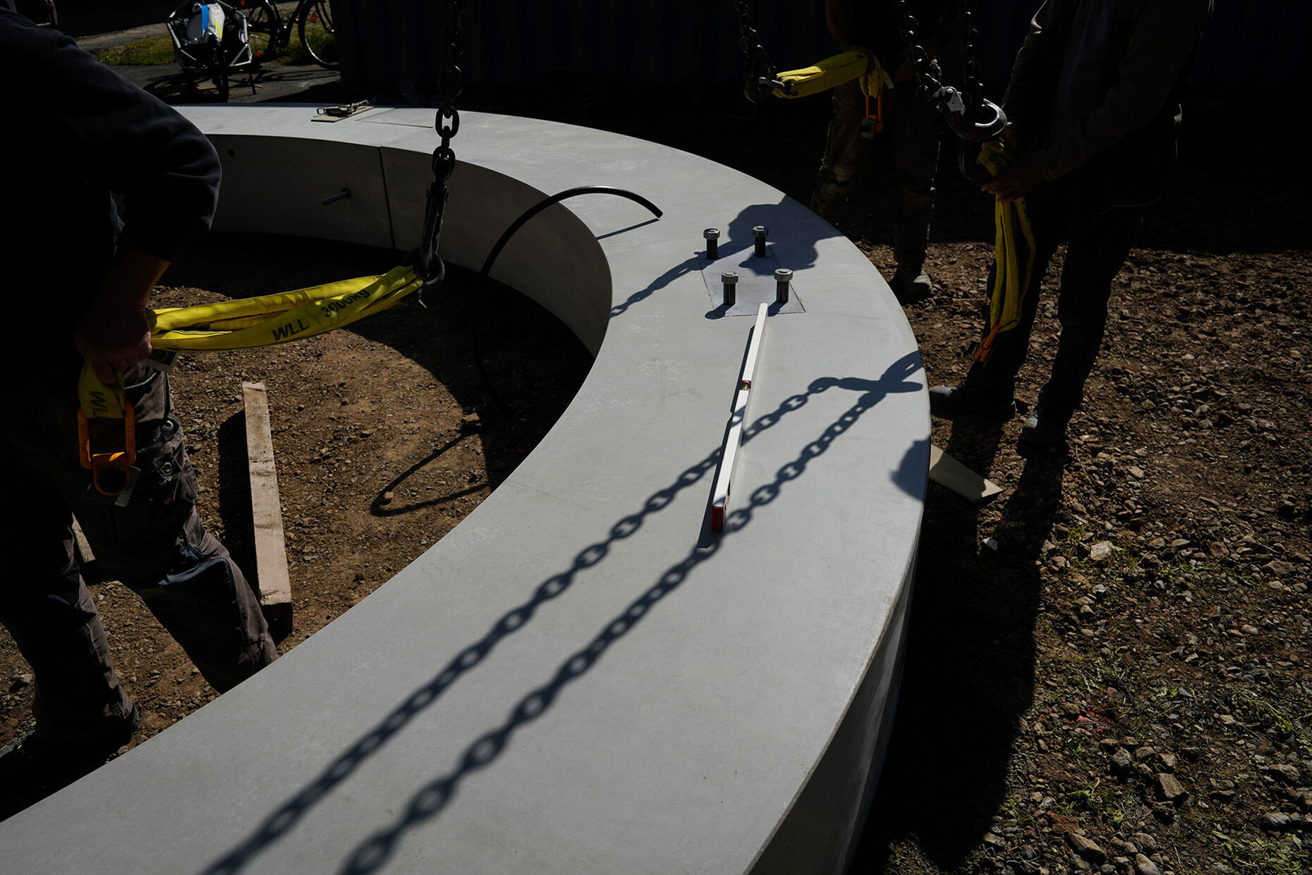 "Obwohl das Projekt klein ist, ist es nicht unkomplex", sagt Philipp Eisenbach. Die Herausforderung: Die Konstruktion sollte modular, komplett zerstörungsfrei ab- und wiederaufbaubar und oberirdisch sein. Dazu traf ein relativ kleiner Grundriss von fünf Metern Durchmesser auf ziemlich viel Windangriffsfläche in sieben bis zehn Metern Höhe, was eine enorme Hebelwirkung verursacht. "Jede/r SeglerIn weiß, welche Windkräfte auf ein Segel – und als solches betrachten wir die Pflanzenwände – wirken können“, erklärt der Ingenieur. "Wir aber konnten keine zugfesten Fundamente im Boden verankern, keine Pfähle setzen, keine Haken, gar nichts." Der Betonring, bestehend aus drei baugleichen Modulen, der den "VERD°"-Prototyp nun am Umkippen hindert, ist knapp 18 Tonnen schwer. Das mag sich nach viel anhören, ist jedoch ein Gewicht, das die meisten öffentlichen Plätze und der Straßenraum aushalten, da diese in der Regel auf Schwerlastverkehr, zu dem auch Feuerwehrfahrzeuge gehören, ausgelegt sind. Die Schwierigkeit bestand in der Verbindung der drei Betonmodule. "Das sind ja keine Bauklötze, die man mal eben so hin und herschiebt. Das sind Schwergewichte, die an einem Kran hängen", so Philipp Eisenbach. Gelöst haben die Ingenieure das Problem mit einer Nutverbindung, durch die horizontal ein Bolzen geschoben wird.