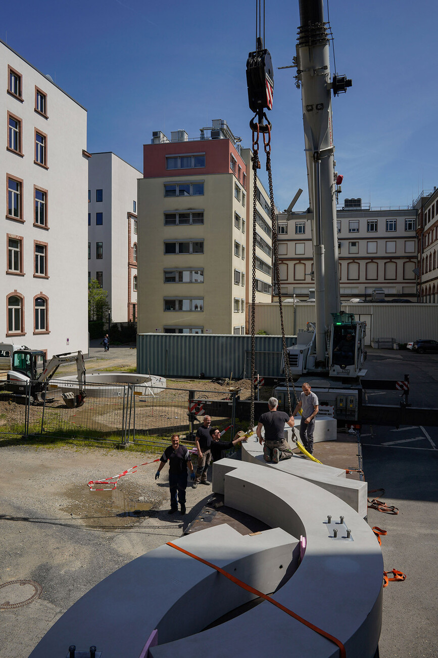 Die Verbindung zwischen Betonring und Stahlrahmen war eine noch größere Herausforderung. Die Stahlrahmen werden dazu auf aus dem Beton ragende Bolzen gesteckt und festgeschraubt. Um die Verbindung kraftschlüssig herstellen zu können, mussten die Ingenieure, Stahl- und Betonbauer hier mit einem auf dem Bau unüblichen Toleranzbereich von wenigen Millimetern arbeiten. "An den Aufbautagen haben wir schon ein wenig geschwitzt, wann das Telefon klingeln würde mit der Info, dass die Teile nicht zusammenpassen", verrät Philipp Eisenbach. Jedes Bauteil ist auf eine lieferbare Größe wieder abbaubar. Das heißt, kein Bauteil ist breiter als drei Meter, sodass es per LKW transportiert werden kann. Es gibt auch keine Stoffschlüsse, keine vermörtelten Fugen oder verschweißten Stahlnähte, die wieder voneinander getrennt werden müssten. Für die lösbaren Schraubstöße ist Millimeterarbeit nötig. "Das haben wir vom Fundament weg konsequent durchgezogen. Da sind wir schon ein wenig stolz drauf", sagt Philipp Eisenbach.