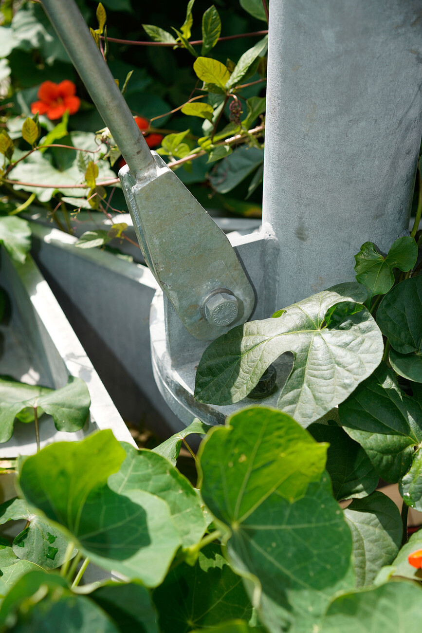 Beim Prototyp in Frankfurt am Main hängen sie auf drei Metern Höhe, als Schutz vor Vandalismus und aus Sicherheitsgründen, damit niemand an den Netzen hochklettern kann. Die zehn Meter Gesamthöhe ergibt sich einerseits aus der enormen Wuchsgeschwindigkeit der ausgewählten Pflanzen – schließlich möchte man im Herbst möglichst viel Biomasse ernten. Dies ist auch der Grund, weshalb in einen Rahmen jeweils Doppelnetze gespannt sind, an denen mehr Pflanzen emporranken können. Andererseits ist "VERD°" als Pflanzgestell bis zu einer Höhe von 9,99 Meter genehmigungsfrei. Die Statik muss natürlich trotzdem sitzen, allein schon wegen der Kipp- und Sturmsicherheit – eine ungewöhnliche Aufgabe für die Ingenieure des Büros Bollinger+Grohmann, die sonst die Tragwerksplanung großformatiger Hochbauten machen. Die Zusammenarbeit kam über Kontakte zu Just Architekten zustande.