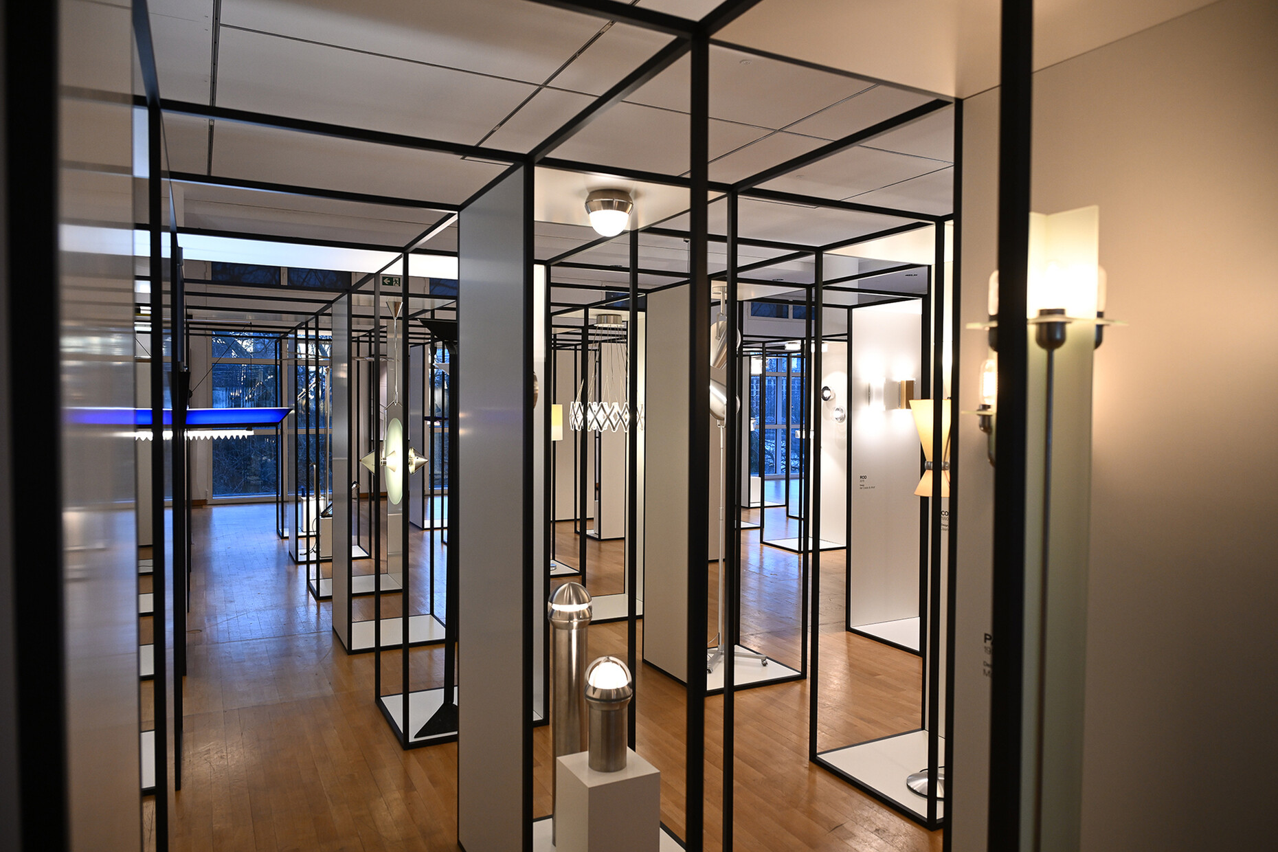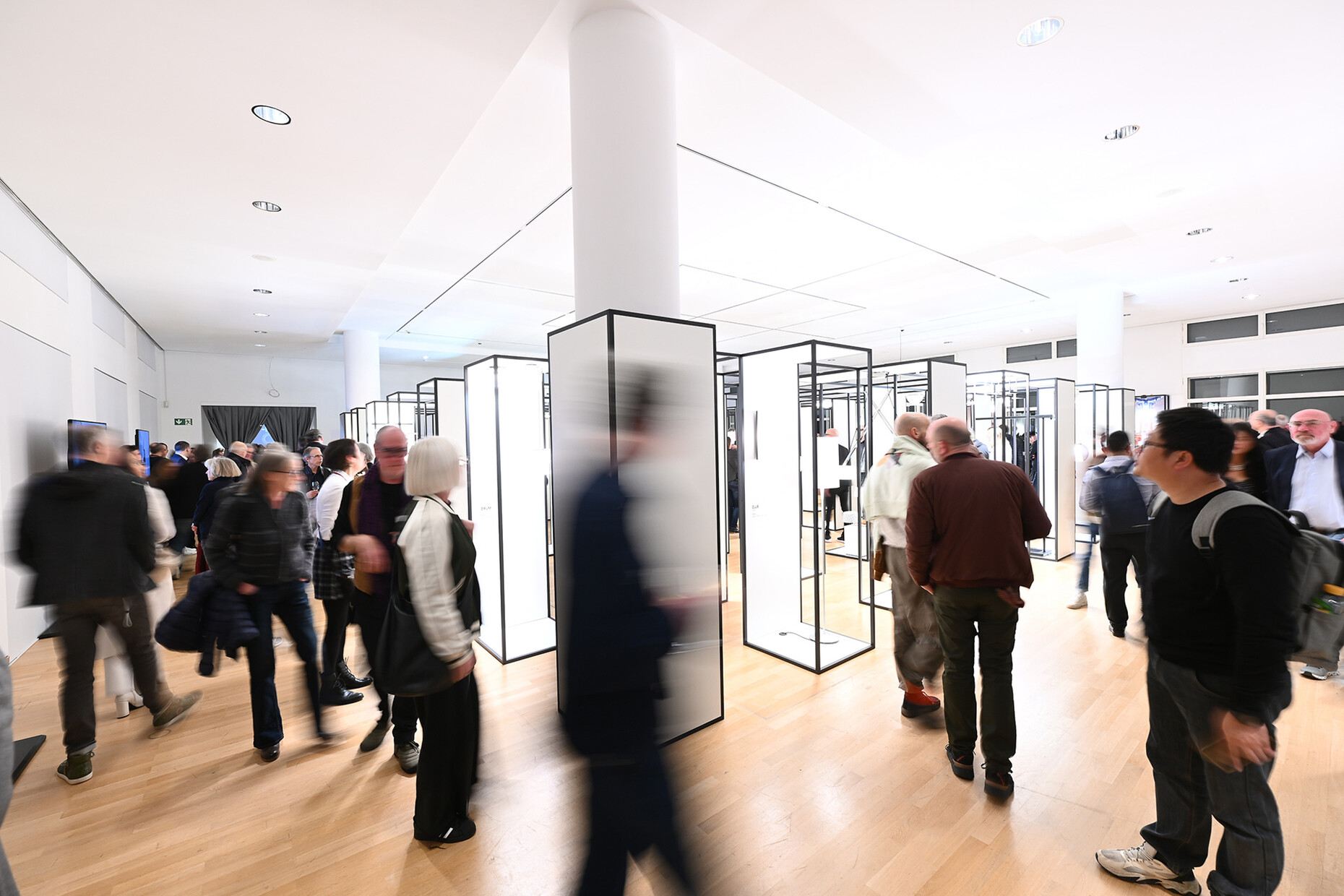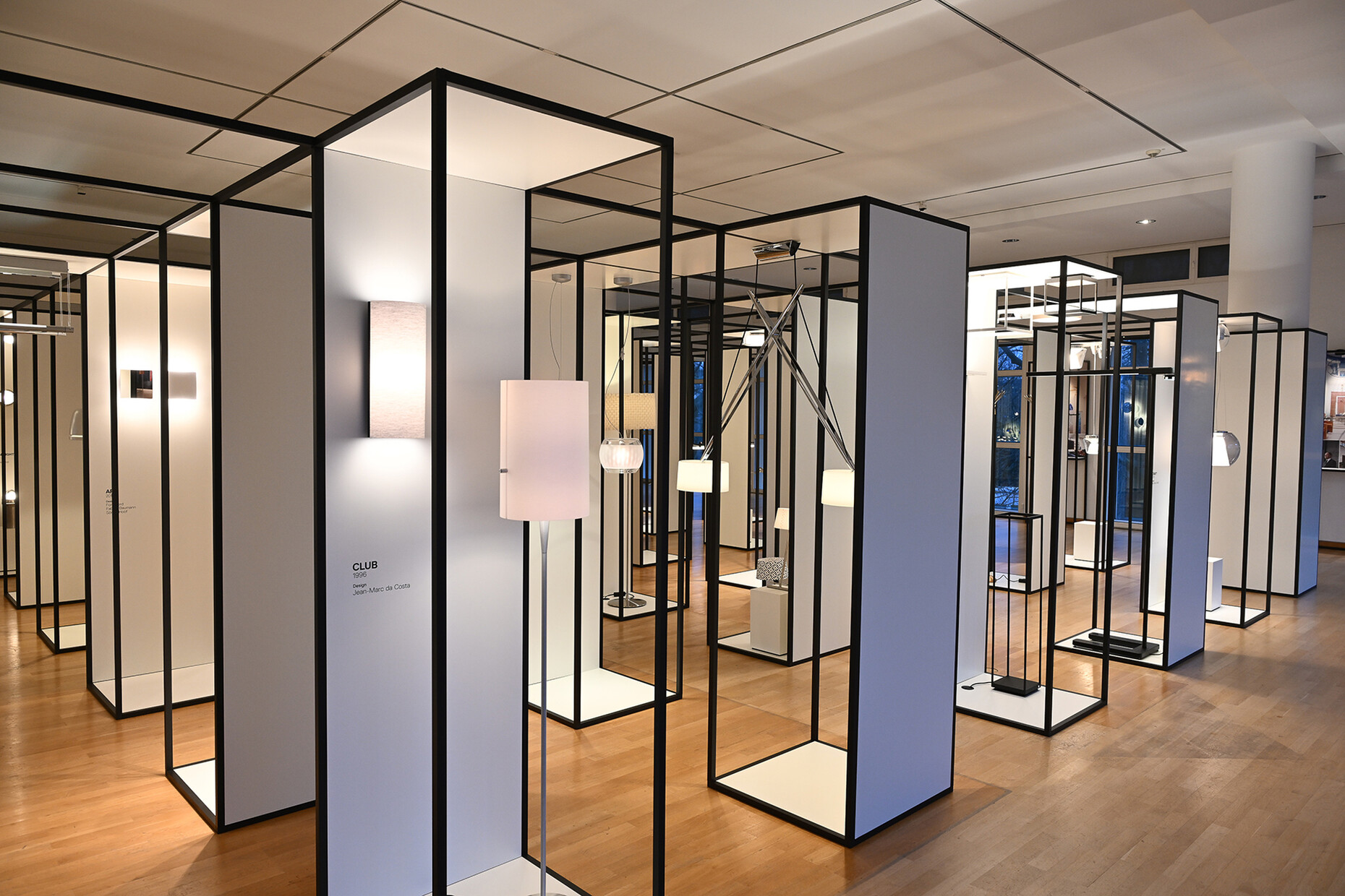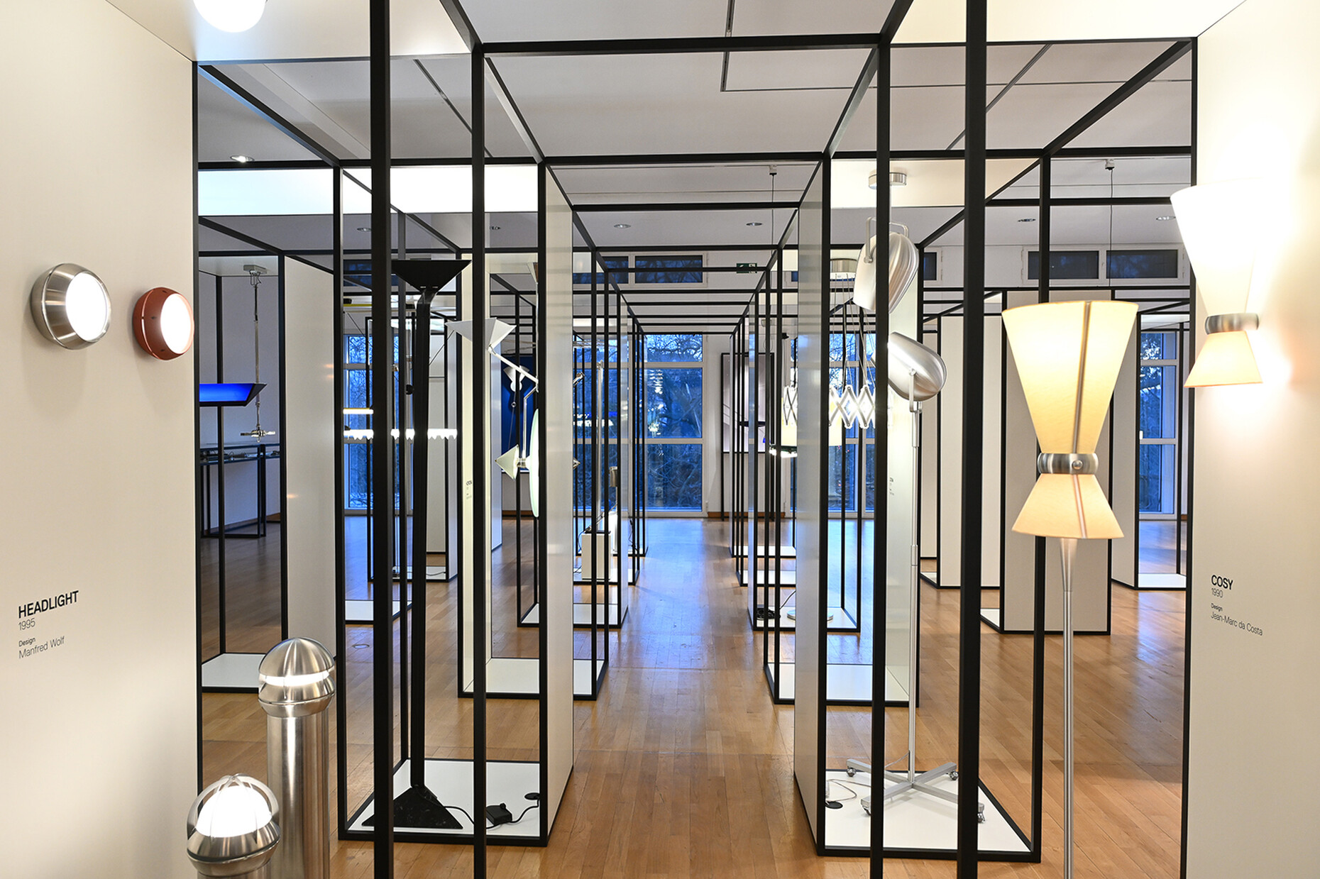 Dass die Inszenierung von Licht zu ihrer Expertise geworden und noch immer ihre Leidenschaft ist, machte jeder Satz und schließlich auch das überzeugende Ausstellungsdesign deutlich: Es basiert auf einem Konzept, das Manfred Wolf für eine Messeteilnahme des Unternehmens konzipiert hatte und das dem langezeit schweren Messebau etwas entgegensetzen wollte. In einer rasterförmigen Displayarchitektur, konstruiert aus schwarzen Vierkantrohren, bilden sieben mal sieben Quader Platz für je ein Leuchtendesign. Insgesamt 44 identische Aufbauten ermöglichen die gleichwertige Würdigung der gewählten Exponate. Durch den architektonischen Rhythmus, die vielen Lichtpunkte und die unzähligen Gäste verwandelte sich die Ausstellungsfläche in eine Art labyrinthisches Spiegelkabinett, dass das vielfältige Schaffensspektrum schillernd präsentiert. An den Außenwänden gewähren Screens und weitere Objekte einen tieferen Einblick in Projekte, Sondereditionen und Details der Unternehmensgeschichte.