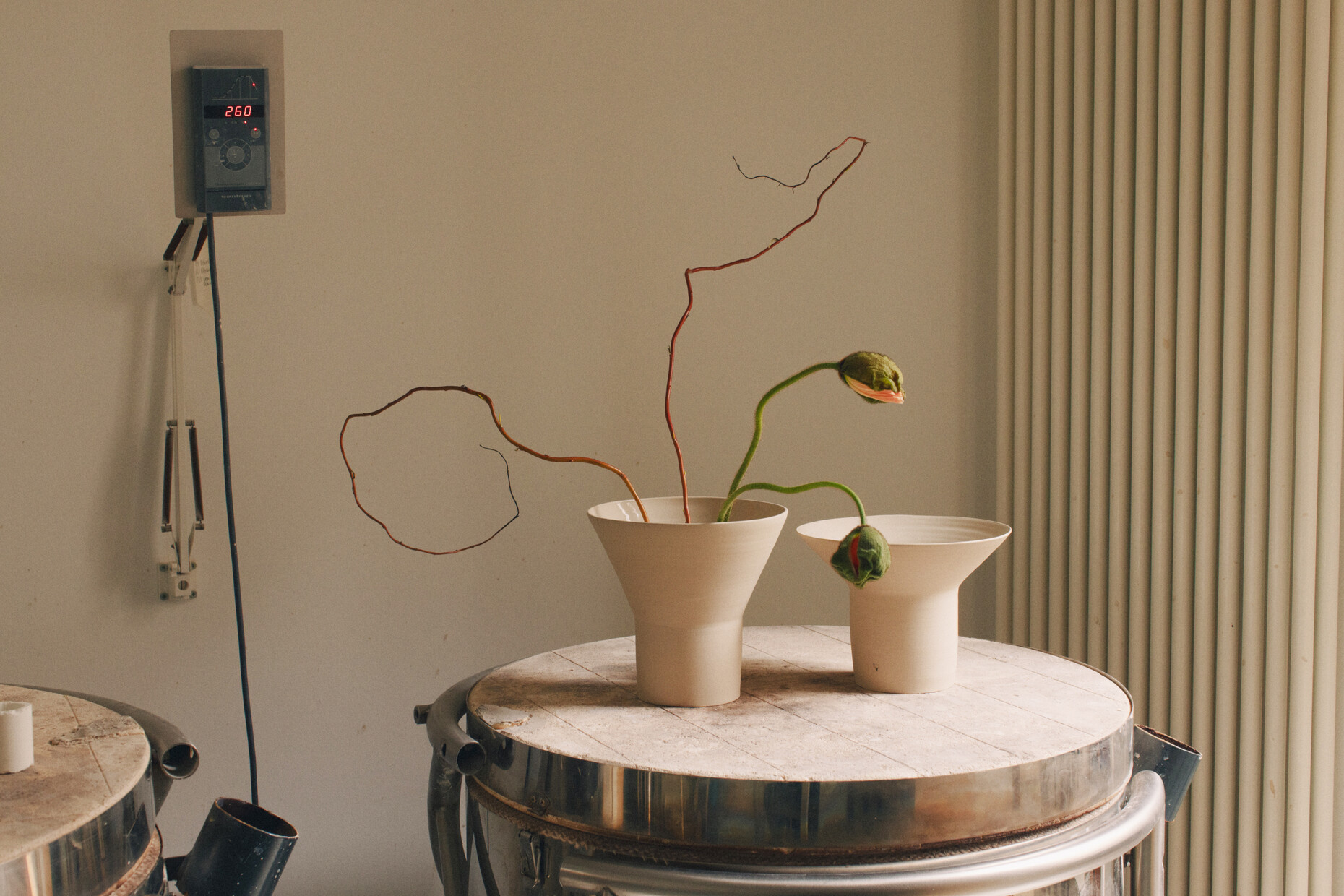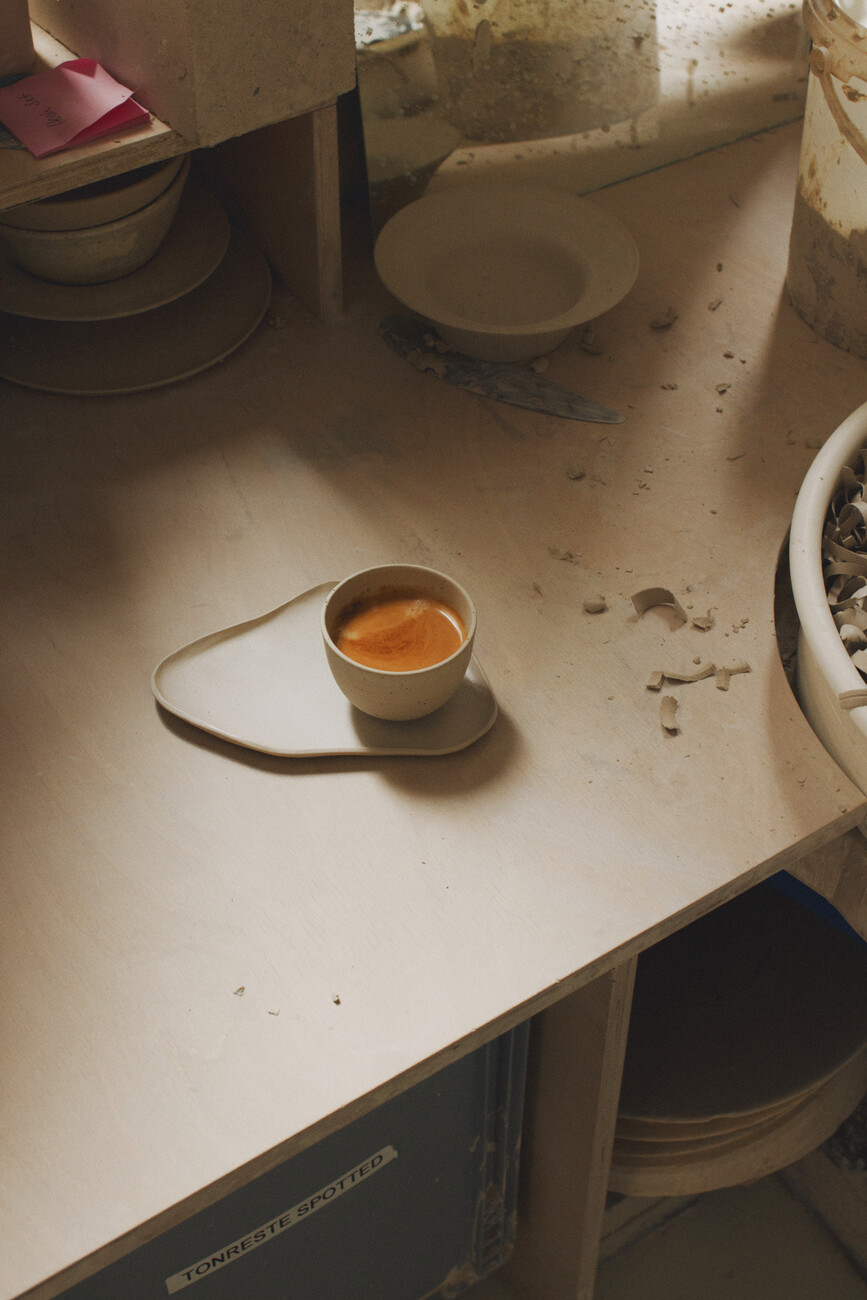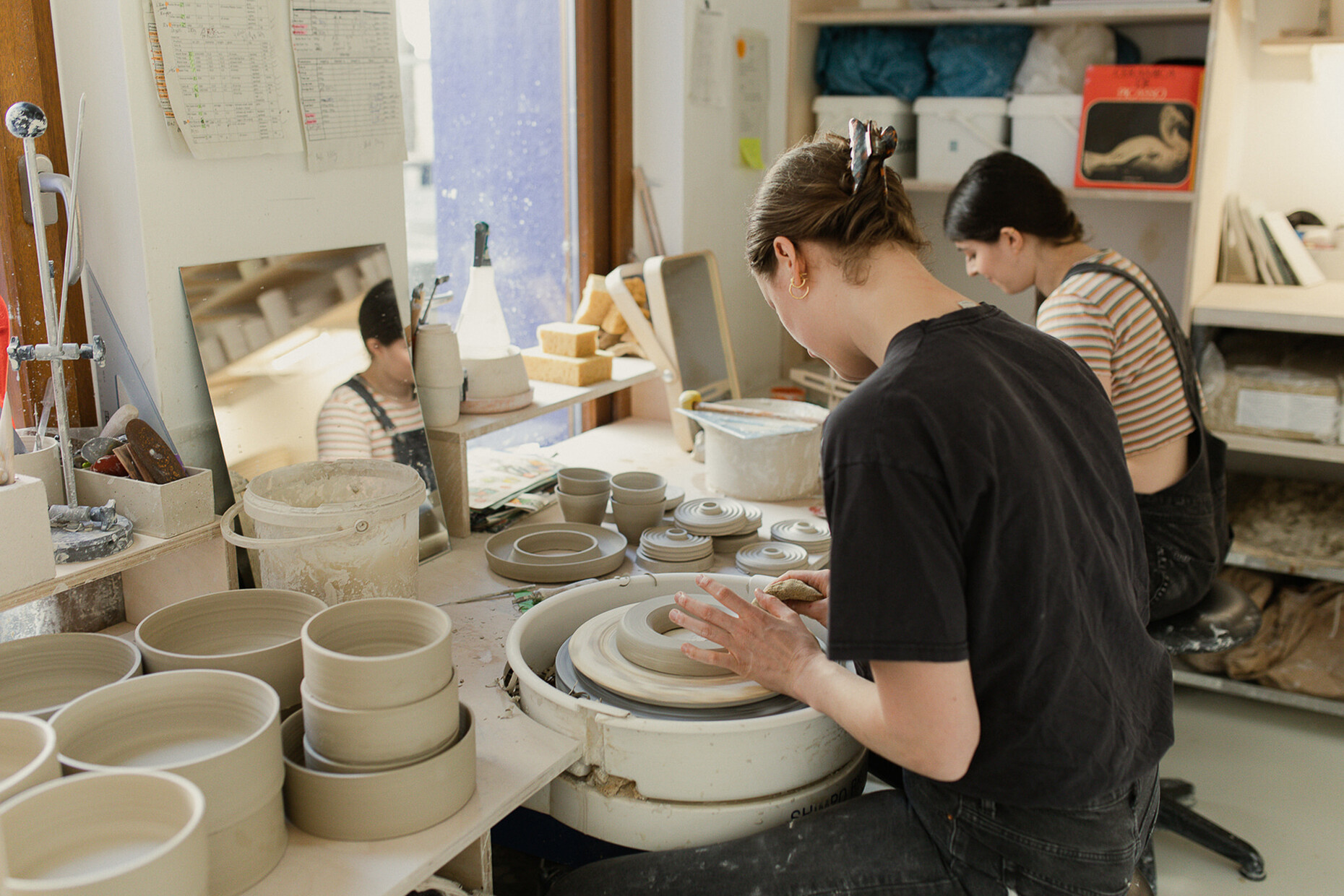Wer schon einmal erlebt hat, wie aus einem einfachen Klumpen Ton auf der Töpferscheibe Drehung um Drehung eine Tasse oder Vase entsteht, der weiß: Das ist Meditation pur. Ton hat etwas sehr Ursprüngliches, etwas Elementares. Auf viele Menschen wirkt der Umgang mit diesem Material erdend und zentrierend. Auch Viola Beuscher ist über diese Eigenschaften zum Töpfern gekommen: Die gebürtige Fuldaerin studiert 2014 Journalismus und Politikwissenschaft und steht kurz vor dem Abschluss ihrer Bachelorarbeit, als sie in einen Unfall verwickelt wird. In der Folge wird sie berufsunfähig – mit gerade einmal 22 Jahren. Heilung findet sie unter anderem in der intensiven Beschäftigung mit Ton. Zweieinhalb Jahre lang töpfert sie fast täglich – zunächst im Rahmen der Therapie, später zu Hause. Rückblickend war das die Zeit, in der sie die Grundlagen für “viola beuscher ceramics” legte – und für alles, was seither daraus entstanden ist. “Das A und O im Handwerk ist, dass man die Zeit hat, um zu üben, zu üben, zu üben”, sagt sie. “Durch den Unfall hatte ich das Privileg, diese Zeit zu haben. Auch wenn es sich damals nicht wie ein Privileg angefühlt hat.” Als Viola Beuscher 2017 langsam ins Leben zurückfindet, steht sie vor der Frage, was sie beruflich machen will. Ein Studium kann sie sich nicht mehr vorstellen. Die Anfrage befreundeter Gastronomen kommt da gerade recht. Zum ersten Mal fertigt sie eine Serie von Tellern und Schalen nach individuellen Wünschen an. Es ist der Beginn ihrer Selbstständigkeit.