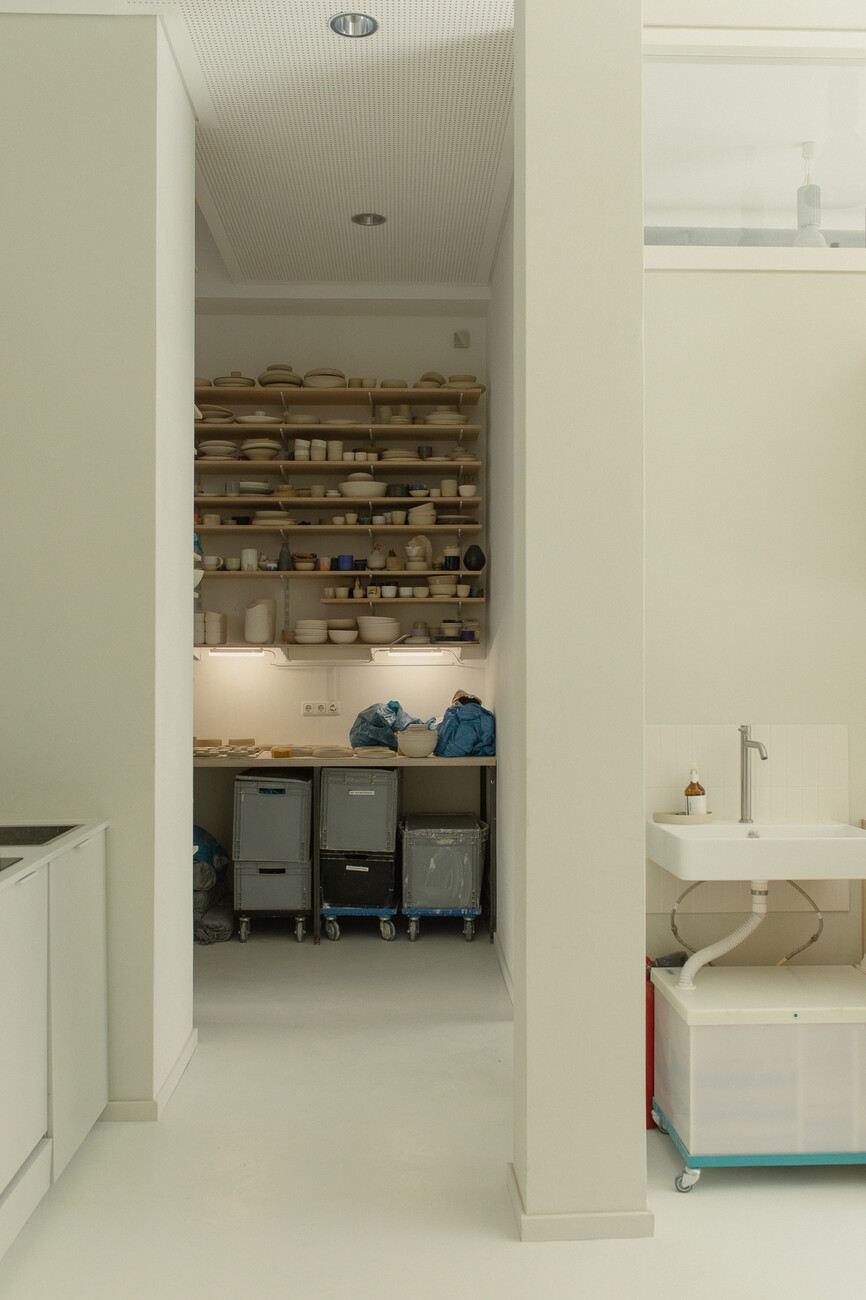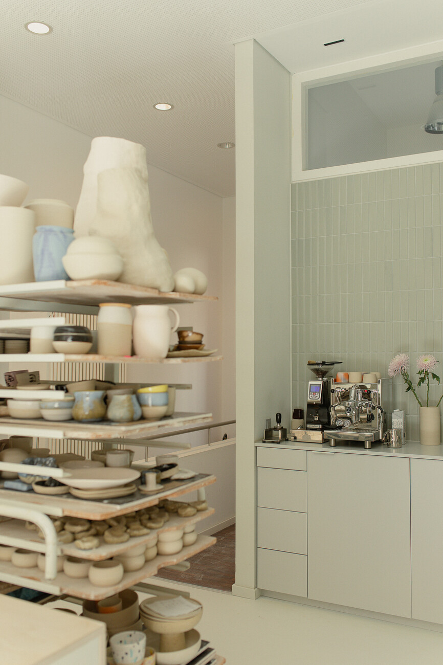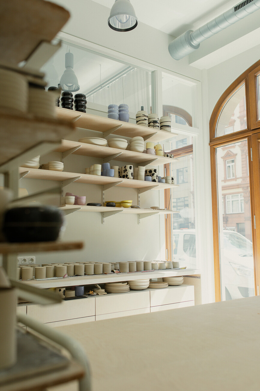 Von da an geht alles ganz schnell: Mit ihrer geradlinigen, minimalistischen Keramik stößt Viola Beuscher in der Frankfurter Gastronomieszene auf reges Interesse. Bald kennt man die Töpferin auch über die Stadtgrenzen hinaus. “Die Nachfrage war von Anfang an so groß, dass ich schnell lernen musste, auch mal nein zu sagen”, erinnert sie sich. Beuscher mietet Räume in der Taunusstraße und übernimmt mit ihren damals drei Mitarbeiterinnen fortan vor allem Aufträge von Restaurants und Cafés. Bis zu 300 Teller, Schalen oder Becher fertigen sie in Handarbeit für jede und jeden ihrer KundInnen. Mindestens acht Stunden täglich, sieben Tage die Woche. Dann kommt die Pandemie. Die Bestellungen bleiben aus, bereits erteilte Aufträge werden storniert. Mit Unterstützung ihres Partners Philip Biedermann, der heute als stellvertretender Geschäftsführer im Unternehmen tätig ist, startet Viola Beuscher quasi über Nacht einen eigenen Online-Shop. “Das war unsere Rettung”, erinnert sie sich.
