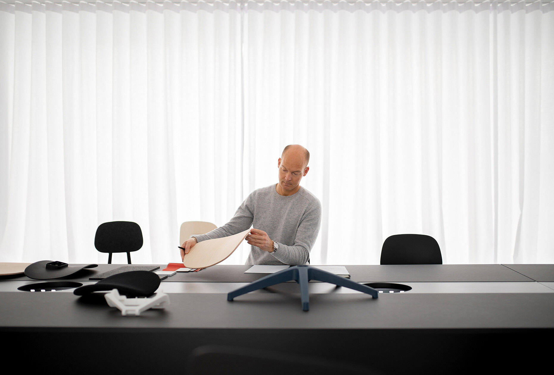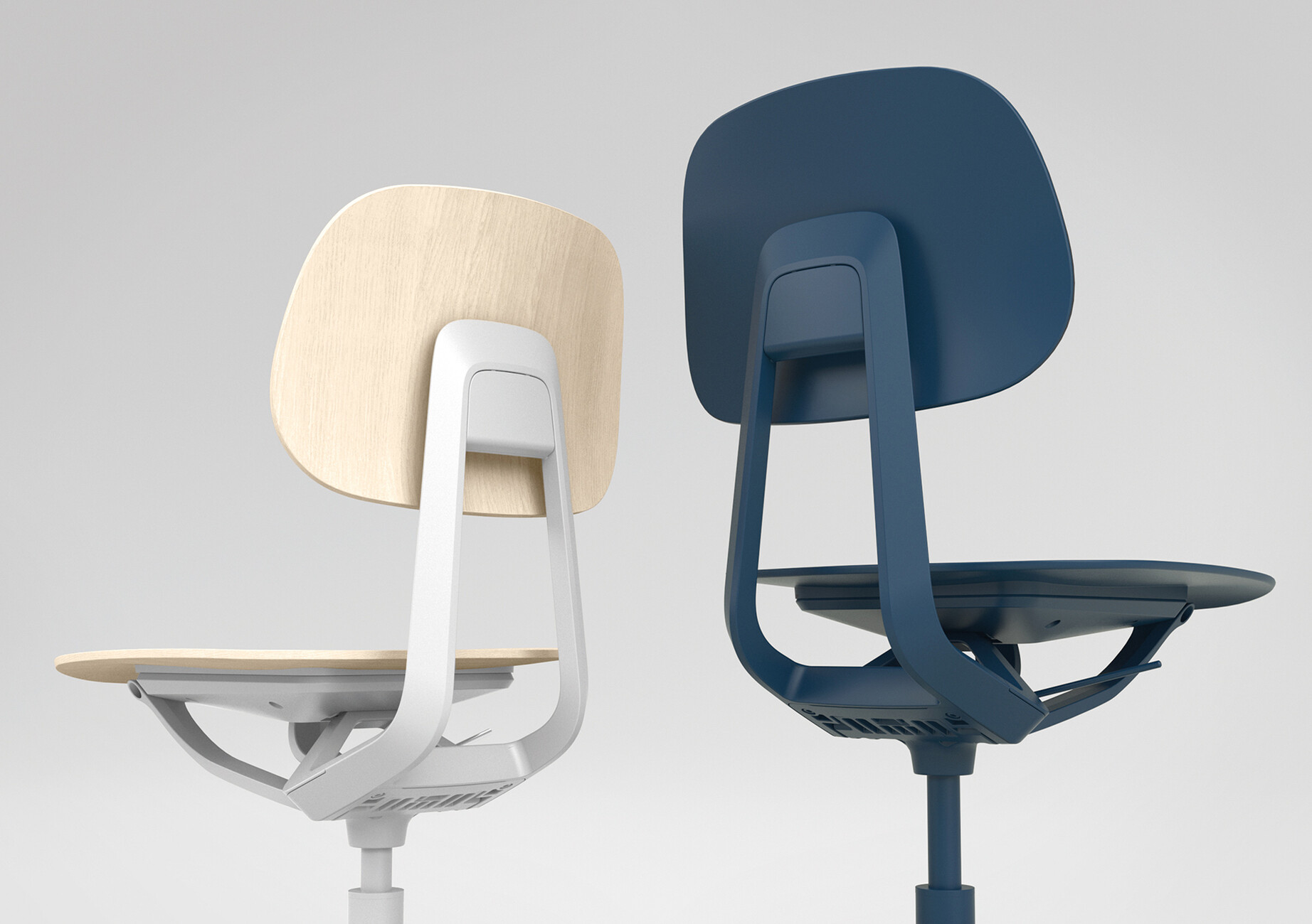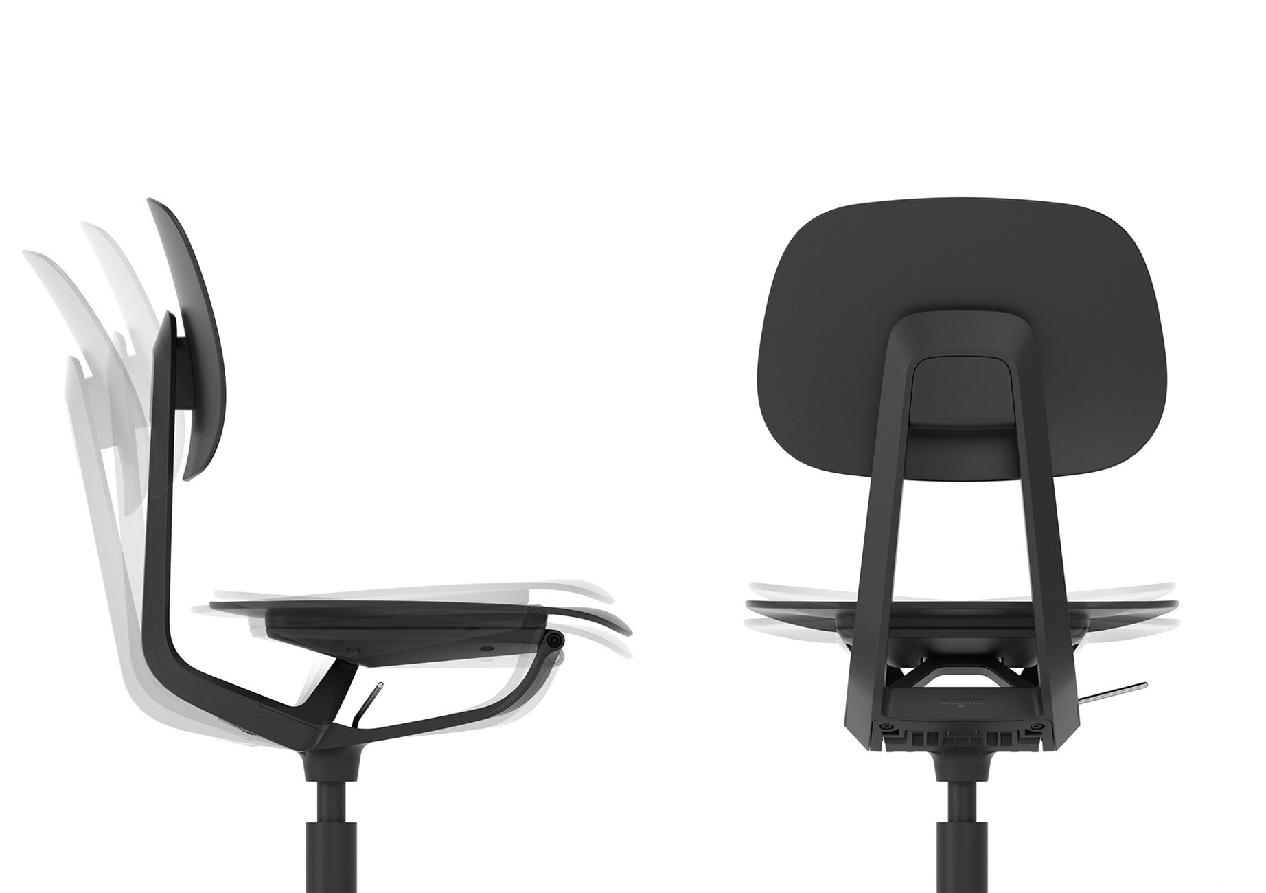 Nach einigen Stunden des Sitzens auf einem Arbeitsstuhl aus Holz und Stahl, wie er für die Industrie und Werkstätten vielerorts angeboten wird, spürt man meist recht deutlich, dass dies nicht der Weisheit letzter Schluss sein kann. Zu starr, zu hart sind die Sitzfläche und das Rückenelement, zu wenig ganzheitlich gedacht der Aufbau. Sven von Boetticher hat für Wagner Living nun mit dem "S2" den klassischen Drehstuhl meisterhaft in die Gegenwart übersetzt. Die reduzierte Form gibt die hochentwickelte Technologie dahinter nicht auf den ersten Blick preis, da sie die Funktion im wahrsten Sinne des Wortes in sich trägt: Das von Wagner zum Patent angemeldete Dondola-Gelenk ist hier mit einem ganz neuartigen Aufbau verdeckt eingebaut und benötigt keine Abstützung. Stattdessen übernehmen zwei Kunststoff-Ausleger die Federung und die Rückstellkraft. "Wir nutzen das federnde Element der Mechanik für die seitliche Lagerung des Dondola-Gelenks", erklärt Peter Wagner, der das Familienunternehmen gemeinsam mit seinem Bruder Rainer Maria in der dritten Generation leitet. Eigens entwickelte Scharniere und Aufhängelösungen schaffen eine dreidimensionale Bewegung aus der Geometrie und dem Material heraus. "Das gab es in dieser Form bislang noch nicht", sagt Sven von Boetticher. Das Gestell ist so auf das Wesentliche reduziert und bietet trotzdem die Vorteile des dreidimensionalen Sitzens, das die starre Verbindung zum Stuhlunterteil löst und für Mikrobewegungen sorgt, die die Wirbelsäule entlasten. Zum Gleichgewicht aus maximalen Sitzkomfort und ausreichend Fläche gehört darüber hinaus, dass die Form der Rückenlehne leicht gewölbt ist, um viele unterschiedliche Körpertypen ideal stützen zu können. "Wir haben diese tausendfach überarbeitet, bis sie perfekt war und an keiner Stelle drückt", so Peter Wagner.