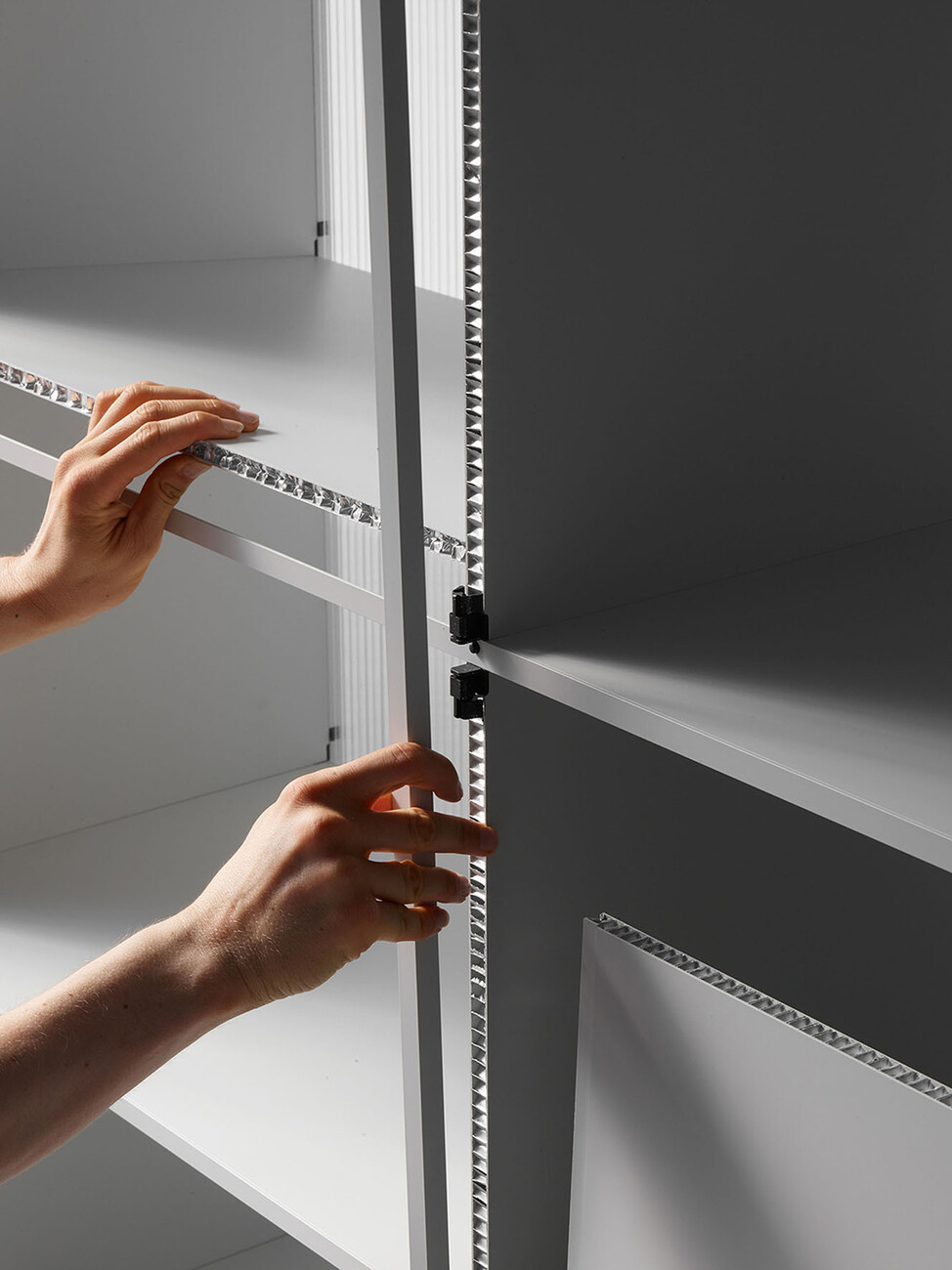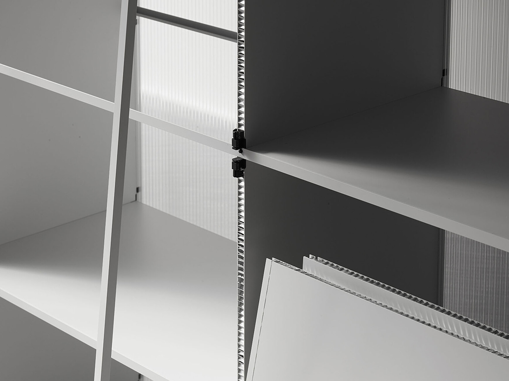 Die Basis für die Exponate bietet Wagner mit dem flexiblen Ausstellungssystem "d2" von Stefan Diez: Dank eines Baukastens an Wabenplatten aus Karton oder Aluminium sowie Profilen und Verbindern lässt sich eine modulare Kompletteinrichtung in Leichtbauweise zusammenstecken, die mit Hilfe eines Konfigurators individuell an die Struktur der jeweiligen Räume angepasst werden kann. Für "Workspace in Progress" formt das "d2"-System von Wagner so ein Depot für die Präsentation wie zwei Zoom-Boxen als Studio für Videotelefonate. Neben dem Auszug der vielfältigen Anwendungsmöglichkeiten des flexiblen Möbelsystems zeigt Wagner mit "d2" von Stefan Diez ein Paradebeispiel wie Produktionsentscheidungen und Materialwahl im Design zu einer nachhaltigen Lösung leiten können. Die BesucherInnen haben daher die Möglichkeit neben den Arbeiten der Studierenden auch das "d2"-System bis in das Detail zu begutachten, vom zusammengebauten Regal über die Einzelteile, von den getrennten Wabenplatten bis zum Granulat.