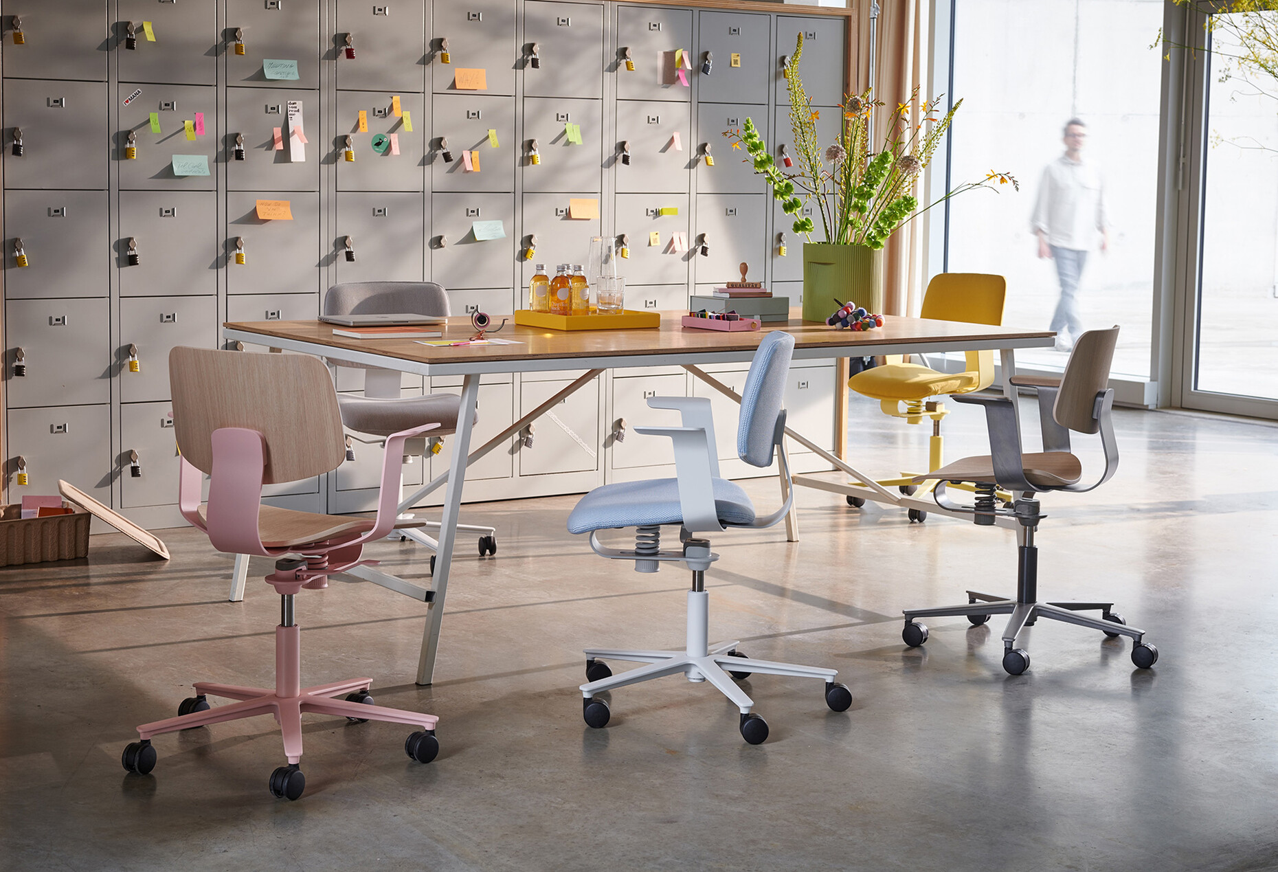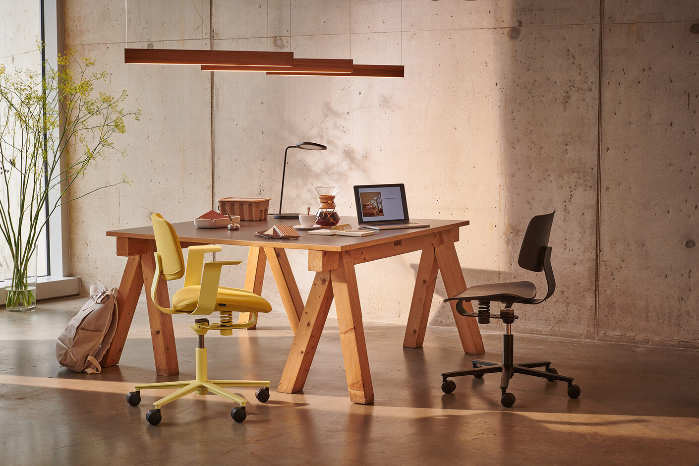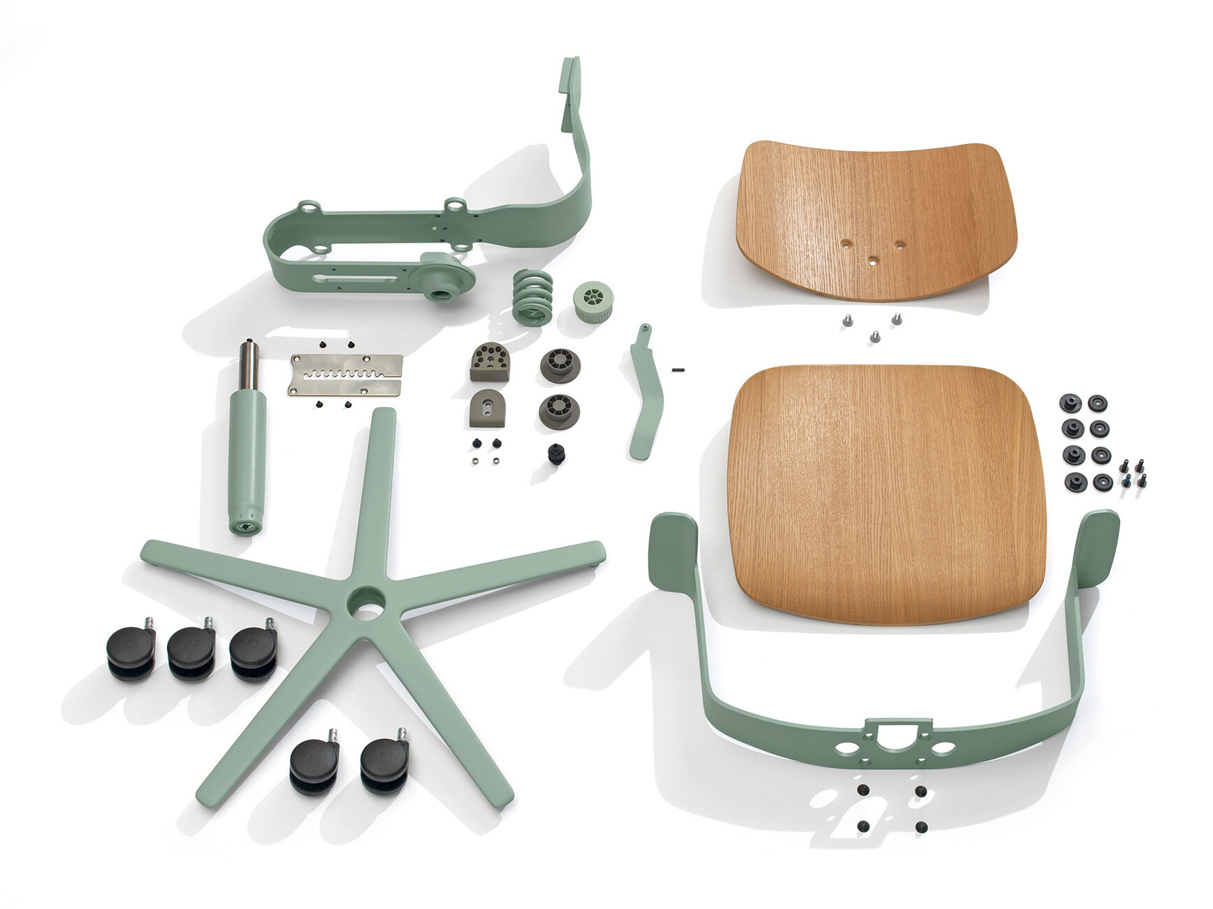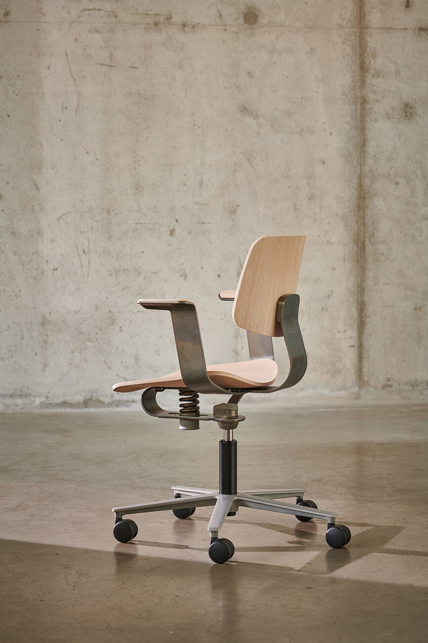 Wie man den Archetyp des Drehstuhls für die Gegenwart weiterdenkt, zeigt aktuell Wilkhahn, denn die Gestaltung des "WiChair" ist auf das Wesentliche reduziert: Ein Gestell aus recycelbarem Stahl, ein Fußkreuz aus recyceltem Aluminium, Sitz- und Rückenschalen aus FSC-zertifiziertem Formholz. Mit maximal elf Schrauben versehen, kann jedes Einzelteil bei Bedarf ausgetauscht werden, die Armlehnen sind optional. Seit der Gründung im Jahr 1907 versteht sich Wilkhahn als Gegenmodell zur Wegwerfgesellschaft und setzt konsequent auf Langlebigkeit wie Reparaturfähigkeit der Büromöbel. Die neue Entwicklung steht so in einer langen Reihe von nachhaltigen Ideen, die dazu beigetragen haben, dass das Unternehmen aus Niedersachsen heute ein internationales Renommee hat.