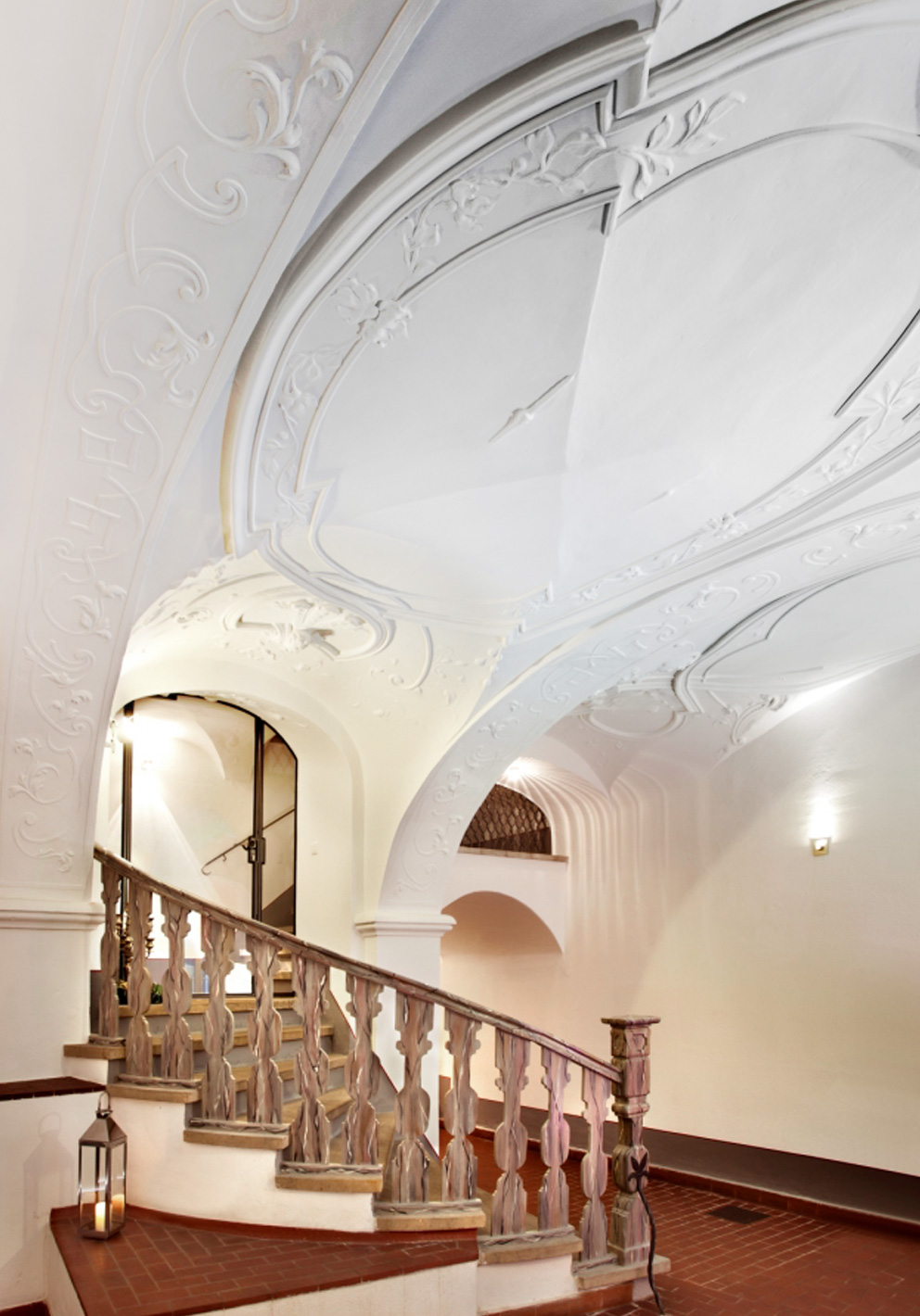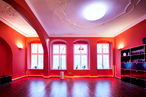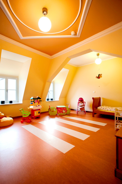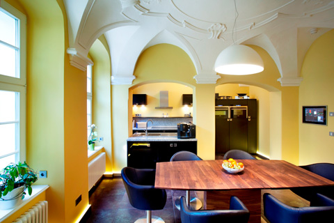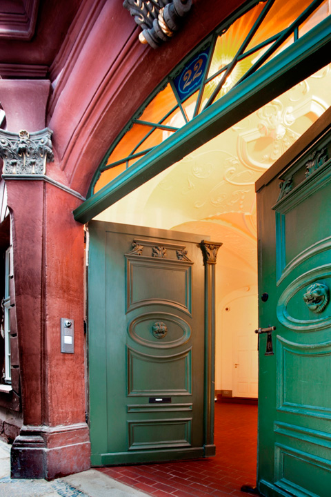 Die Familie ließ das Haus, das natürlich unter Denkmalschutz steht, fachgerecht sanieren. Dabei kamen mehrere Stuckdecken zum Vorschein und wurden in mühevoller Handarbeit restauriert. Diese barocken Stuckdecken und das Gewölbe prägen stark den Charakter der Räume, die dennoch großzügig geschnitten sind und modern wirken. Für die Farbgebung der Räume ließen sich die Bauherren von den farbigen Vorbildern im Görlitzer Barockmuseum inspirieren und wählten ein kräftiges Gelb für die Küche, ein Rot für Flur und Wohnzimmer sowie ein kühleres Grün für das Arbeitszimmer.