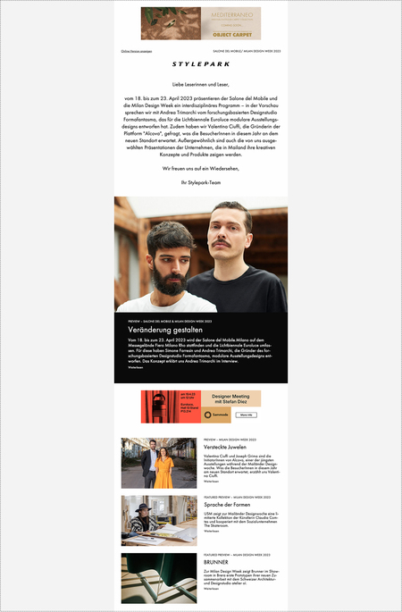 Stylepark offers an exclusive online advertising platform, reaching an annual audience of approximately 3.2 million users on the website and engaging with the 120,000 subscribers of our weekly newsletter through online advertisements.