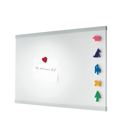 Material: metal sheet painted in epoxy resin. Frame in standard injection-moulded ABS medium grey. Supplied with 6 shapes in ABS, including hidden magnets (red heart, green arrow, violet dog, pink piglet, blue chair, yellow “X”).