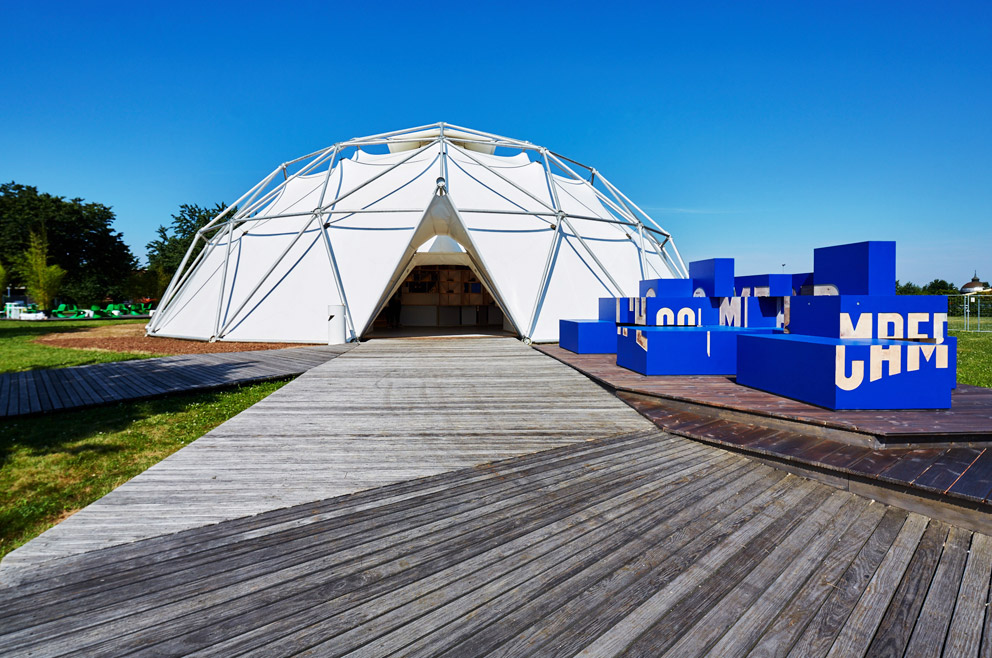 If you want to attract customers to your store nowadays you definitely need to walk that extra mile. By installing free Wifi, for example, along with charging points for people’s smart electronic devices. Such services, so the hope, will prompt visitors to the Vitra Campus in Weil am Rhein to set foot in Camper’s new pop-up store there. Take a rest on a blue seating sculpture in front of the main entrance, spend a while surfing and get your smartphone powered up again. Thus refreshed and recharged, you are ready to buckle up and enjoy the branding extravaganza that takes the shape of a geodesic dome à la Buckminster Fuller – and visit an exhibition, open-air museum and showroom all rolled into one.