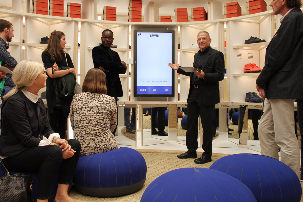 Those wishing to find out even more about the shoes can do so at the pop-up store. Some of the items on display have been fitted with an RFID chip and present the facts about themselves on a monitor if placed on a designated surface on the shelf. In addition, customers keen on precision can have their feet digitally measured. The advantage: They will be advised on models that are optimally suited to their feet’s anatomy. Plus the computer is happy to toe the line should the sales expert feel the need for added assistance. Customers can have their personal data stored on a card and online in their personal Camper account and retrieve it on their next shopping trip. In addition, via large touchscreens you can connect to the entire footwear range on the Net, including full information on the models, sizes and colors available. “The reason,” explains Camper CEO Miguel Fluxá, “is that no Camper store is able to have all 700 models readily at hand.” Introducing the possibility of online shopping in stationary trading.