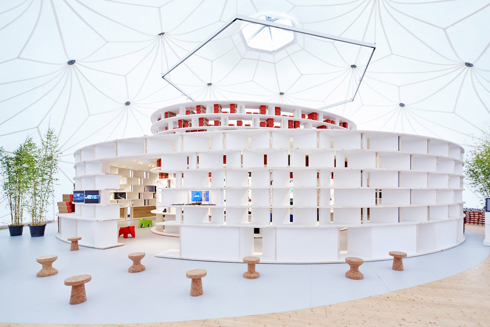 At first glance, the pop-up store on the Vitra Campus, designed by Berlin architect Diébédo Francis Kéré, looks rather simple; on closer inspection, it reveals itself to be quite an exciting experiment destined to interlace the advantages of both the online and offline worlds. The aim is to create a fresh and exciting shopping experience. Two elliptical rings made of shelves that act as dividers make up two spaces: The one in the center of the domed structure is capacious and bright. A mat made of woven seaweed (in Majorca they are called “Esparto”) and cobalt blue seat cushions named “Mochi” (designed by Hella Jongerius for Vitra) lend the space a relaxed and unpretentious feel. The idea, the architect explains, is to get prospective customers chatting with other people while everyone has fun trying on the shoes presented on the shelves as if they were so many well-heeled collector’s items.