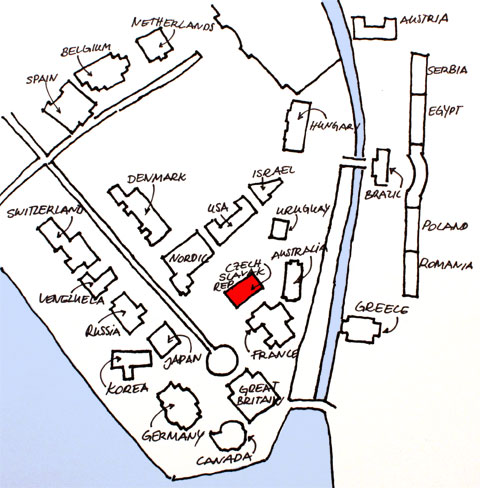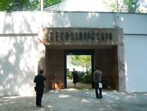 The Czech and Slovak Pavilion as created by Roman is an irritating loop. With his installation realized in situ he not only re-unites the officially separate Czech and Slovak Republics (i.e., represents a configuration that does not exist) but also simply and effectively makes the inside indistinguishable from the outside of the pavilion, as (in the absence of doors) more or less the same park exists on the inside as does on the outside. You enter the pavilion and yet remain outside; amidst the bushes and trees, you feel as if you were wandering along the paths of the Giardini - and yet you are in the arbor of art. You look at real plants and yet they seem also to be copies or fakes of themselves.