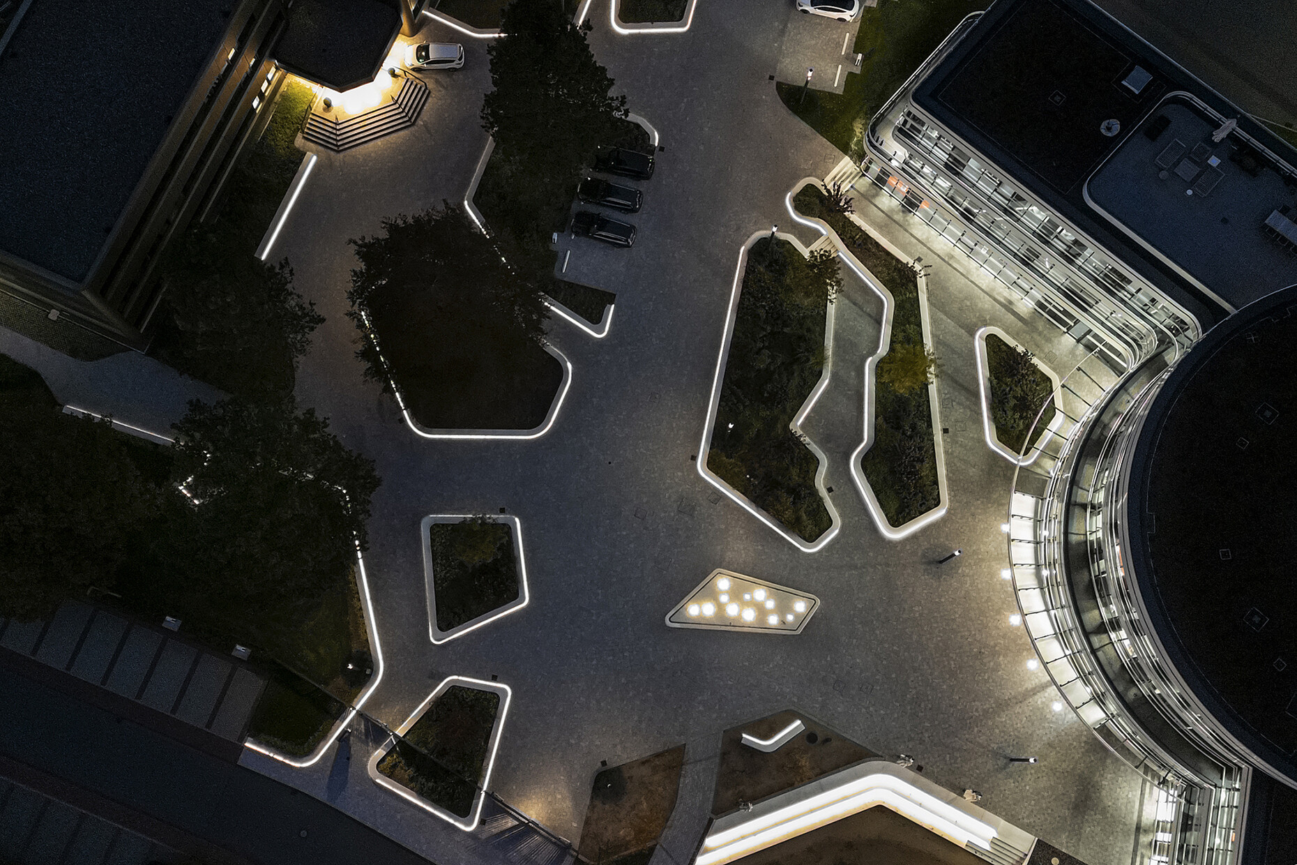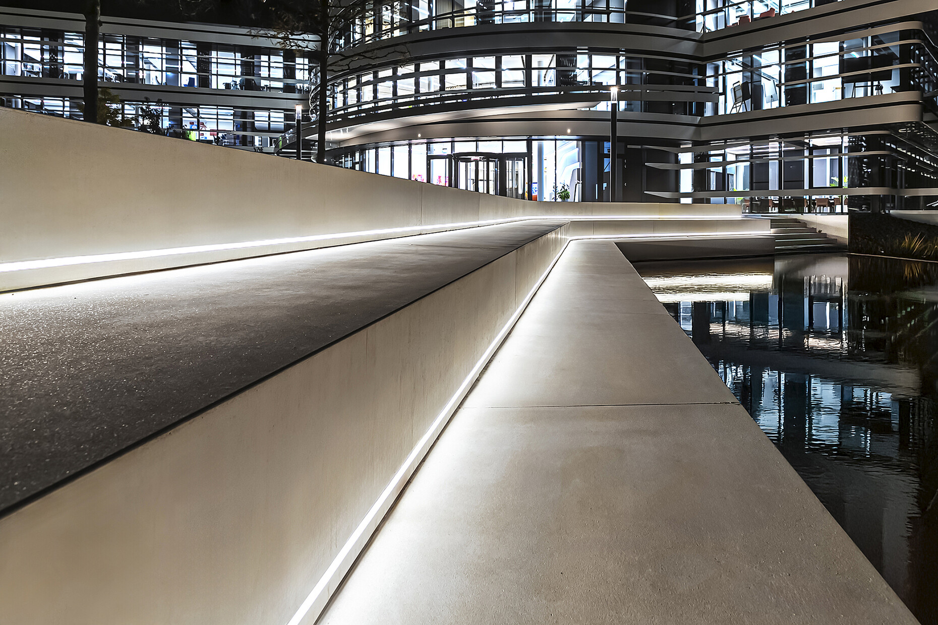 The pleasantly homogeneous and glare-free light provides orientation, guides visitors safely to the entrance of the building and also sets the scene for the architecture: The LED light lines follow the borders of the flower beds and gently trace the structure of the square. At the same time, they lend the square a special elegance, especially late at night. Discreet but effective, the lighting also contributes to an increased sense of security – as at the pond, whose seating steps are perfectly emphasised by the lighting.