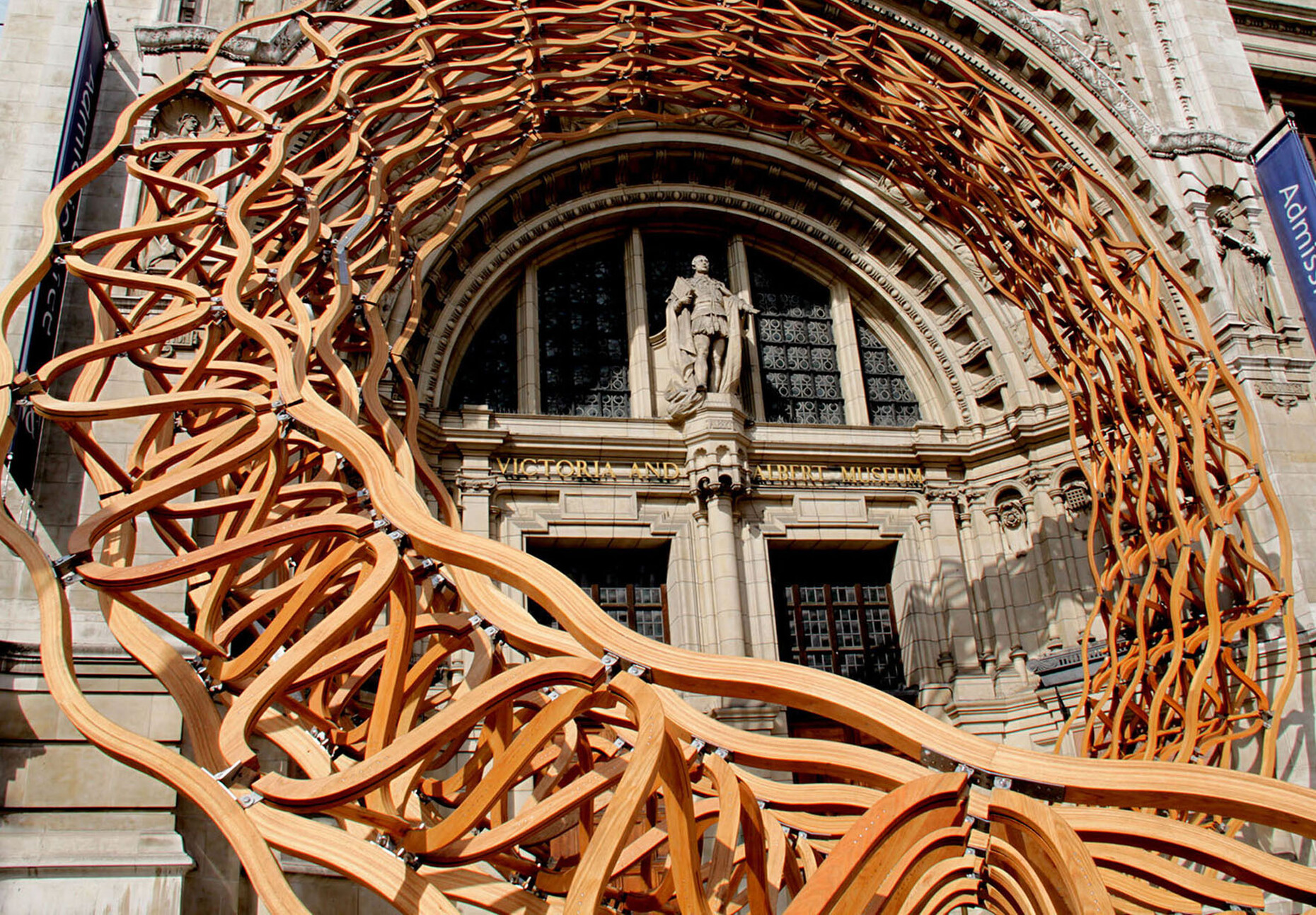 Numerous design and architectural projects, which are presented in a richly illustrated manner, provide a comprehensive overall picture of the individual varieties: Whether the "Fugu" seating group, designed in 2019 by Jasper Morrison Studio for Tristram Hunt, or the "Timber Wave" sculpture (2011) by Amanda Levete Architects situated at the main entrance to the V&A Museum or the European headquarters of Bloomberg in the City of London, designed by Foster + Partners – the special spatial character, in this case of red oak, is conveyed via the impressive range of projects that have already been realised.
