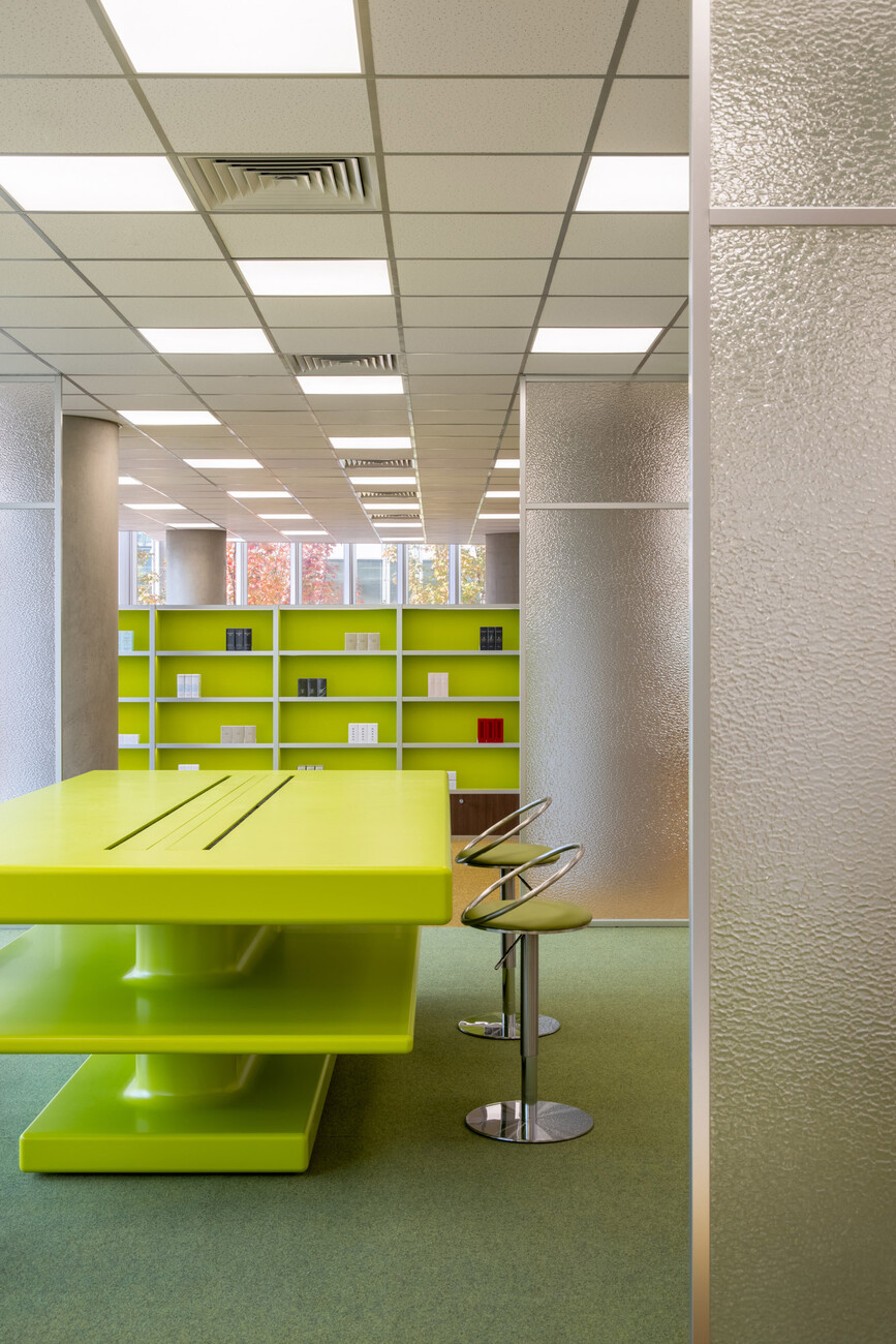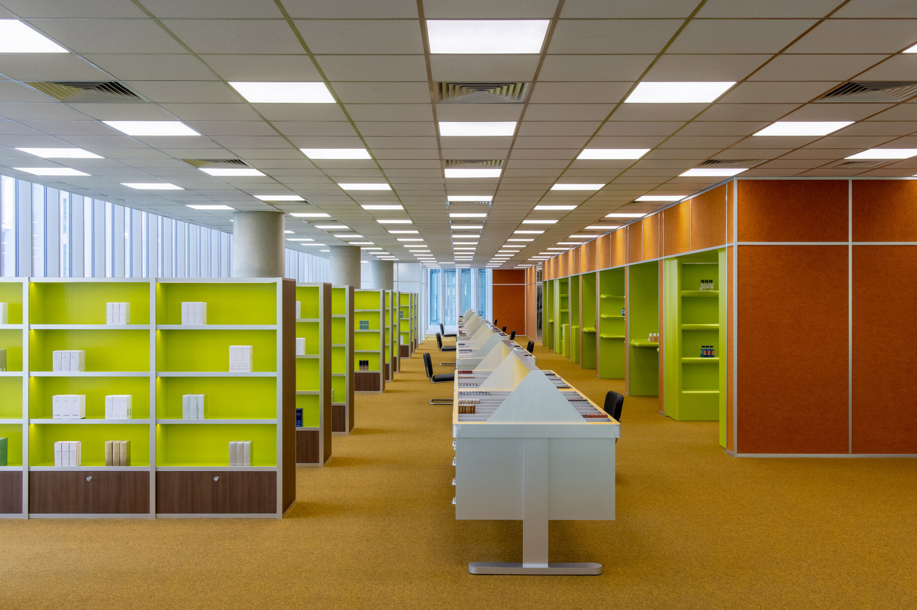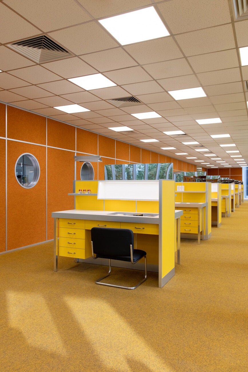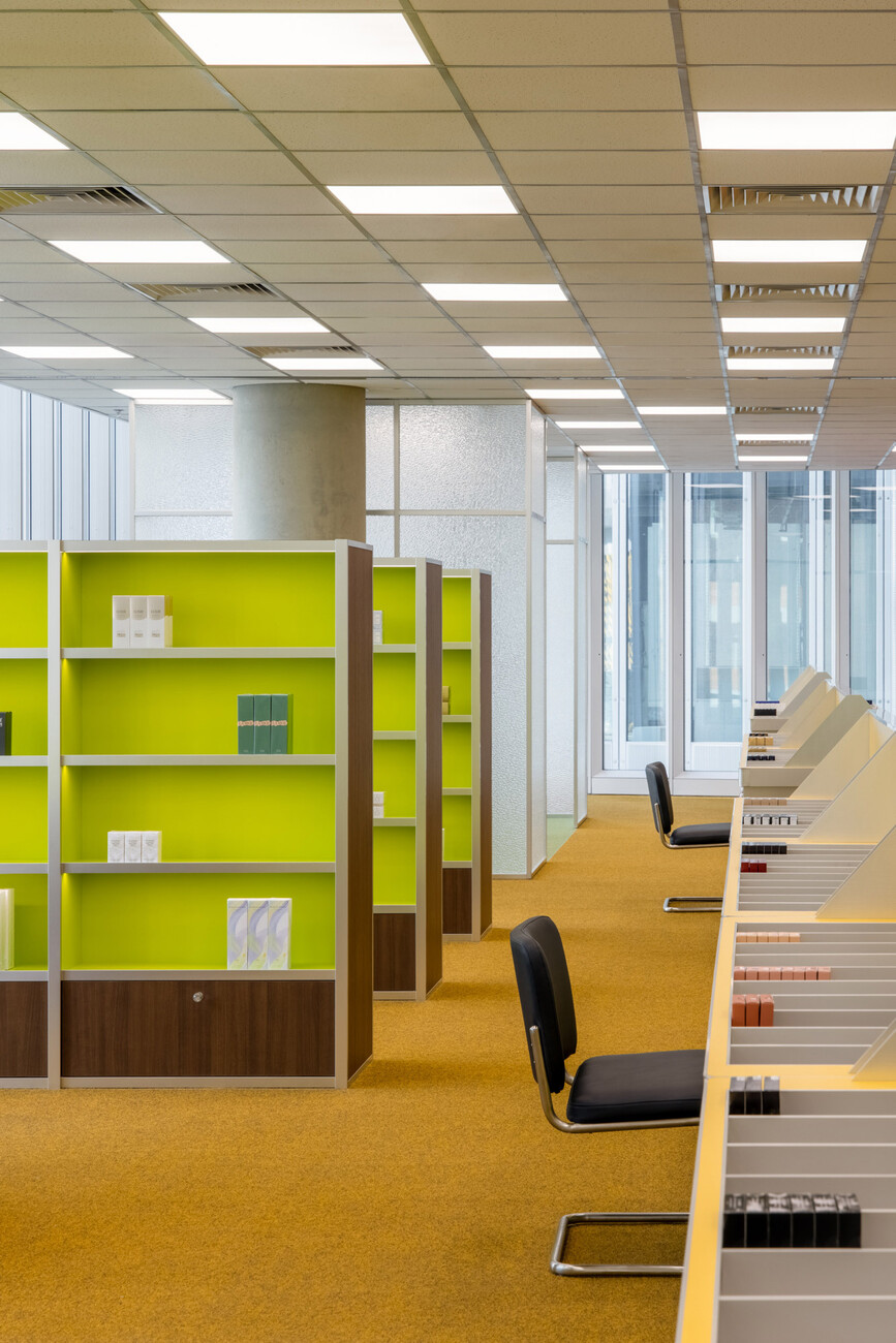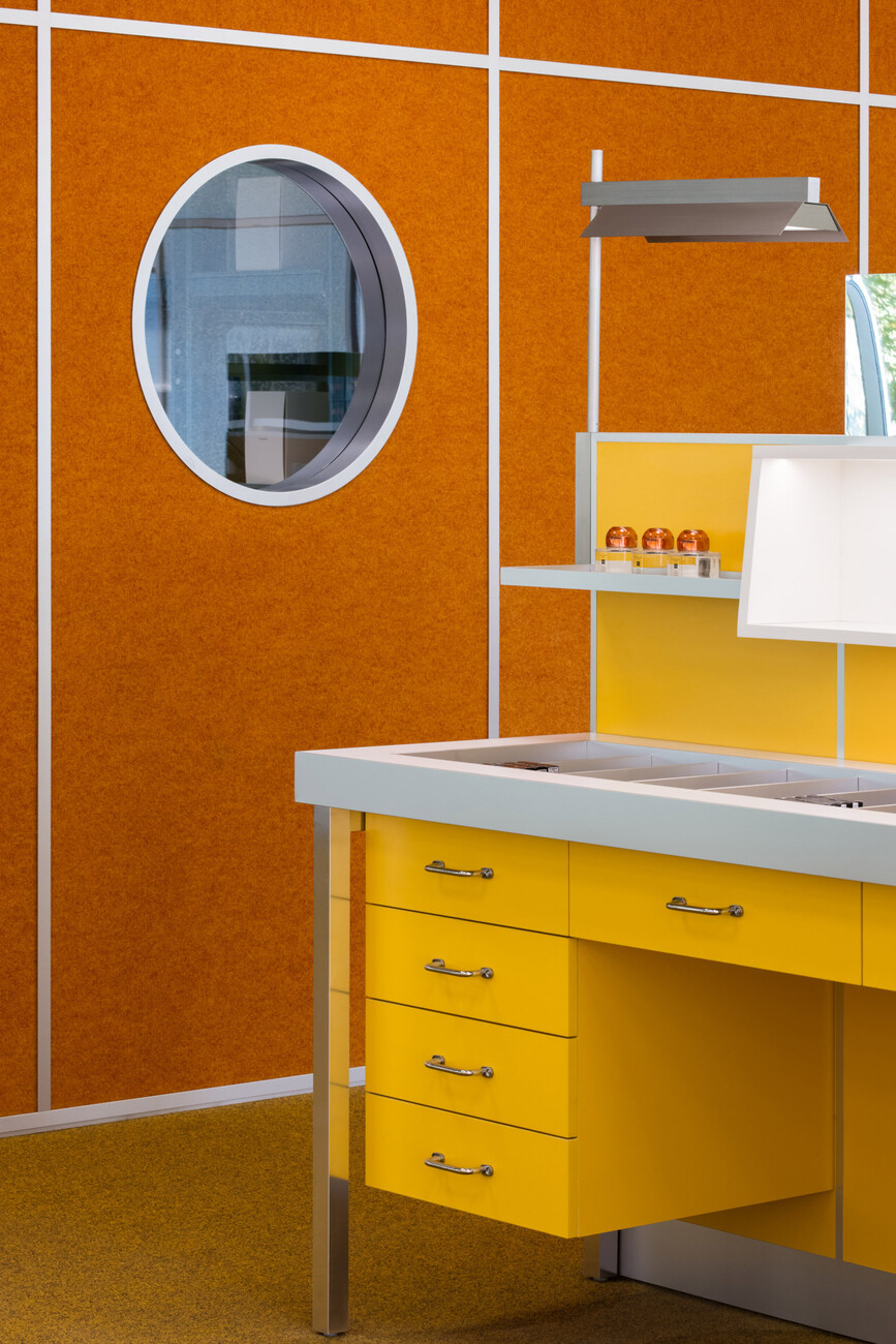 Through the interplay of colour and structure, AIM Architecture has succeeded perfectly in capturing the atmosphere of an open-plan office in the 1970s, so that in your mind you can hear the typewriters clacking and the analogue telephones ringing – a look back at a decade in which the mobile phone had only just been invented and was years away from its market launch, just like the personal computer or the internet. Addresses were still laboriously searched for in thick telephone directories or crammed Rolodexes, mistakes in documents were corrected with Tipp-Ex, the stamp holder was an important utensil on every desk and the calculator a futuristic device. Shopping here truly feels like travelling back in time – except that the products on offer are from the present and there is certainly a modern card reader hidden behind the walnut-coloured wooden panelling of the checkout counter.