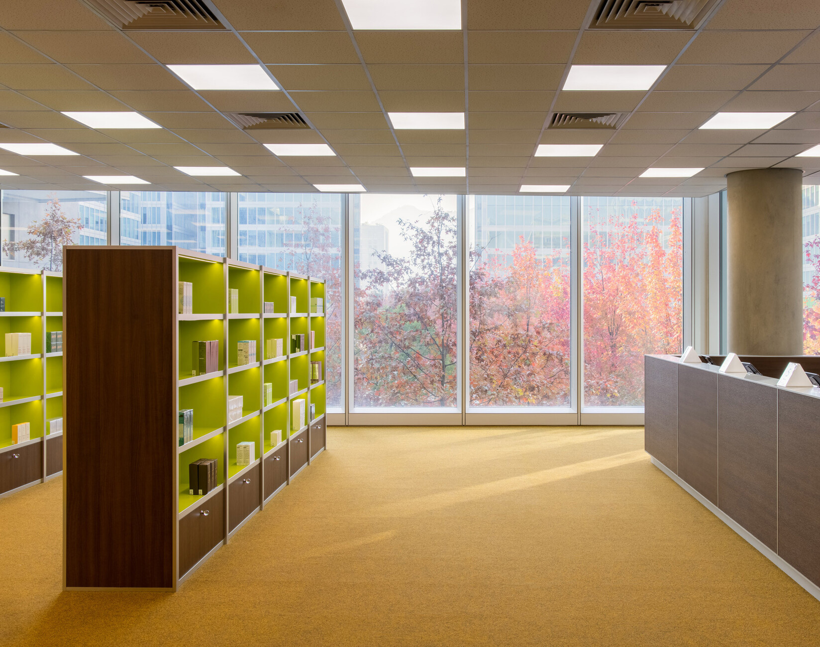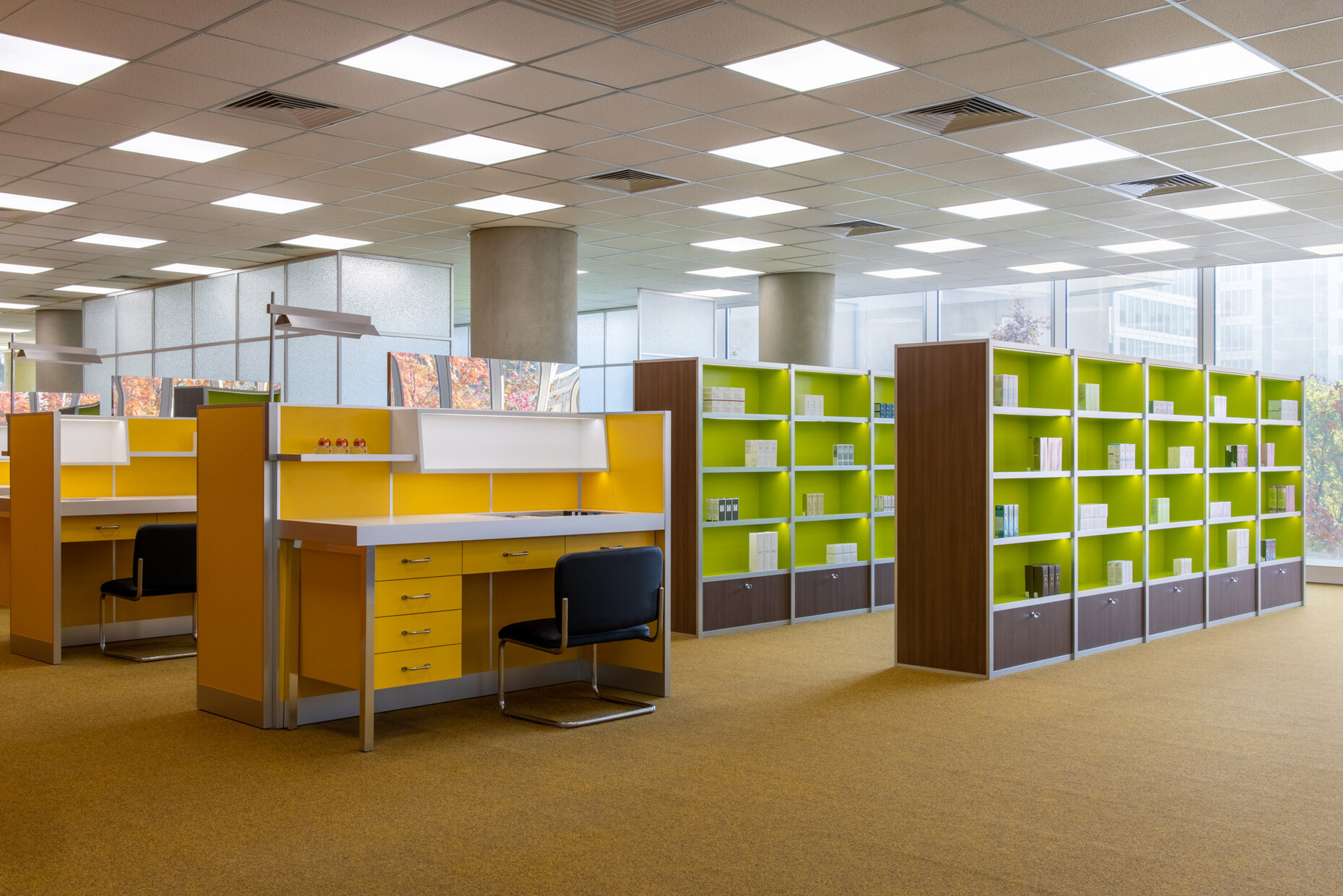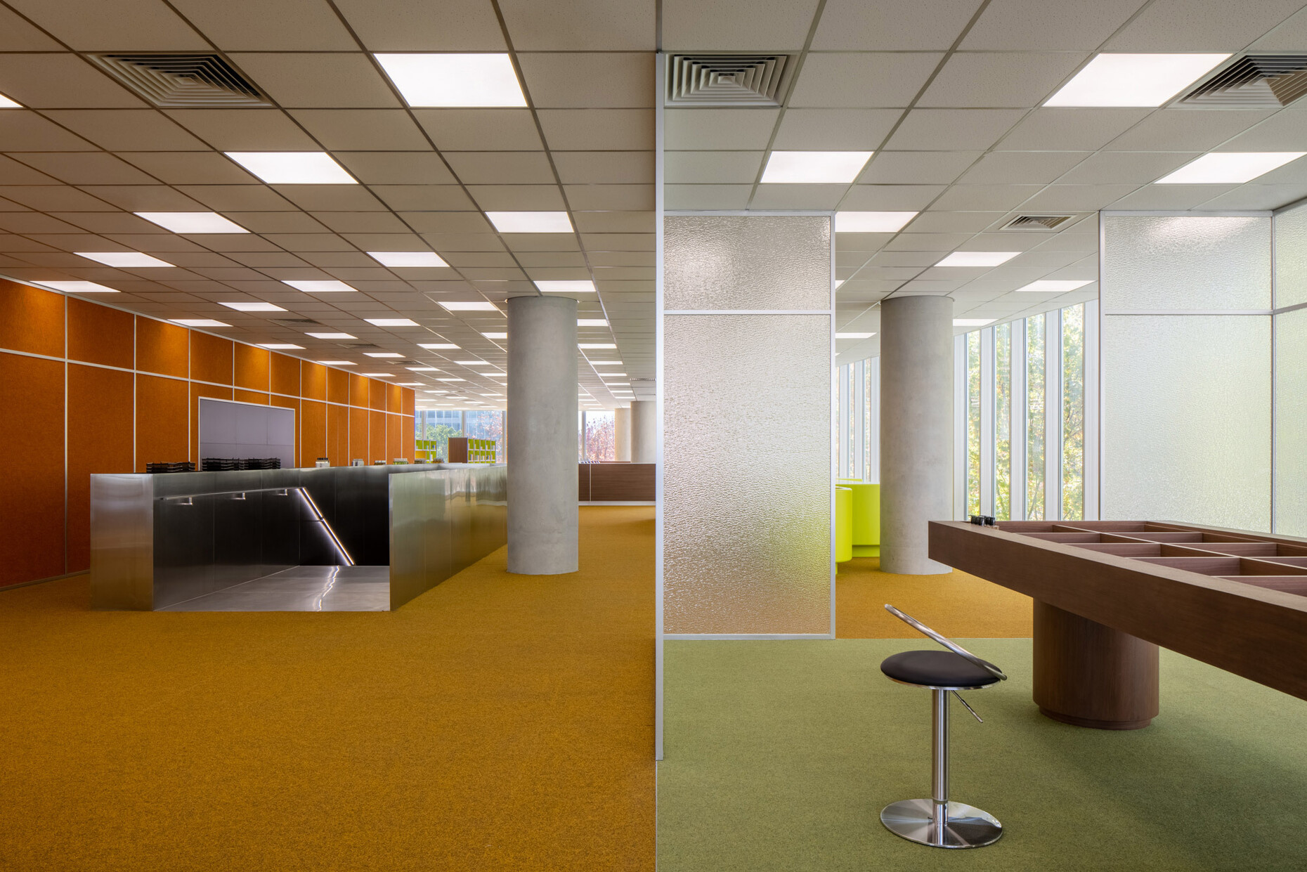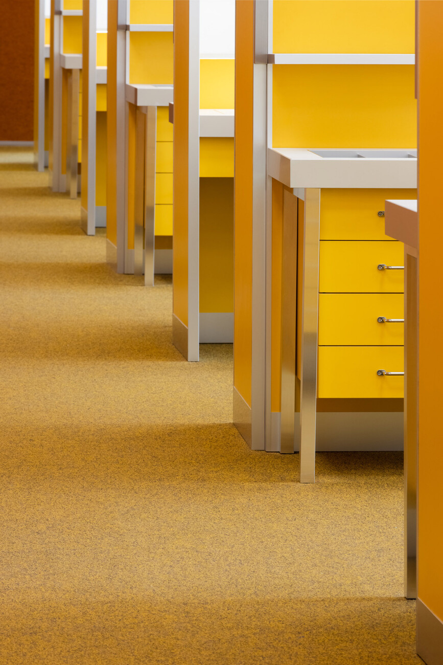 Through the interplay of colour and structure, AIM Architecture has succeeded perfectly in capturing the atmosphere of an open-plan office in the 1970s, so that in your mind you can hear the typewriters clacking and the analogue telephones ringing – a look back at a decade in which the mobile phone had only just been invented and was years away from its market launch, just like the personal computer or the internet. Addresses were still laboriously searched for in thick telephone directories or crammed Rolodexes, mistakes in documents were corrected with Tipp-Ex, the stamp holder was an important utensil on every desk and the calculator a futuristic device. Shopping here truly feels like travelling back in time – except that the products on offer are from the present and there is certainly a modern card reader hidden behind the walnut-coloured wooden panelling of the checkout counter.
