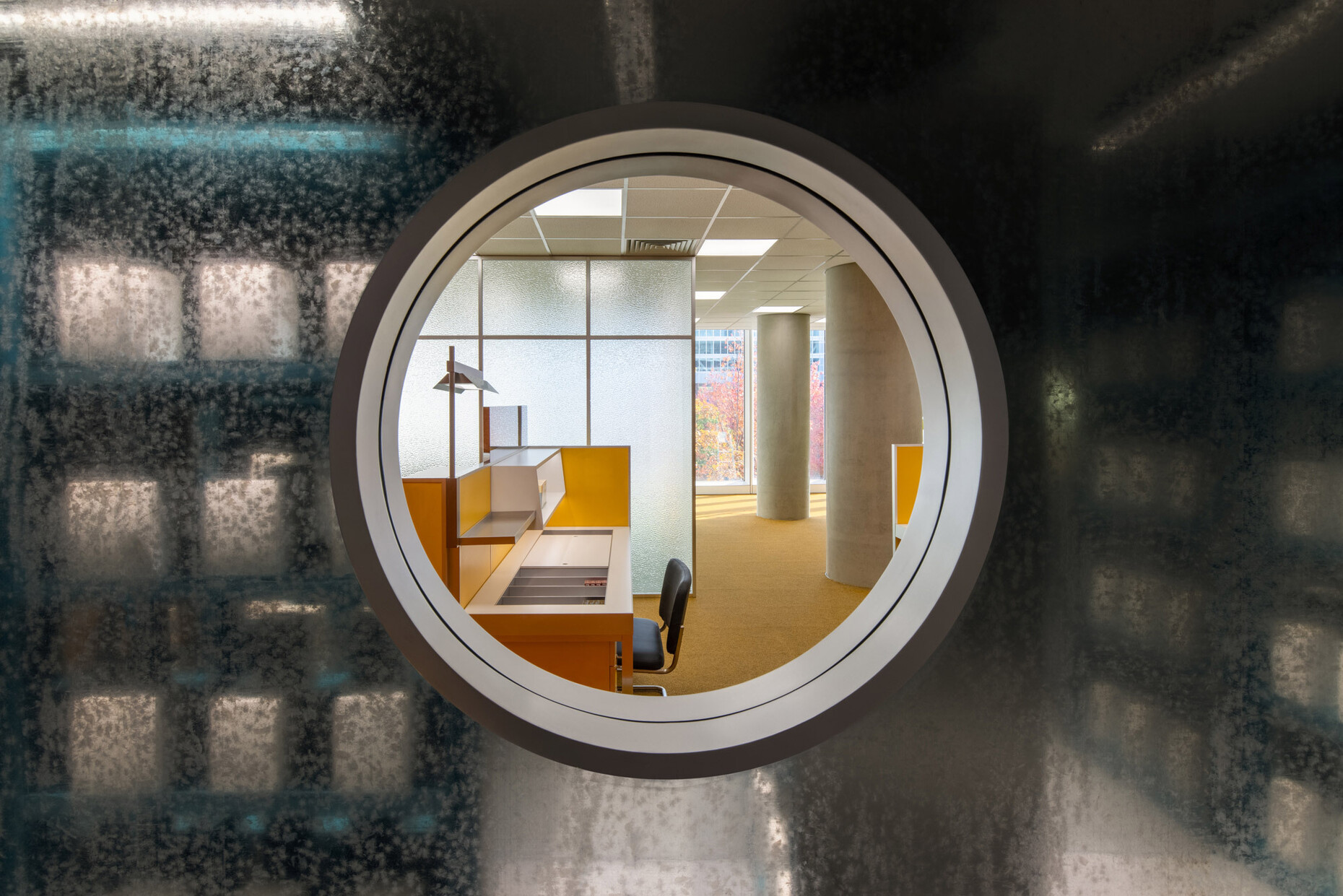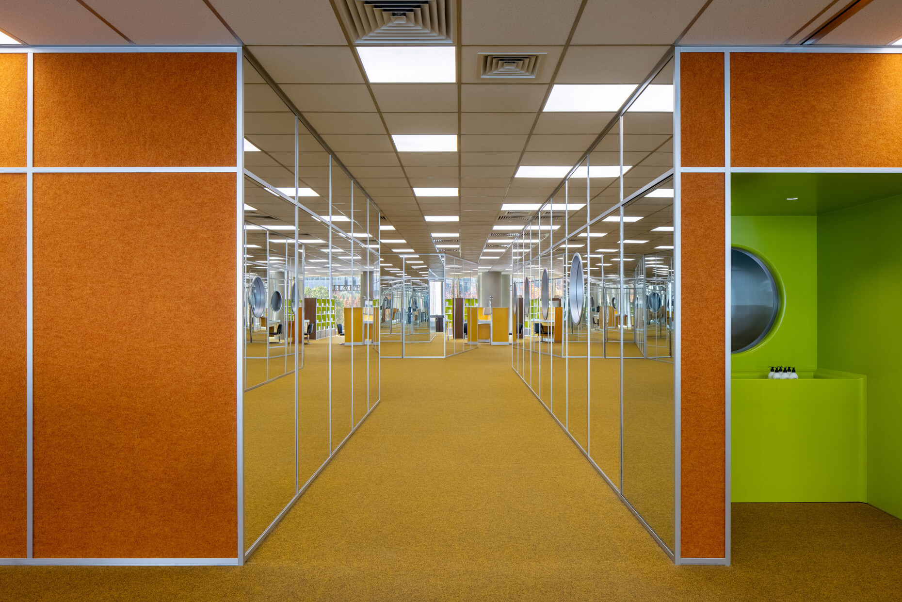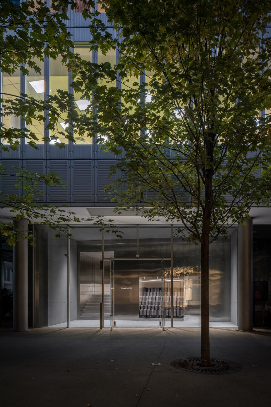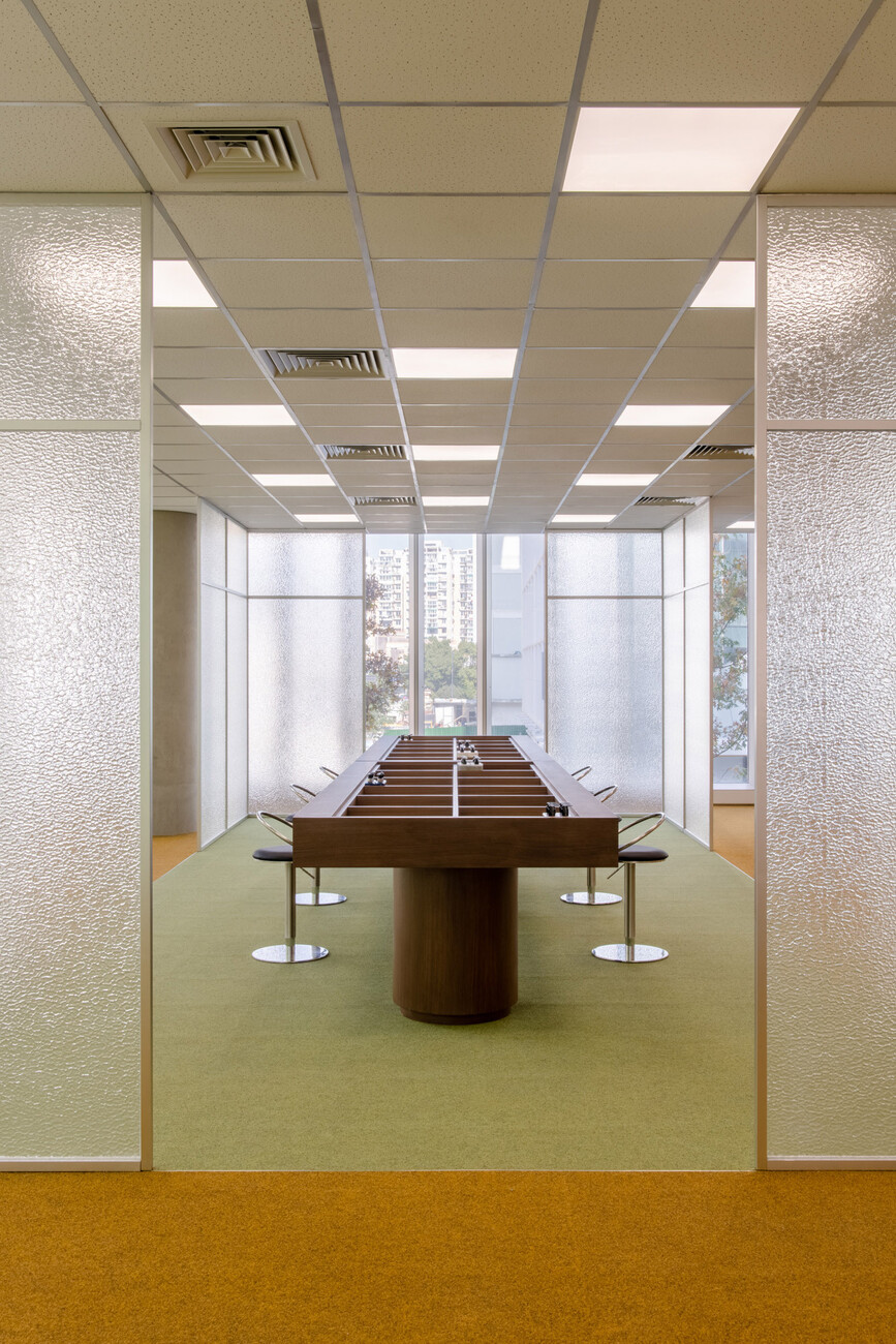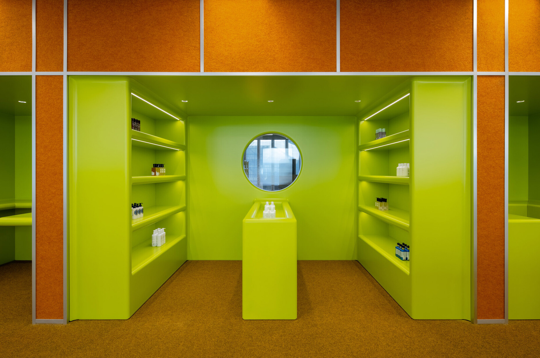 For the location in the OōEli complex of the Chinese megacity Hangzhou, the team from AIM Architecture took the aesthetics of an office from the 1970s as a creative starting point: fittingly located on the second floor of an office building, a landscape in mustard yellow, rust red, chocolate brown and cognac now opens up on 1,382 square metres: placed on the continuous display goods, the desks converted into make-up stations are lined up one behind the other and borrowed from the cubicle system of workplace arrangement often used at the time. Walls of ornamental glass separate a communal zone, while the structuring colour surfaces are broken up by linear elements of aluminium. Dark wood tables alternate with lime green shelving systems complete with rounded corners. Thanks to suspended ceilings in the same colour, small presentation bays are created that appear to be made of one piece. Narrow corridor structures, their alignment reinforced by floor-to-ceiling mirror surfaces, lead to wall coverings made of carpet. Clear, industrial-looking lines and round columns of concrete are contrasted with porthole-shaped recesses. Through the latter, one can look into the internal transit warehouse and thus look from the past into the present. For the sake of aesthetics, the interior designers have dispensed with an experimental patterning of the textile surfaces that was popular in the 1970s. The colour-intensive retro aesthetics convey the spirit of the time, but do not distract customers too much from the sales offer with visual stimuli.