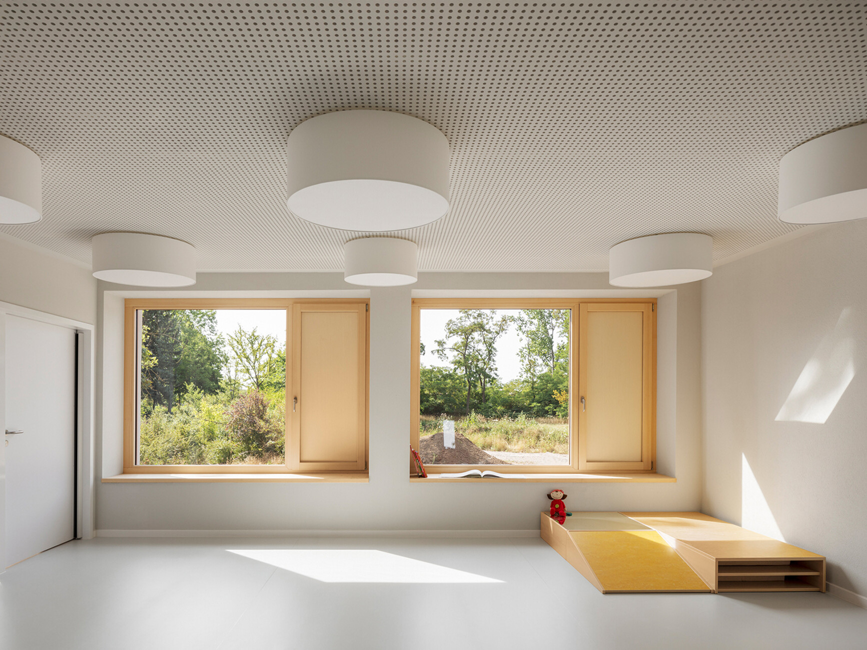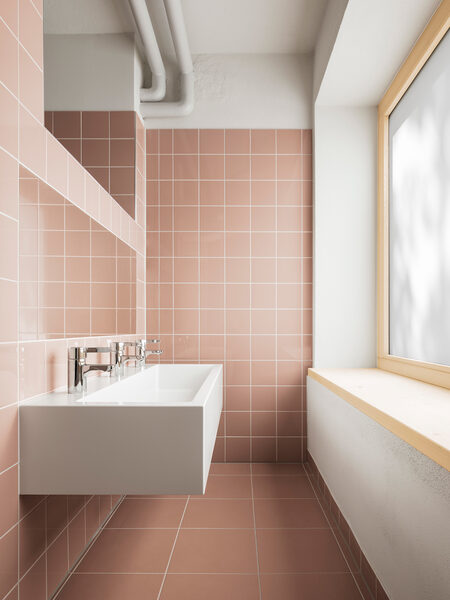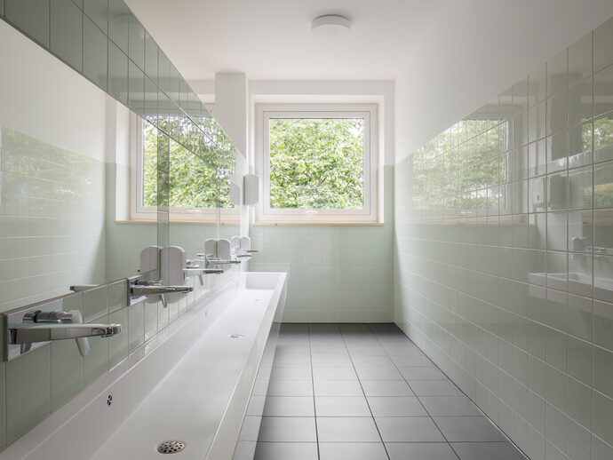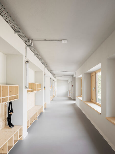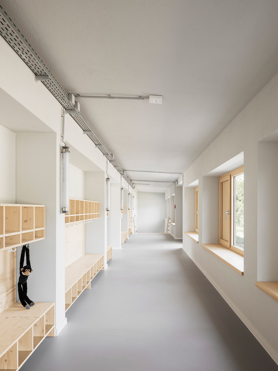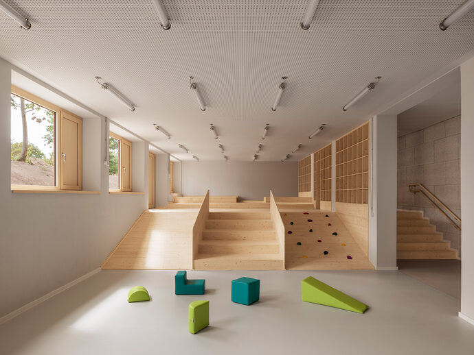 The project appears to be a strikingly logical transformation. The architect takes up the structure of the building, parts of which extend one storey into the ground, rewrites it and thus establishes a sequence of rooms that works for the needs of a nursery school, partly because she adopts the two-storey layout that results inside. The light-coloured wood of the new fixtures for cloakrooms, shelves, slides, stairs and platforms creates an interior that is both robust and friendly. At the same time, the rooms still have a certain roughness about them; pipes laid on the walls and lights originating from industrial construction are subtle reminders of the building's original technical purpose, but clearly do not interfere with its current function. The light apricot colour of the new large windows with their opening flaps for ventilation, which characterises the façade after the intervention, is echoed in the interior in the tile colour of the bathrooms, thus creating a subtle formal aesthetic relationship between the interior and exterior.
