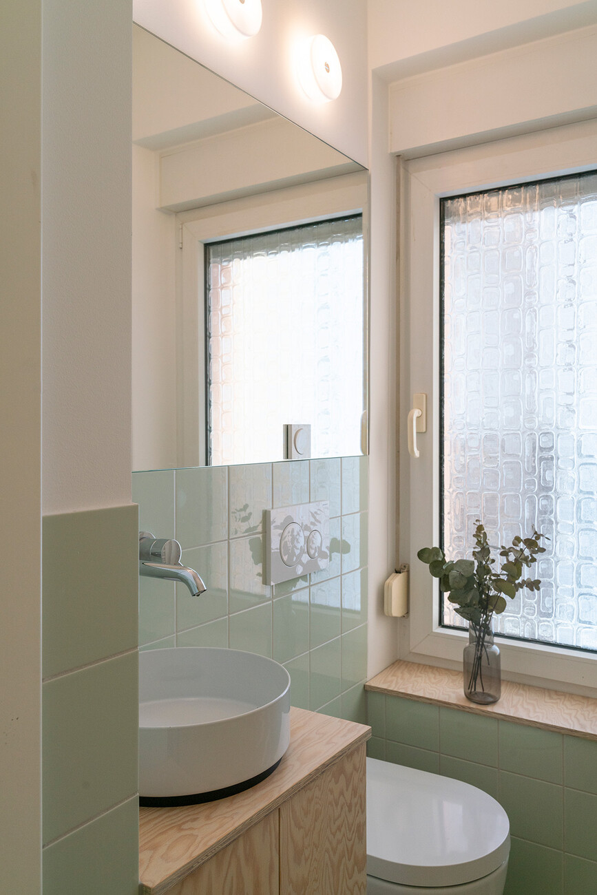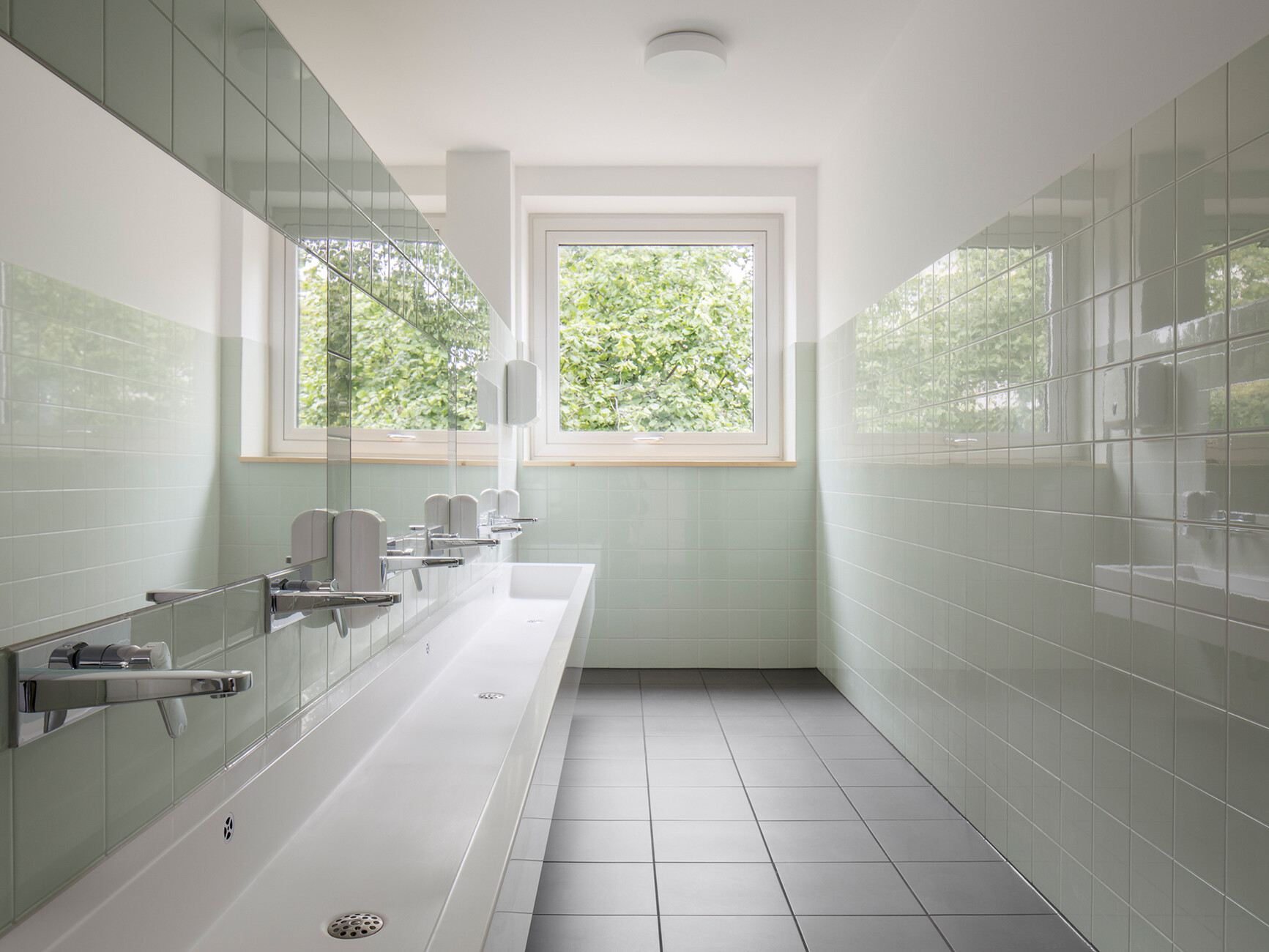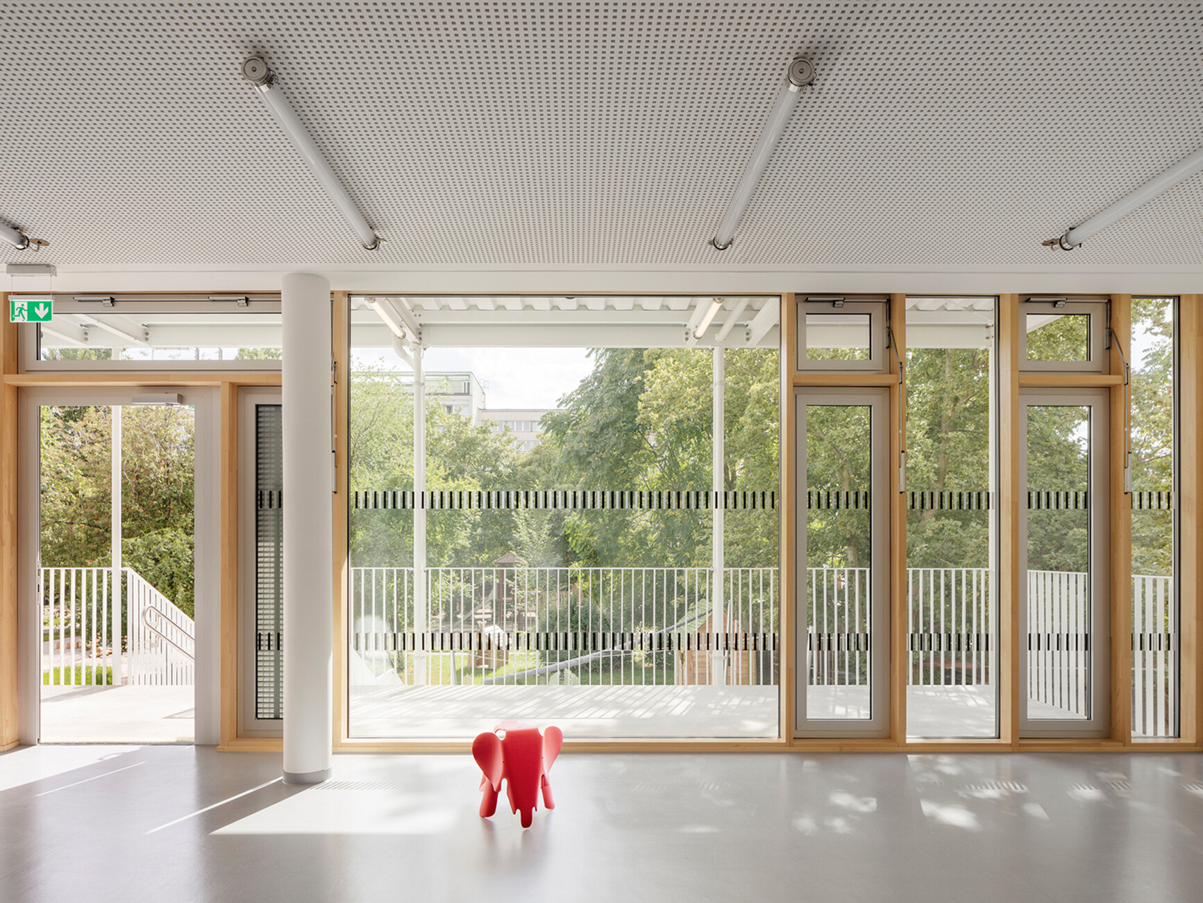 The project appears to be a strikingly logical transformation. The architect takes up the structure of the building, parts of which extend one storey into the ground, rewrites it and thus establishes a sequence of rooms that works for the needs of a nursery school, partly because she adopts the two-storey layout that results inside. The light-coloured wood of the new fixtures for cloakrooms, shelves, slides, stairs and platforms creates an interior that is both robust and friendly. At the same time, the rooms still have a certain roughness about them; pipes laid on the walls and lights originating from industrial construction are subtle reminders of the building's original technical purpose, but clearly do not interfere with its current function. The light apricot colour of the new large windows with their opening flaps for ventilation, which characterises the façade after the intervention, is echoed in the interior in the tile colour of the bathrooms, thus creating a subtle formal aesthetic relationship between the interior and exterior.