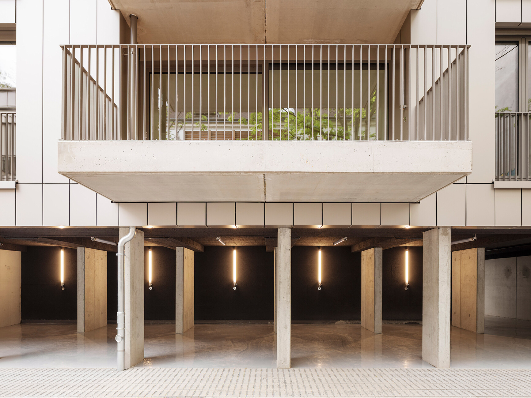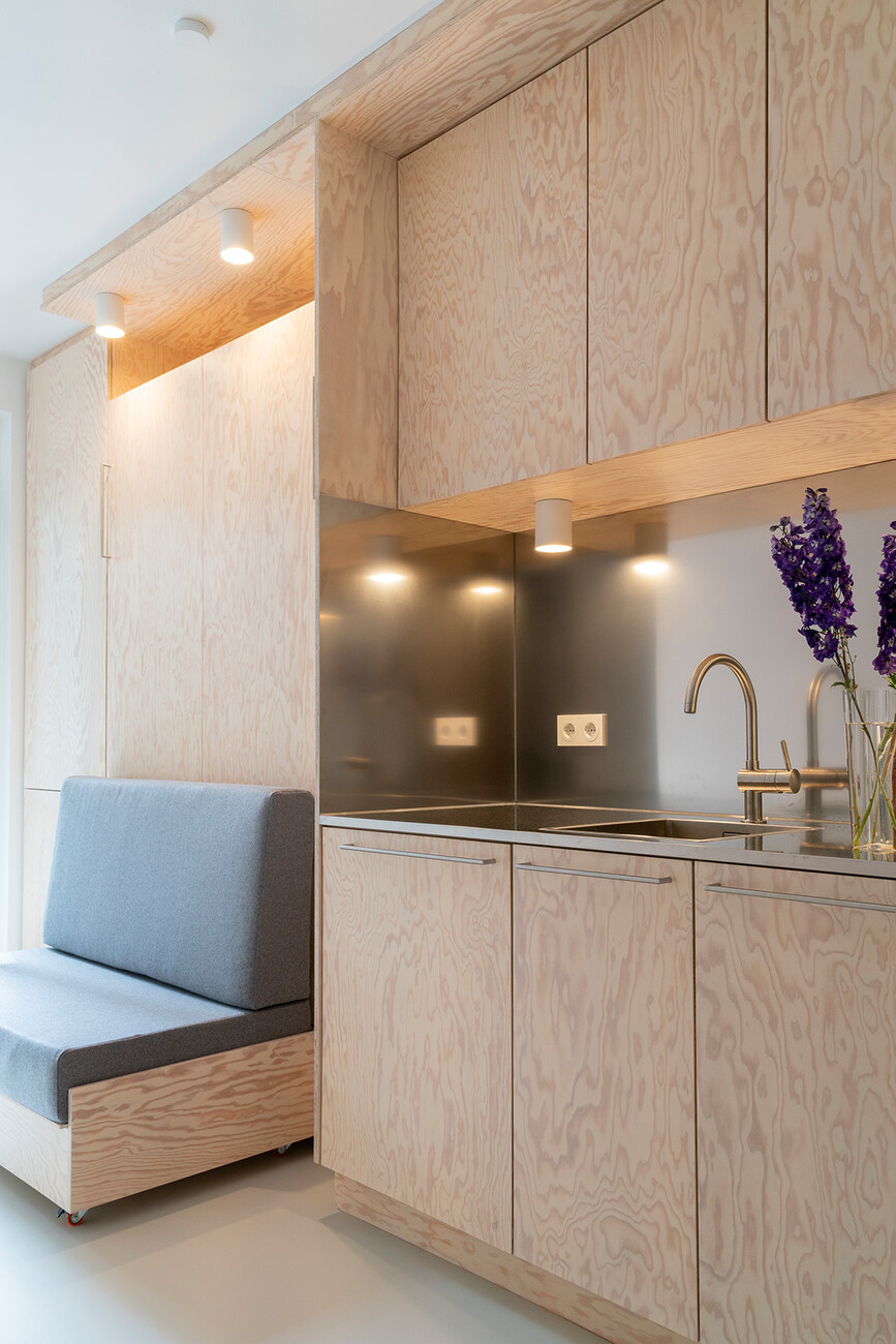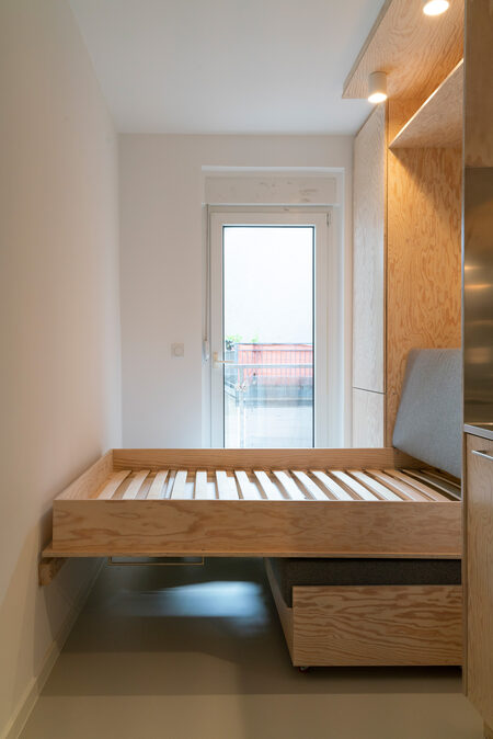 After collaborating with Marc Mimram and Dominique Perrault, Aline Hielscher began working independently in Paris. Her first small apartment renovations already revealed a lot about her holistic design approach. Hielscher created an impressively minimalist micro-apartment in a rear courtyard in the 18th arrondissement. The immense purchase price of the apartment alone exceeded the budget for the renovation work. The living space here, not far from Montmartre, measures just over 20 square metres in total. Hielscher developed a kind of early principle of sufficiency, whereby interventions were kept to a minimum and the benefits for living were maximised. A compact kitchen forms the spatial prelude, above which, accessed via a steep staircase, is the bed. Storage space is provided on the opposite wall of the single-sided room in a homogeneous, space-containing wall shell that stands in front of the existing wall like a second skin. This wall cupboard, in the truest sense of the word, also provides access to the small shower room. Everything here is reduced to a minimum, creating space that can be freely inhabited by the user. The interventions are as understated as the chosen design language, so that the focus is on living and not on the architecture that provides the space for it.