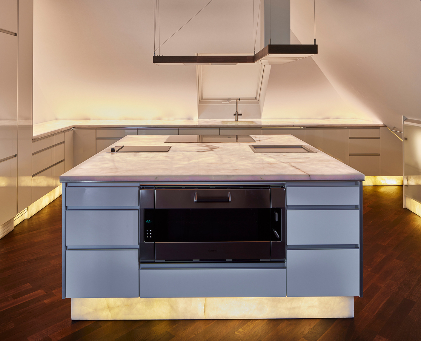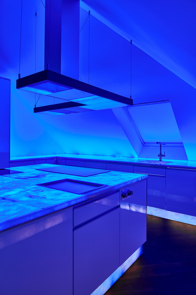 “Flächenlicht” is a prime example and can be used to clad not just walls, but also for ceilings, counter tops, pillars, or wainscotting. “Flächenlicht can be brought to bear in the form of our ‘Dot Injection Panel’ whenever you need to back-light large surfaces. If furniture, walls, wall cladding or other objects need to be highlighted by means of light hidden in the material then we custom-size the Flächenlicht accordingly. As a rule, the client wants to present selected high-grade materials and special surfaces by back-lighting them to great effect. For example, recently we deployed Flächenlicht for a panel made of Italian rock crystal in a luxurious kitchen. It looks extremely classy and imbues the room with a very special atmosphere,” says Carlo Fleischmann, Head of Project and Product Management at Ambright, describing the technical options and design scope.