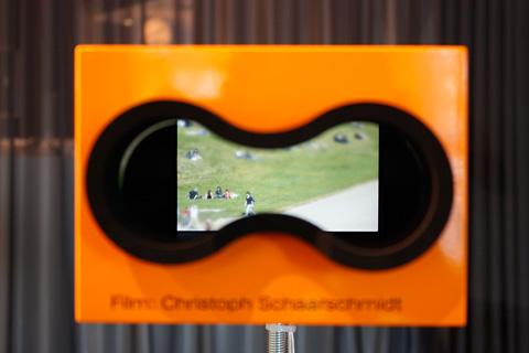 The Frankfurt-based office installed a total of seven so-called "loopers", telescopes that present street scenes from other cities in an endless filmed loop. KSP Jürgen Engel Architekten built a huge angel's trumpet that seemingly sucked the street space outside the window inside while freezing it in motion. Kontext Architektur came up with two automats that highlight dynamism and frozen movement, that characteristic of traffic lights, playfully referring viewers to the phases of waiting and movement. 3deluxe has built a black block or box with 78 cold cathode tubes at work illuminating it. Bernhardt + Partner designed a room full of tennis balls that adapt to the user's movements. And while touring the show, thanks to Planquadrat visitors can carry a drink around with them in a house that is reduced quite literally to a handy size.