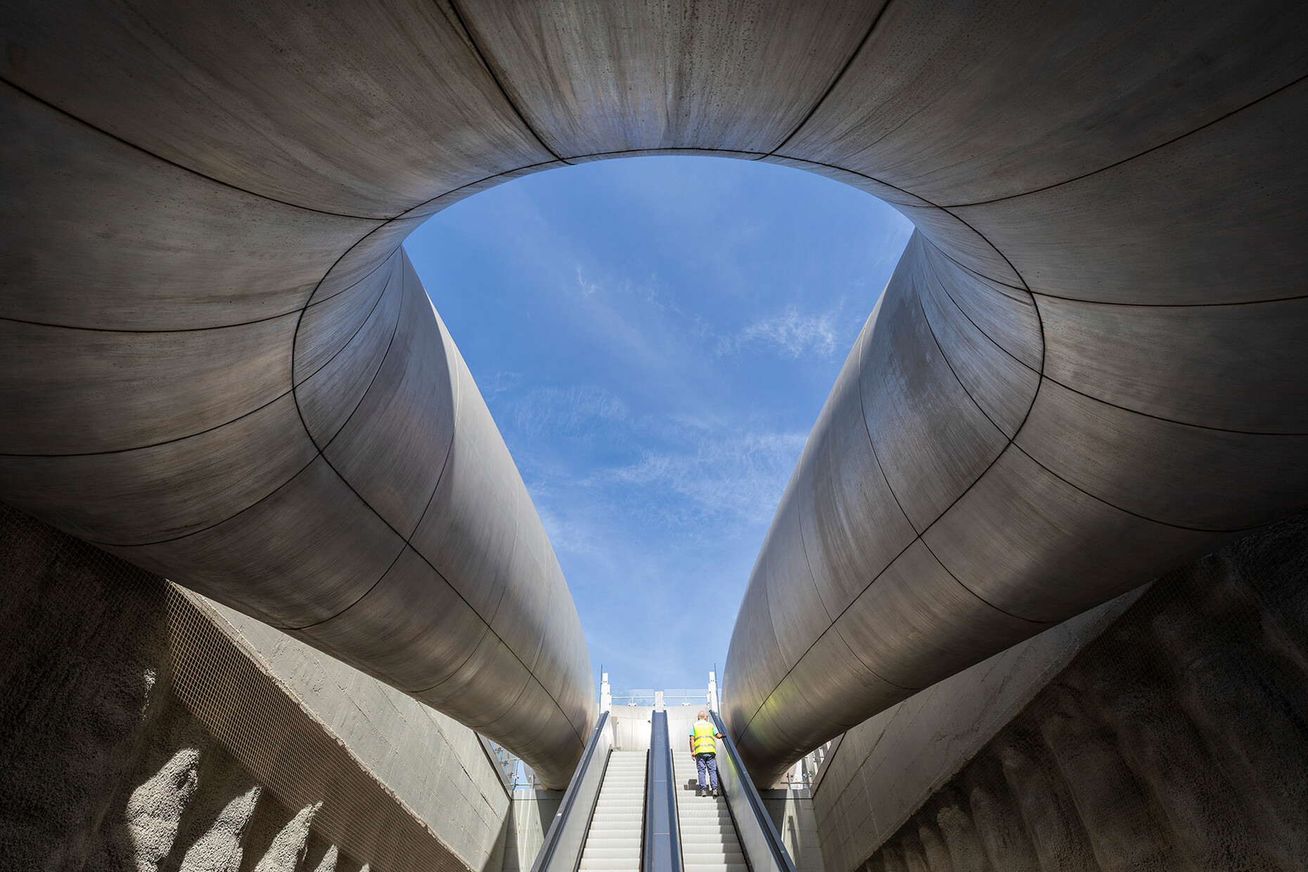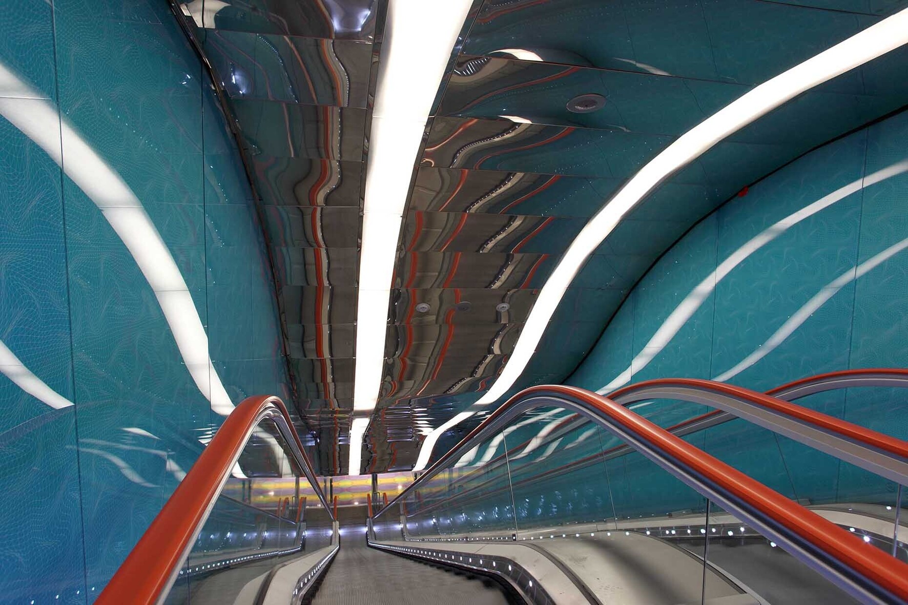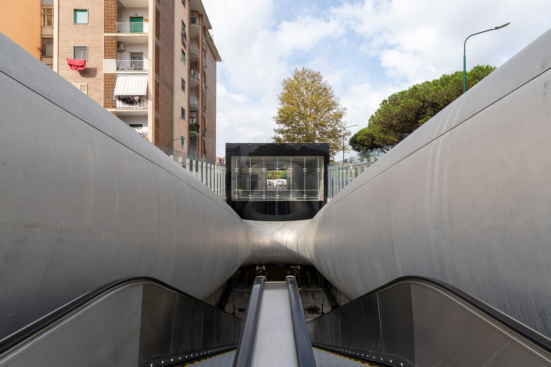 The Monte Sant'Angelo station on Line 7, designed by Anish Kapoor in collaboration with the architectural office Future Systems (Jan Kaplický and Amanda Levete), was recently opened. Kapoor created two sculptural entrances for it, one of which, made of Corten steel and called La Bocca (The Mouth), is reminiscent of a mixture of an organic throat and a giant croissant. The sculpture seems to suck travelers into the underworld. In this way, the artist references the volcanic landscape of Naples and Dante's Divine Comedy. Inside the station, parts of the tunnel walls were left raw and unfinished to preserve an authenticity appropriate to the location's depth.