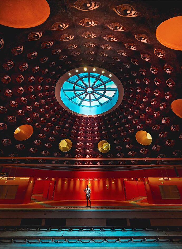 Since 1993, under the direction of Bonito Oliva, numerous works of art by over 80 renowned international artists have become part of the Neapolitan metro system. Bonito Oliva coordinated the collaboration between them and the architects involved, including such luminaries as Álvaro Siza, Gae Aulenti, Alessandro Mendini, Dominique Perrault, and Karim Rashid. Each station follows its own logic, often influenced by the specific history of the location. The Università station, designed by Karim Rashid, for example, translates questions of knowledge and language in the digital age into space and form, while the Duomo station, designed by Massimiliano Fuksas, integrates the archaeological finds of the foundations of a Roman temple from the first century AD and the remains of an ancient gymnasium.