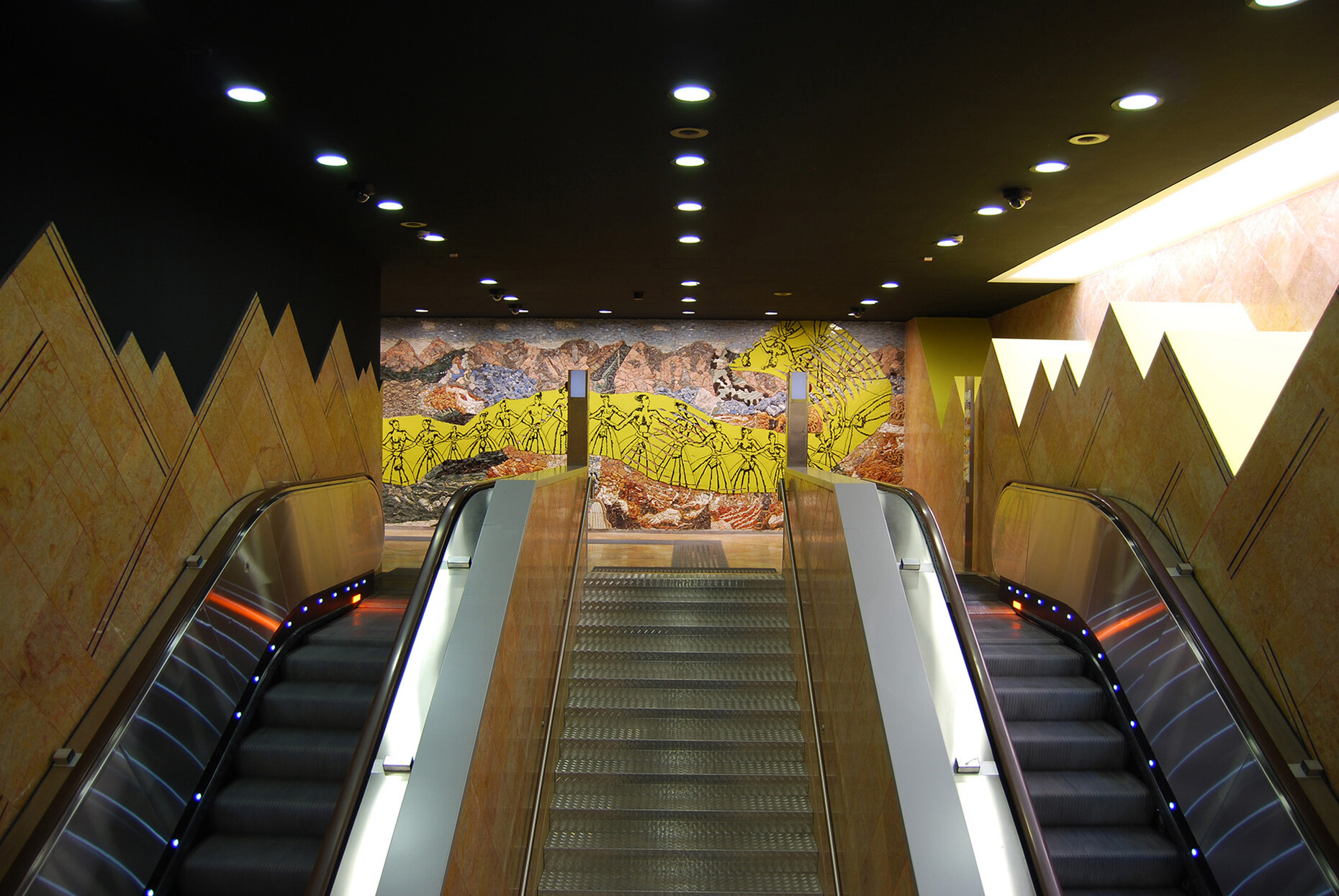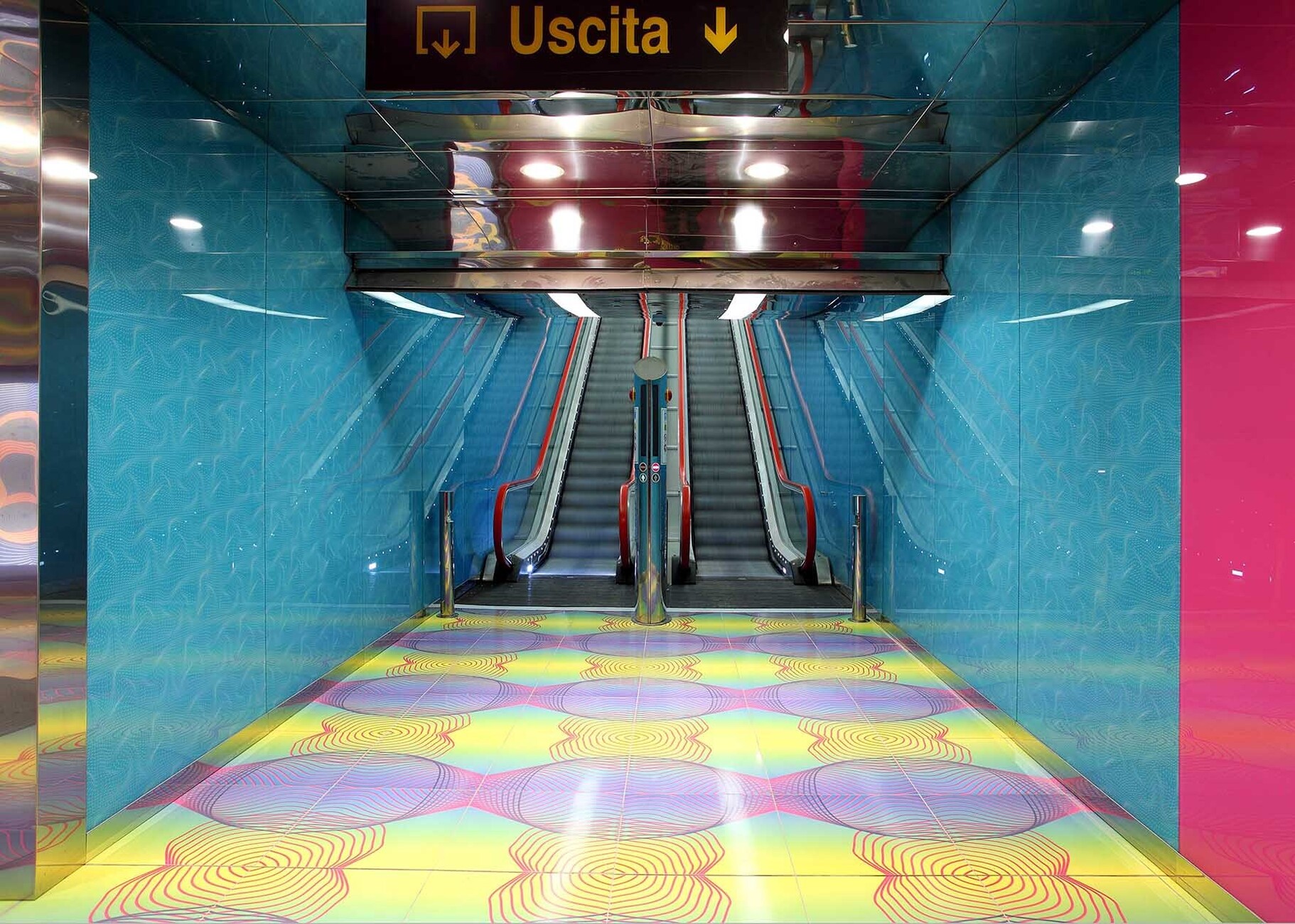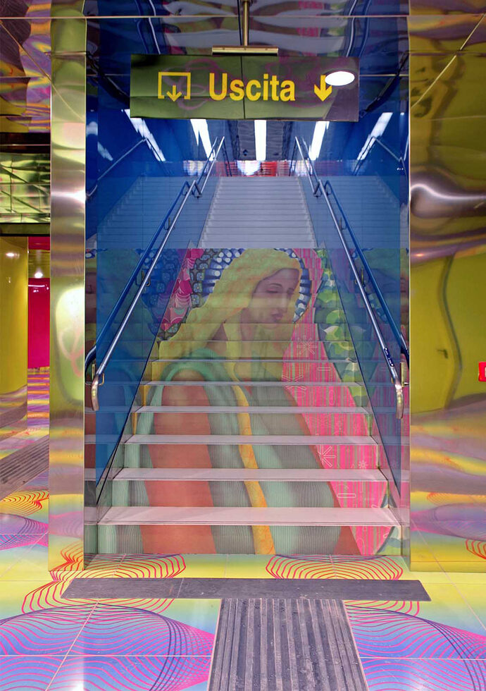 After artistically directing the 45th Venice Biennale in 1993, Achille Bonito Oliva was able to extend his idea of the “Museo Obbligatorio” (obligatory museum) to urban space. In the “Museo Obbligatorio,” art no longer takes place only in closed institutions, but encounters citizens in their everyday lives. In a subway station, according to the thesis, passengers cannot help but notice the works of art as they move through the space. In this way, the anonymity and homogeneity of modern transit spaces could be broken up and instead enriched with identity and beauty. Where conventional metro stations often resemble “oversized toilets” with tiles and poor lighting, which can be demoralizing for commuters, an “osmosis” between architecture and art could take place, improving the quality of life physically, morally, and intellectually.