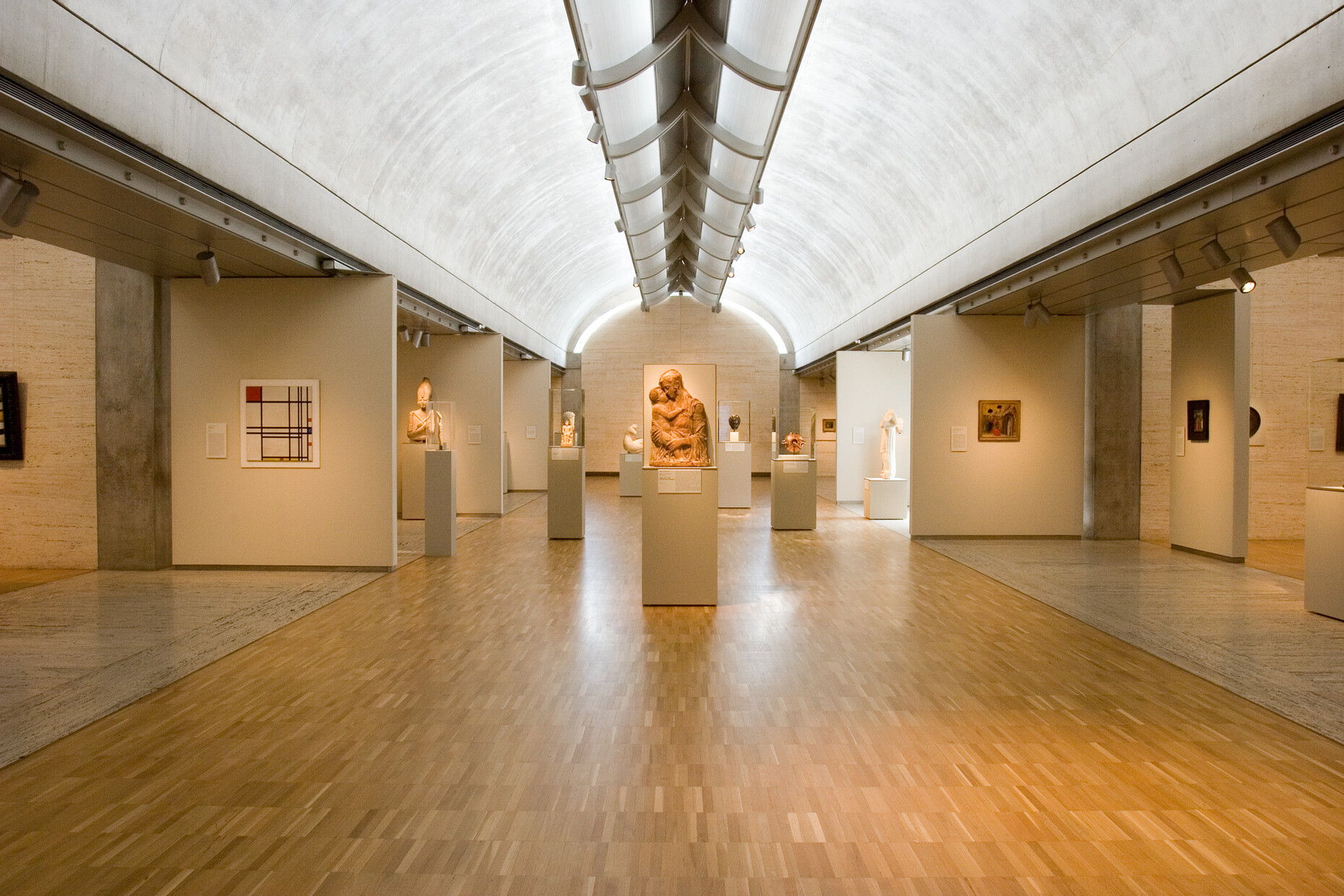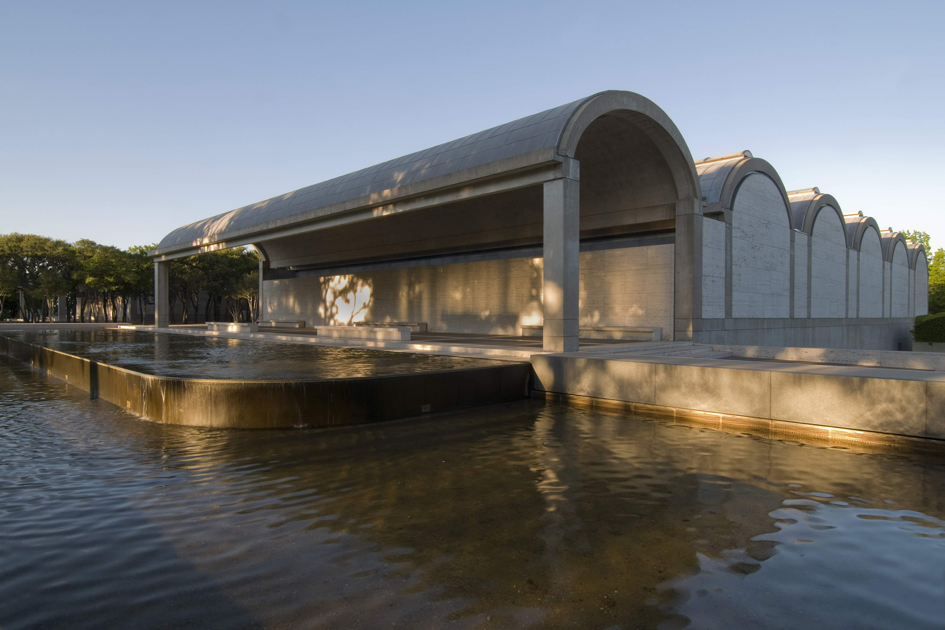 An early influence was his teacher Paul Philippe Cret, who taught him at the University of Pennsylvania and in whose firm he worked for many years. Cret, who was an architect in the tradition of the Parisian École des Beaux-Arts, passed on his approaches to his students and helped mold Kahn, too, who subsequently adopted themes such as monumentality and symmetry or working with light and shadow into his own body of work. One example of this is the Kimbell Art Museum, completed in 1972 in Fort Worth, Texas, where he designed a symmetrical building comprising three parts with a centrally positioned recessed entrance area. On the longitudinal sides, the museum is made up of elongated concrete units lined up one alongside the other, each of which is crowned with a barrel-shaped roof and which serve either as a fitted-out space or as a porch. Between these, Kahn slots internal courtyards which, together with the porch roofs, create artful transitions between interior and exterior. In the exhibition area, the individual barrel roofs are crowned with a slot-shaped skylight. The daylight flowing in falls across perforated aluminum reflectors placed under the ceiling on the concrete surfaces of the barrel roofs, generating soft light.