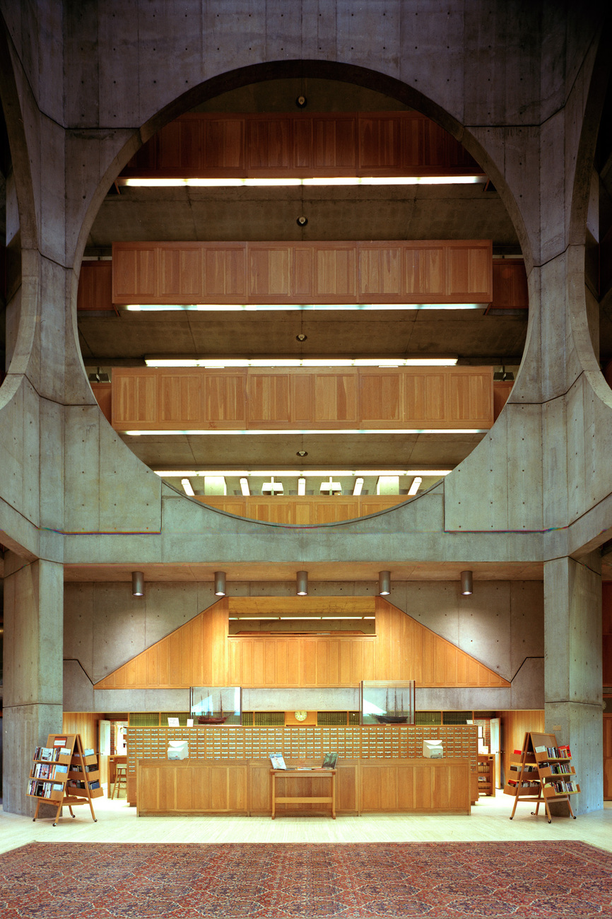 In fact, the interplay of daylight and architectural space is one of the architect’s key themes. Kahn himself mentions this in passing when he wrote: “Architecture appears for the first time when the sunlight hits a wall.”Here, he made a distinction between served and servant spaces, which were intended as a structural depiction of the functions associated with the building. One example of this is the Phillips Exeter Academy Library in New Hampshire, built in 1972. Here, an atrium with skylight forms the central core of the square building, which is one of the biggest school libraries in the world. Access is from the four diagonally positioned corners. The main entrance is via a double-flight, Baroque-style staircase that connects the ground level with the atrium on the first floor. While the reading and study areas are positioned along the façade and therefore benefit from daylight, the shelves housing 250,000 books provide a servant area in the middle around all four sides of the atrium. Subdued light falls from above onto the surrounding concrete structure, the large, circular openings of which create a visual connection between the bookshelves and the atrium and set the stage for the library as a monumental store of knowledge.