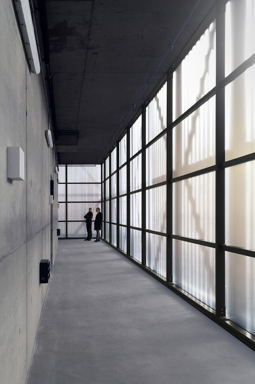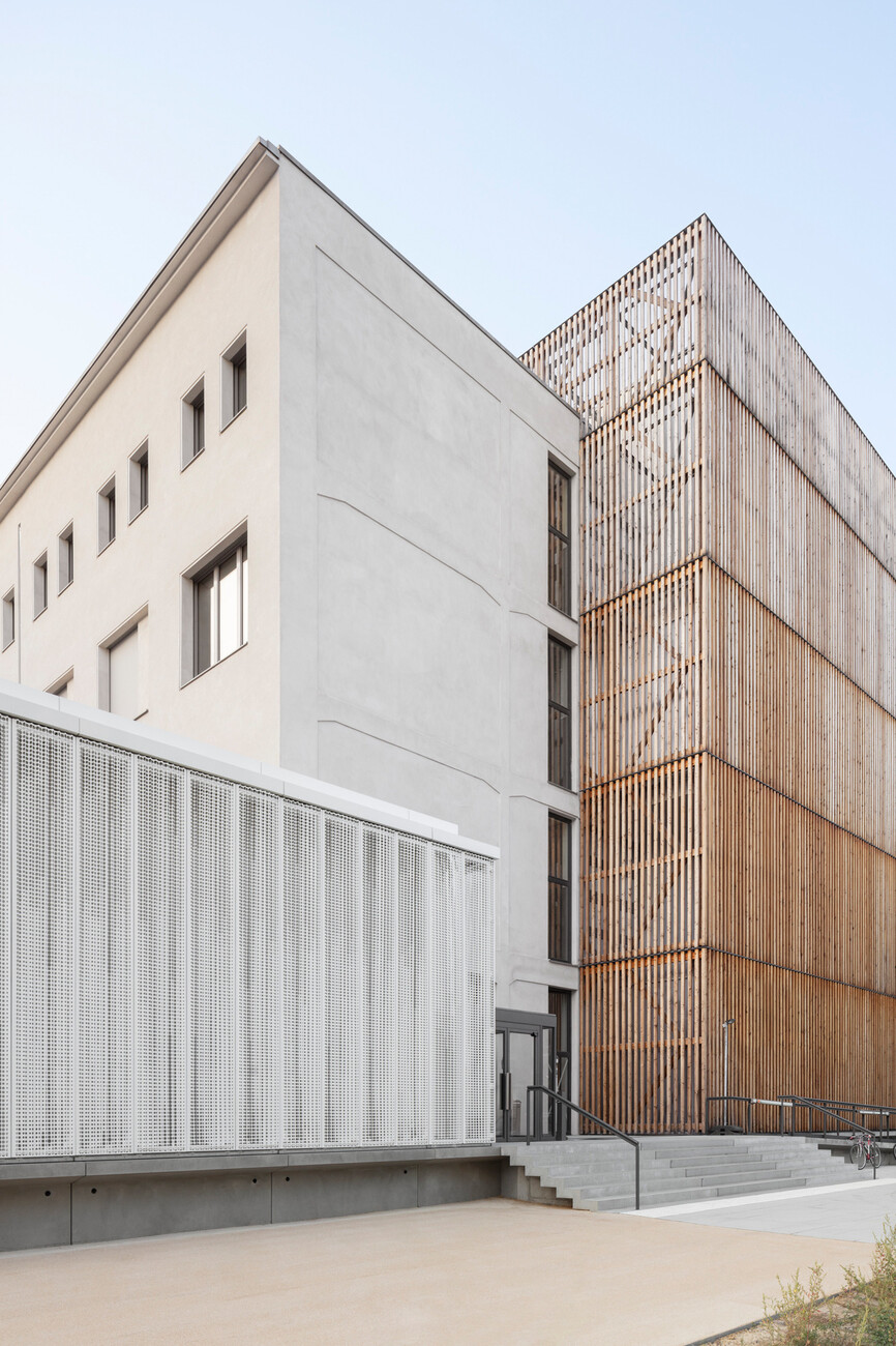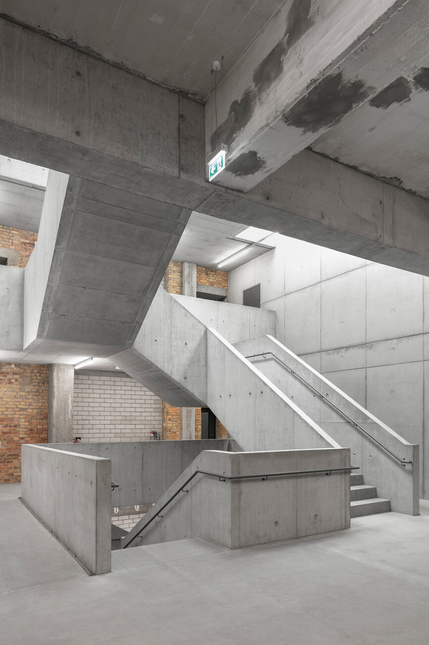 A newly added triple-flight of stairs that leads off from the corridor was designed as a freestanding concrete sculpture and exudes a certain raw charm. Moreover, the interlocking of the new stage tower with the existing building is reflected inside. Specifically, the slatted facade is repeated in the corridor and once again openly displays the structure of the building. Naturally, in this context one can wonder whether the architectural shabby chic of the academy is occasioned by a certain zeitgeist or whether it simply consistently visualizes the concept of a peek behind the scenes. At any rate, the building is one of the finalists for the DAM Prize, a nomination that is undoubtedly deserved.