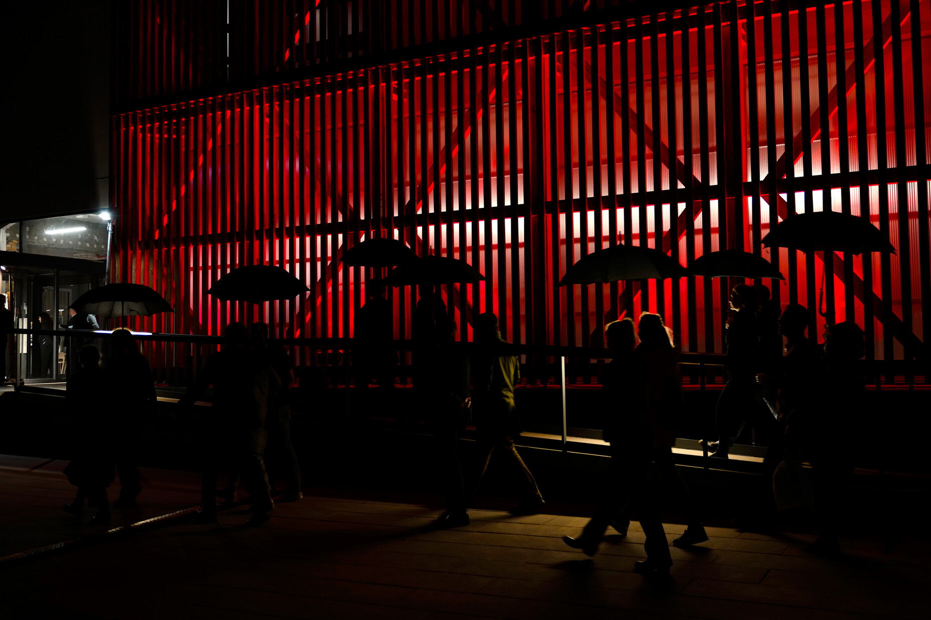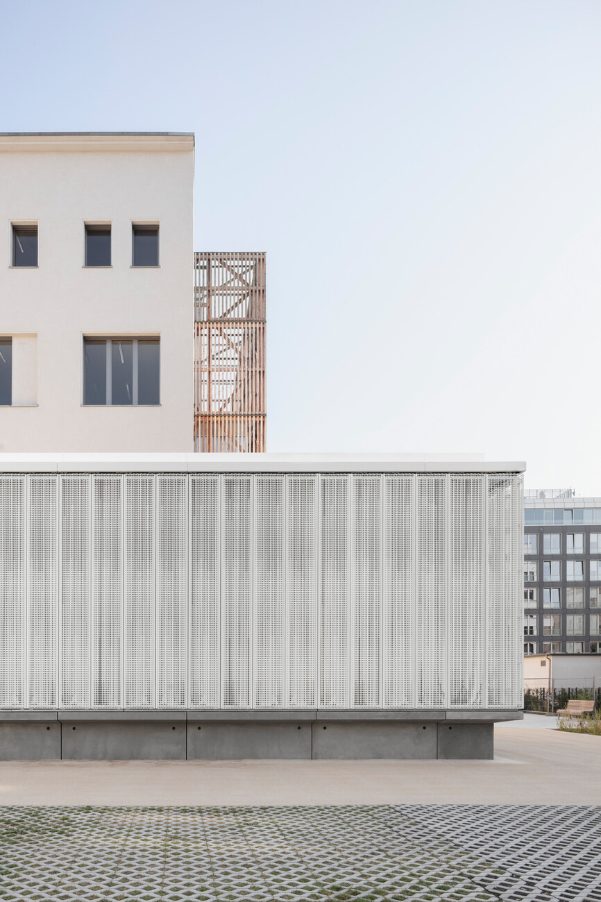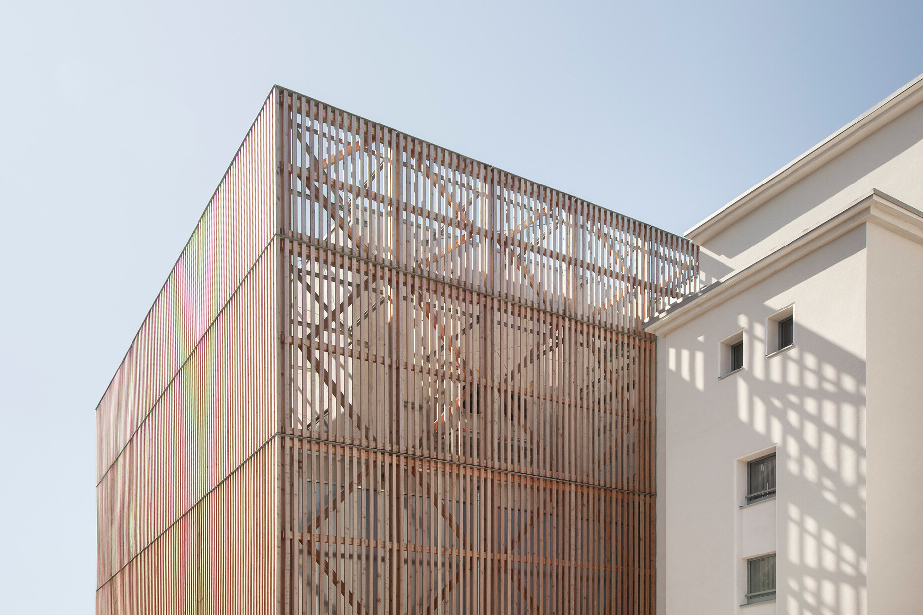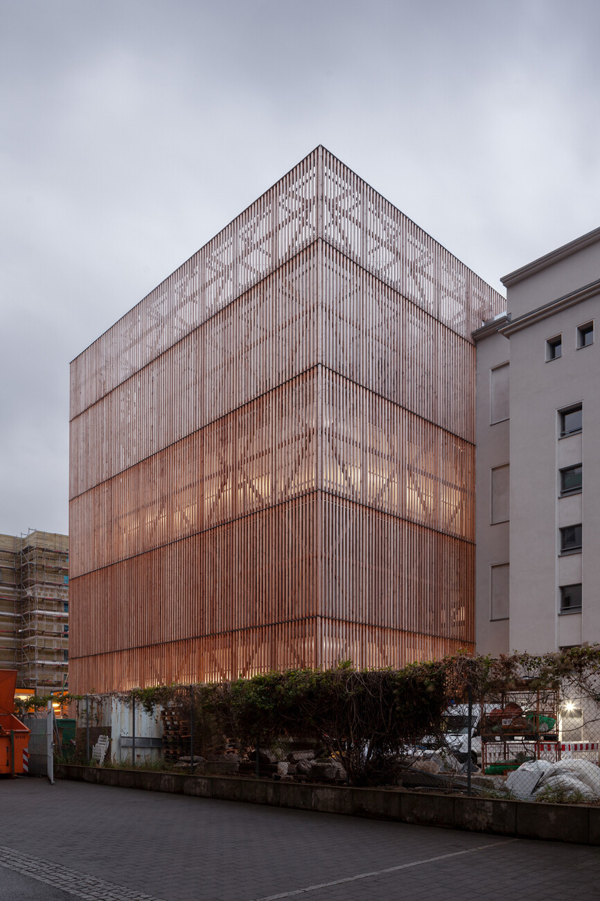 Luckily the dramatic rise in costs was not followed by an architectural drama so that at least in this respect it can be said that there was a happy end for the new Academy of Dramatic Arts. The latter is a four-storey concrete block with a perforated facade from the 1950s that the architects converted and expanded by adding two sections. Specifically, there is the single storey cafeteria that docks onto the existing building in the south west and the striking 24-meter-high stage tower in the north east that was inserted into the existing architectural structure on the front. In combination they define the main entrance with the stage tower being assigned the role of leading the ensemble both from a programmatic perspective but also in terms of urban lines of vision. It accommodates the two rehearsal stages and by night is also a figurehead with its striking wooden facade that in the dark is transformed into a body of light thanks to the polycarbonate panels behind the larch slatting. The arresting effect this has from a distance is also necessary given that the academy is located in the back yard of a block and access is via a gap between buildings.