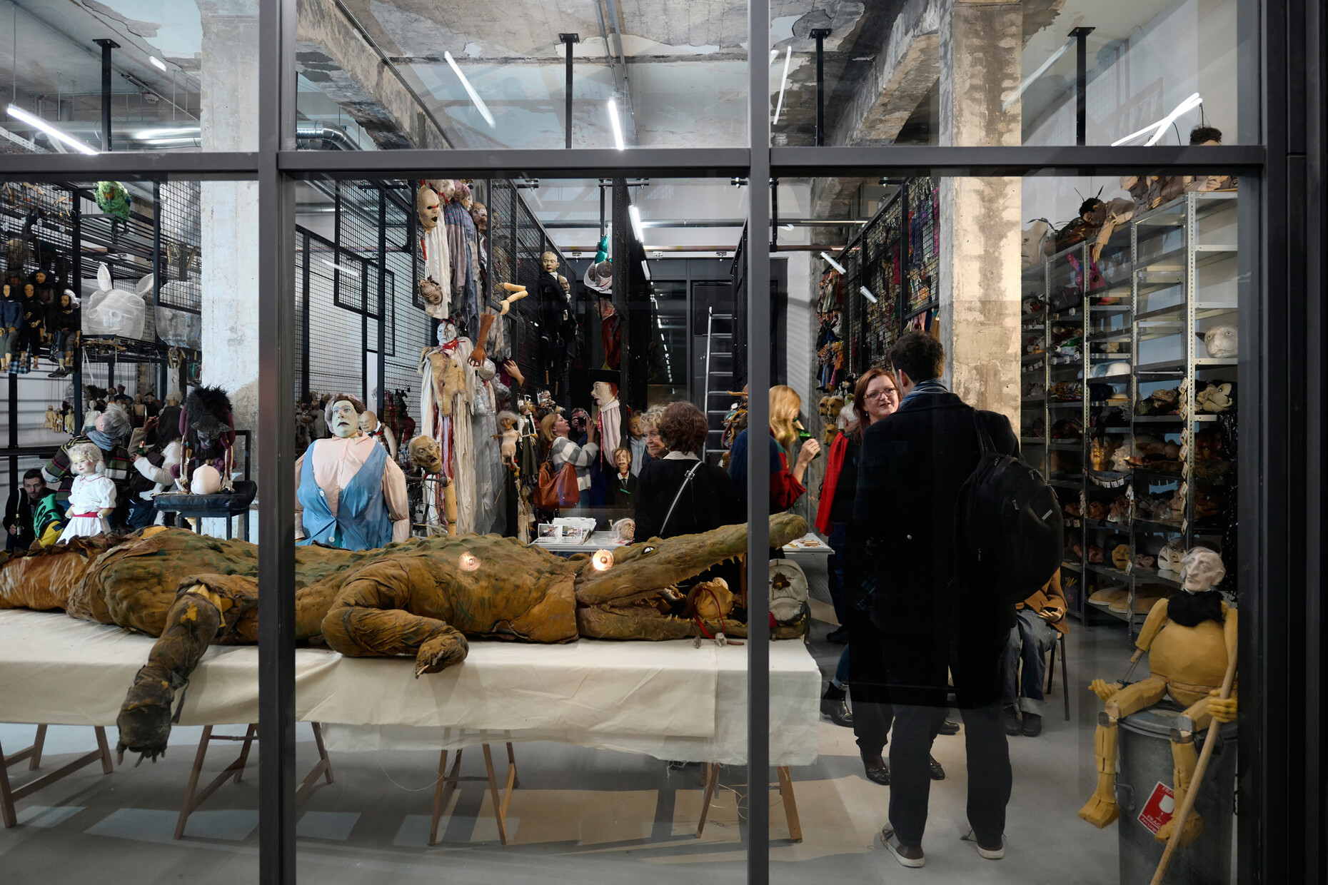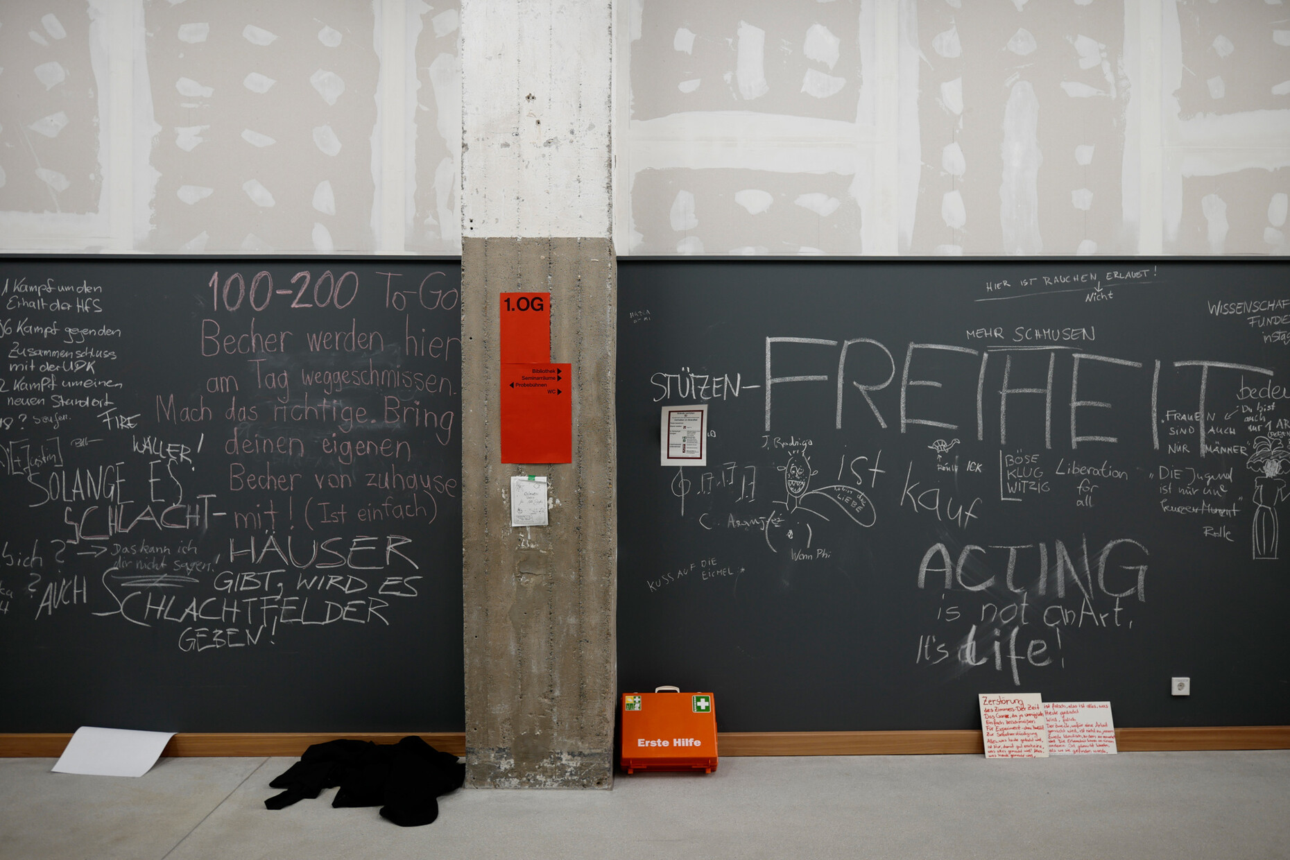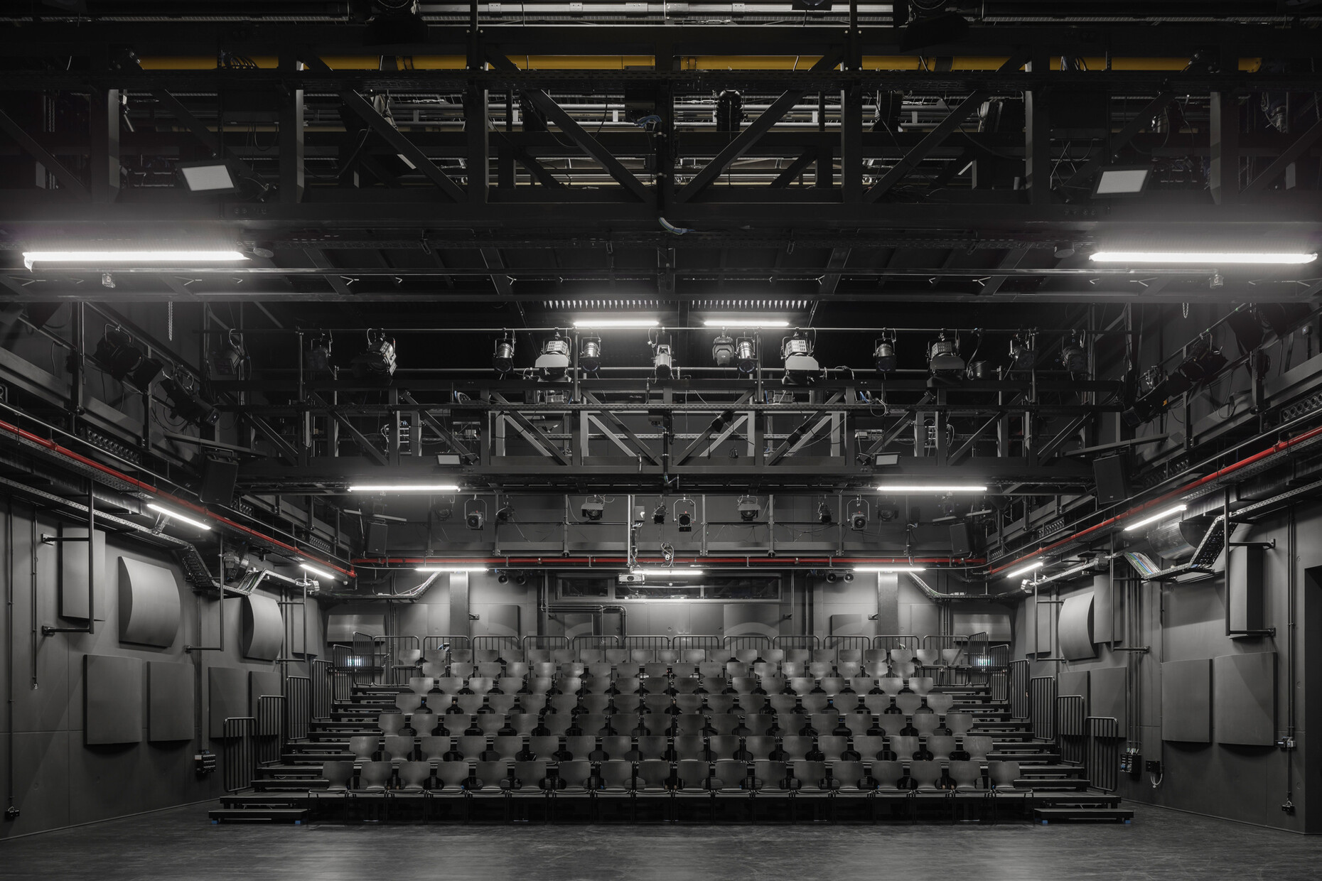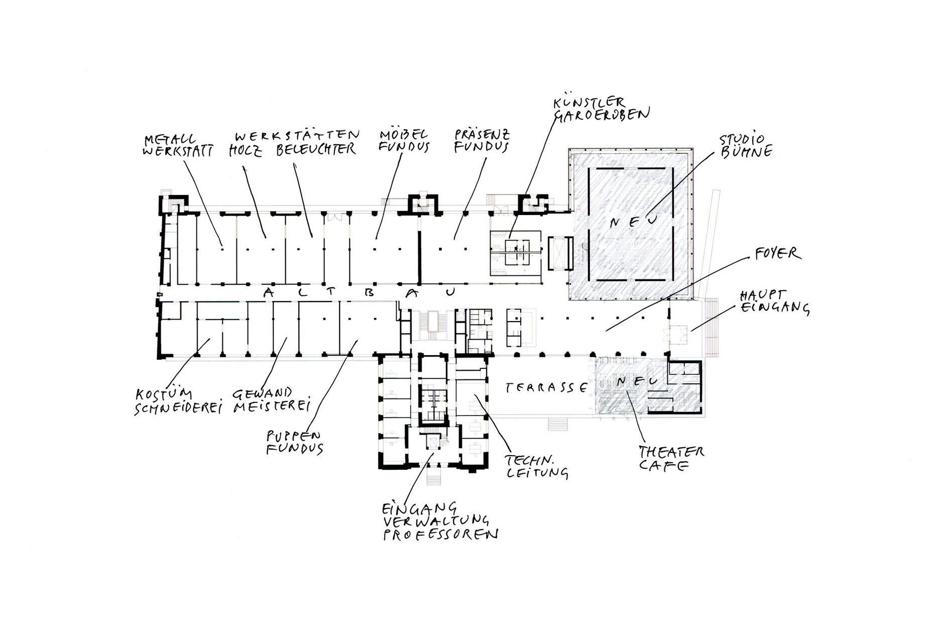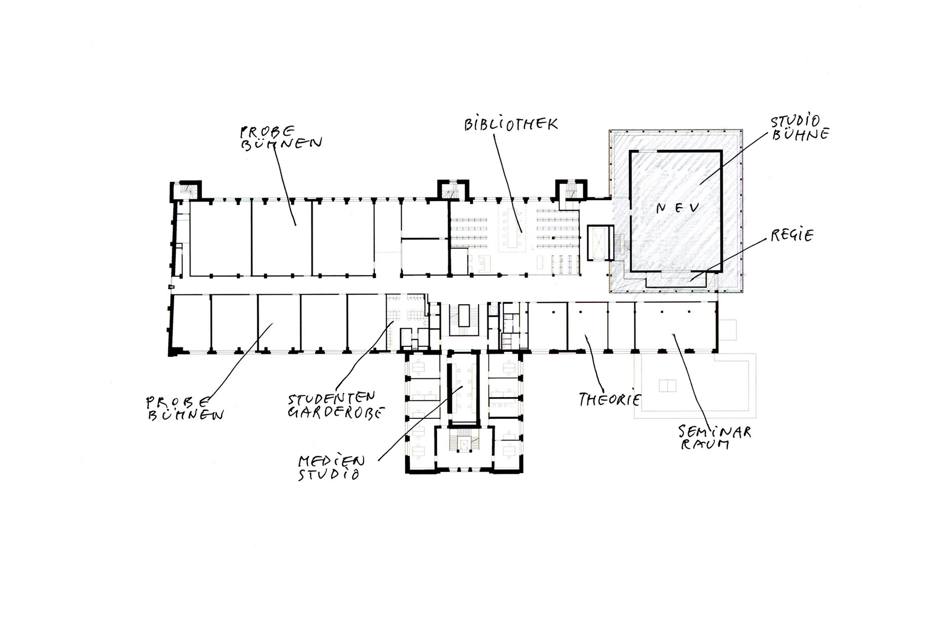 The architects responded to the heterogenous neighborhood and location set back from the street with an architecture that is raw in the best sense of the word, a concept that is continued inside. On entering the building via the main entrance, you initially arrive in the foyer. To the left there is the cafeteria as a pocket of space and straight ahead a reception counter behind which on the right side a corridor provides access to the workshops and props room whose glazed walls permit a peek behind the scenes. The same raw principle is applied to the new look of the building whose material is similarly deprived of any mystique. Consequently, the interior was only rendered up to a height of 2.30 meters. New wooden doors and skirting boards were also added while dark blackboard paint was used on the walls. Students can now chalk their mark for posterity on it. However, the brickwork, limestone, concrete pillars and plasterboard panels above it tend to come across as an architectural hotchpotch.
