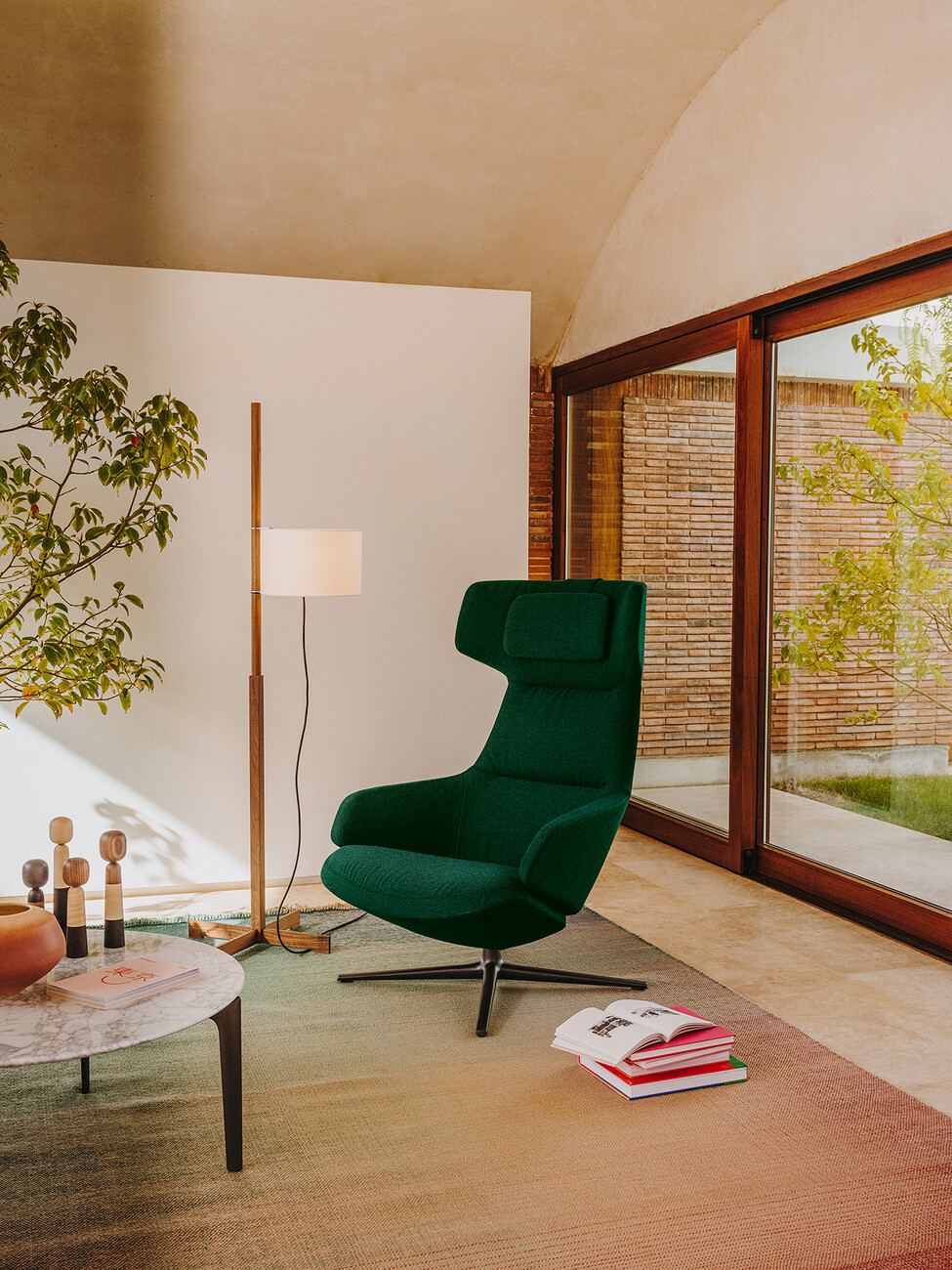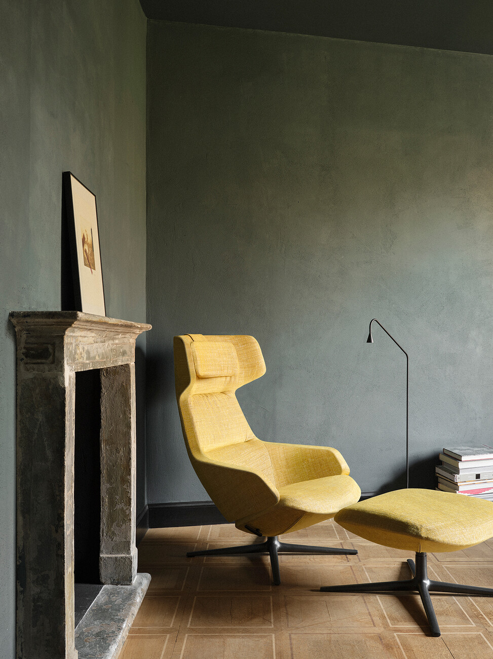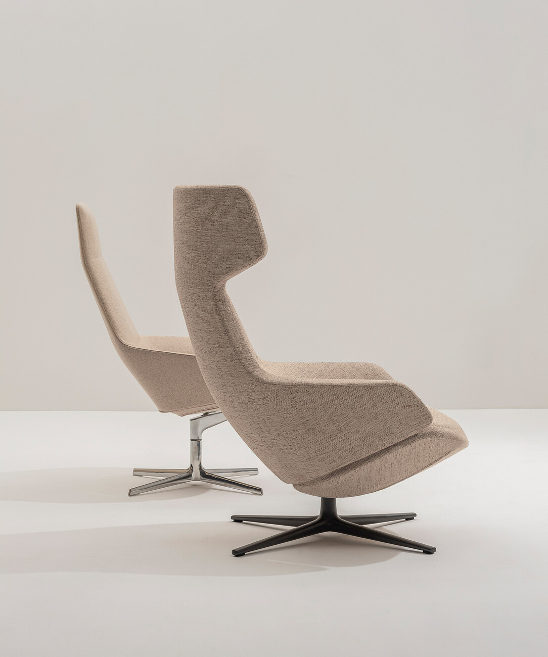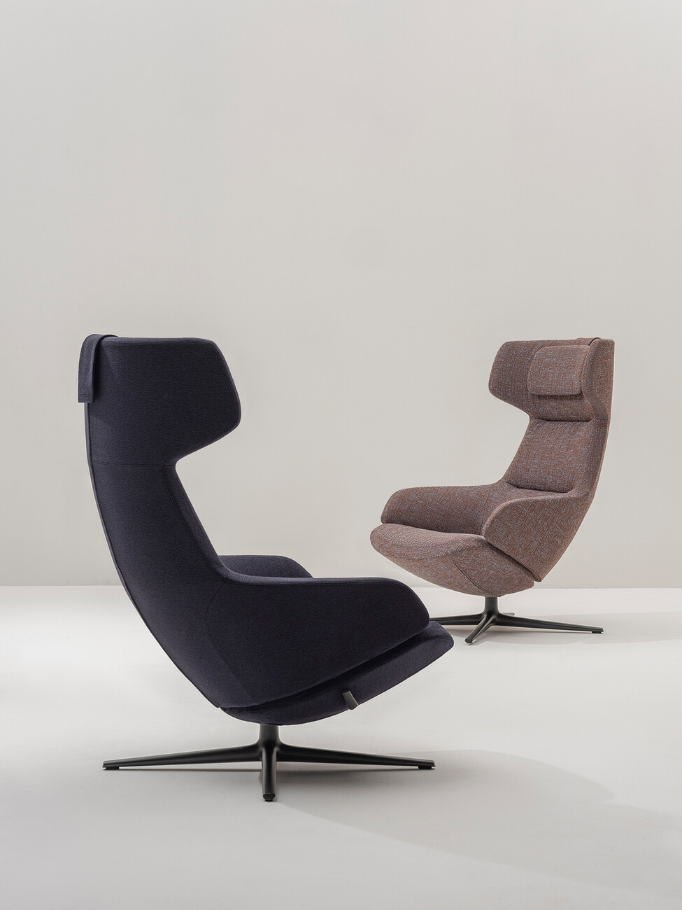"Aston" has always been a statement: Jean-Marie Massaud conceived the swivel chair for Arper in 2006 and provided it with an aerodynamic silhouette, swivel base and star foot in aluminium. The straight-line profile, the high level of seating comfort and the wide range of colours for the upholstery made "Aston" a favourite on the boardroom floors even then. "Aston Club" is the name of the further development of Massaud made of recycled industrial plastic. With a sustainable approach, still straightforward and with an extra touch of comfort, "Aston Club" is now also ideal for living and lounge areas. The striking seat shell has been supplemented with headrests and now encloses the sitter even more generously. For the base frame, there is a choice of polished or colour-lacquered aluminium and also with regard to the possible upholstery fabrics, Arper offers many possibilities for giving the armchair an individual touch. The "Aston Club" is complemented by a small footstool. (am)