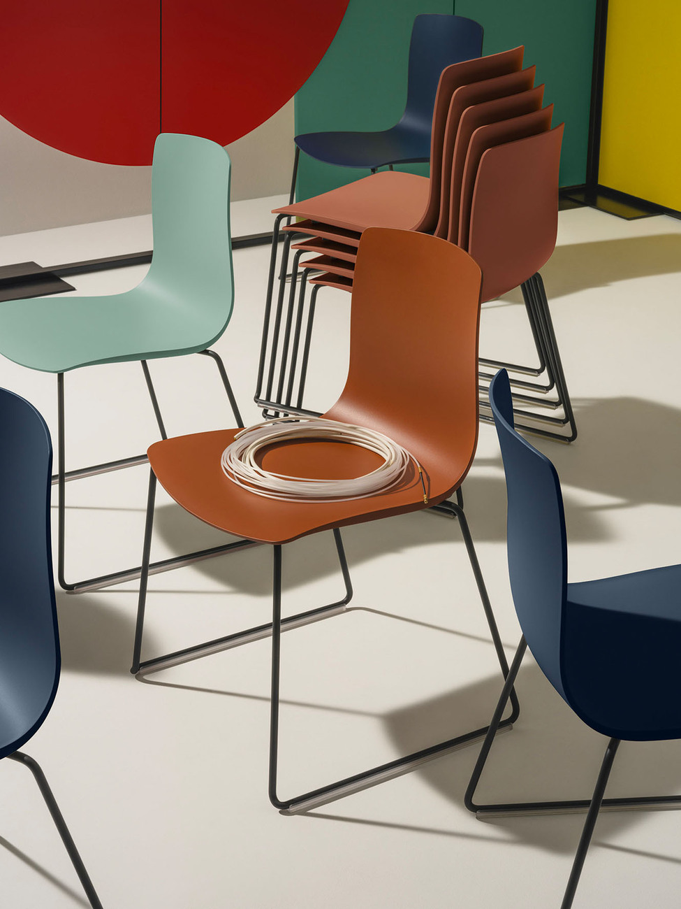 In 2013, Antti Kotilainen designed "Aava" for Arper, a seat shell shape for chairs and stools that can be adapted to every need thanks to different frames and covers – whether on four legs, runners or castors. Ever sustainable in form, "Aava 02" is now also sustainable in material: for the plastic versions, a compound of post-consumer plastic will be recycled in combination with high-quality polypropylene. On average, 5.6 kilograms of waste are reused for the production of 10 chairs. The new edition of the collection is also FSC-certified. No glue is applied in the complete upholstery versions, so that the individual components can be easily separated and returned to the cycle. The new colour palette of "Aava 02" can also be harmoniously combined with the other collections from Arper. "The aim of my work as a designer is always to create durable and flexible products. 'Aava 02' is designed for both homes and public spaces. Its shape adapts to both modern and traditional environments, and its variations meet many different user groups and their needs," says Kotilainen. (am)