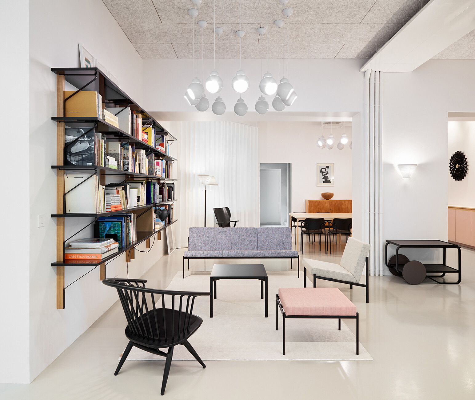 The themes of openness and transparency run consistently through the whole concept. There is even an absence of doors, save for the bathrooms and meeting rooms. The clear intention here is to foster communication and interaction. Ultimately, in the age of digitization, interpersonal encounters count more than ever, whether it’s as a productive office community or as an interactive showroom. After all, this is a space where not only employees come together, but also architects, partners, retailers and customers, in order to experience the Artek and Vitra furniture for themselves and get a feel for it. The design of the office creates a balance between communal spaces and areas for privacy and concentration. Alongside the five team areas, which are reflected in the different colors and fabrics, there are two meeting rooms, one large kitchen, which, together with a library, functions as a “marketplace” and social hub, and presentation shelves with products and samples. Facilities like a cloakroom, lockers, bathrooms and a copy-and-print area supplement the diverse office space.