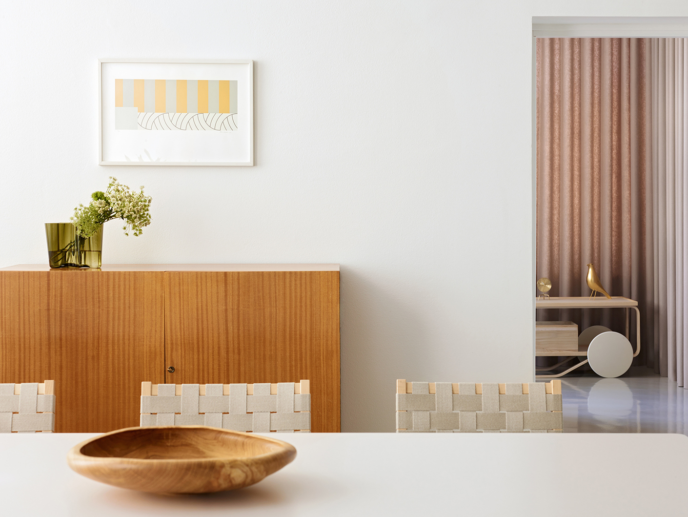 One connecting design element that extends across the entire space are the curtains in rich colors, which frame or can close off the individual areas and thus determine the perception of the space. A fluid, cast-concrete floor and high, white walls ensure a sense of calm and rigor. Details like the linoleum-clad kitchen, warm birchwood handles and a tiled tabletop are reminders of the craftsmanship of the Finnish brand. In the furnishings too, there is a combination of old and new design from Tapiovaara to Bouroullec, thus creating a friendly, creative and, at the same time, functional atmosphere – in keeping with the philosophy of the brand. As small as this inconspicuous and stylish office revolution may be, the more it captures the spirit of the times. And the concept is followed through right down to the trash cans. In the Artek Oy office there is just one single wastepaper basket. Anyone who needs it has to get up and can use the trip to chat briefly to colleagues – keeping up the momentum, both in how they communicate and how they think.
