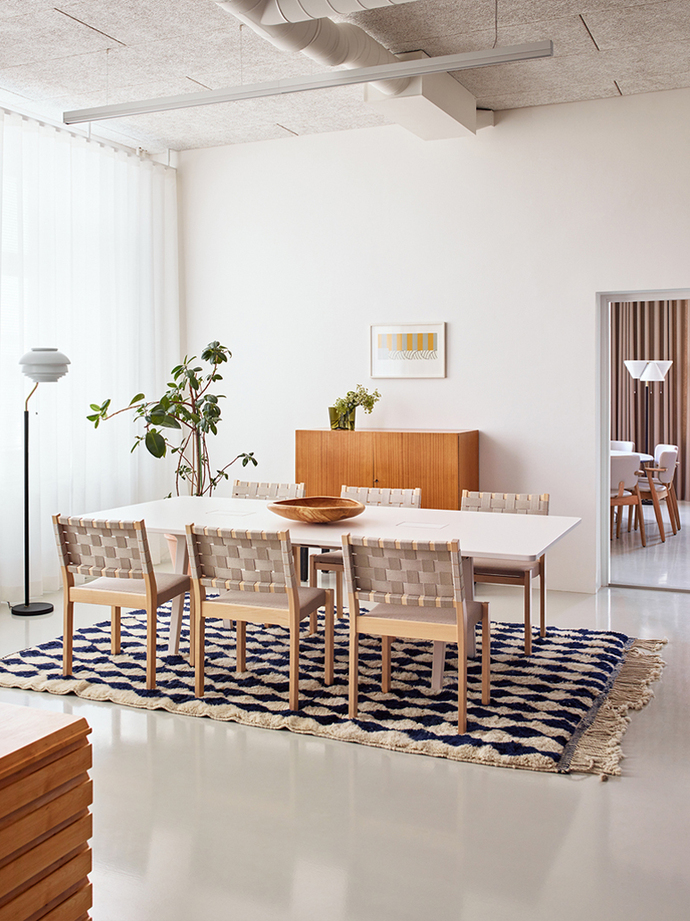 An office like a home, generously distributed across 470 square meters in an old building from the 19th century, in the heart of the city. Everything is open and flooded with light, full of appealing aspects and outward views. And – most importantly – full of possibilities. The aim here is that in future, work and the feeling of being at home will come together in one space. What sounds questionable functions in the Artek Oy office not only in an especially pleasant, but also in a very natural way. The team meeting takes place at the dining table or in the kitchen. Telephone calls can be taken briefly on the sofa or at an employee’s own desk, while guests can take a seat in the quiet conference room or in the living room. Here, there are no rigid guidelines. The only important thing is that the mind remains agile. For the new headquarters of Finnish furniture brand Artek, which has been part of the Vitra Group since 2013, renowned London-based office expert Sevil Peach created an environment which places the human being at the center and aims to inspire a new form of working. “It’s not just a question of the space I create; equally important is how people behave in these spaces,” the architect explains. With this in mind, the office at Mannerheimintie 12 B employs various ways of encouraging its occupants to work and to enliven both rooms and furniture.