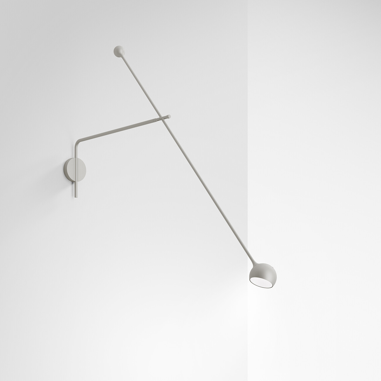 The successful series has now been expanded both technically and proportionally: with "Ixa Wall Spot" and "Ixa Wall Spot Plug", two alternatives for a minimalist yet smart wall light without a swivel arm have been added to the family: either with an integrated driver or with cabling, where a wall fixation makes the cable routing an aesthetic part of the luminaire. With "Ixa XL", a larger head is also being introduced to the collection. The designers have rebalanced the proportions to equalise the weight. With "Ixa XL Ceiling" and "Ixa XL Wall", the head does not have a magnetic connection, but slides and rotates in a calibrated mechanism. Thanks to the 360-degree rotation of the joint that connects the supporting rod to the counterweight rod, it offers complete flexibility. The larger luminaire head contains a dim-to-warm light source with a precise lens. This ensures bright light for a concentrated surrounding, and when the brightness is reduced, it provides increasingly yellow light for a cosier atmosphere.