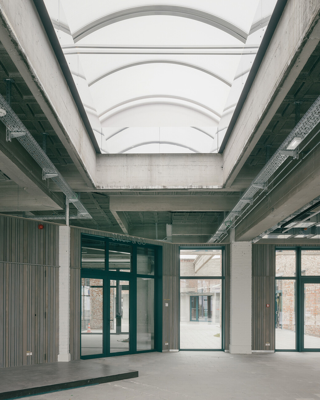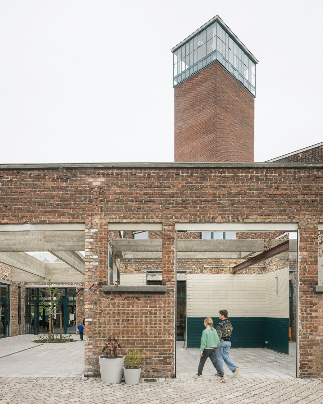 The competition was won by Carolien Pasmans and Bram Aerts of the Atelier for Transformative Architecture & Masterplanning, or ATAMA for short. Their design demonstrates great architectural sensitivity as they are particularly careful in handling the existing building and considering the clearly-articulated wishes of the people who will be using it. Sometimes architects overdo it and think they have to come up with their own ideas. However, in Kortrijk the buildings along the street and the truck shed were revitalized extremely sparingly, with the measures being more repair work than restoration. Only as much was done as was necessary to render the rooms fit for use. A wall was removed here, new technology was installed there – cable ducts and pipes remain exposed, and the materials used for the walls remain exposed. The architecture merely provides a robust frame – at any rate the people using the building can do the rest better themselves with their arsenal of tools, ideas, and volunteers. The ultrathin spiral staircase which leads up the side of the tower and is encased in its own glass tube is finally visible again thanks to new glass panes, while the spectacular glass space at the top of the tower offers a sweeping, panoramic view out over the low-lying city and can now be used again for small events, workshops, or yoga courses. At the moment it is not exactly sure how this will work in practice as much is still in the experimental stage of trial and error.
