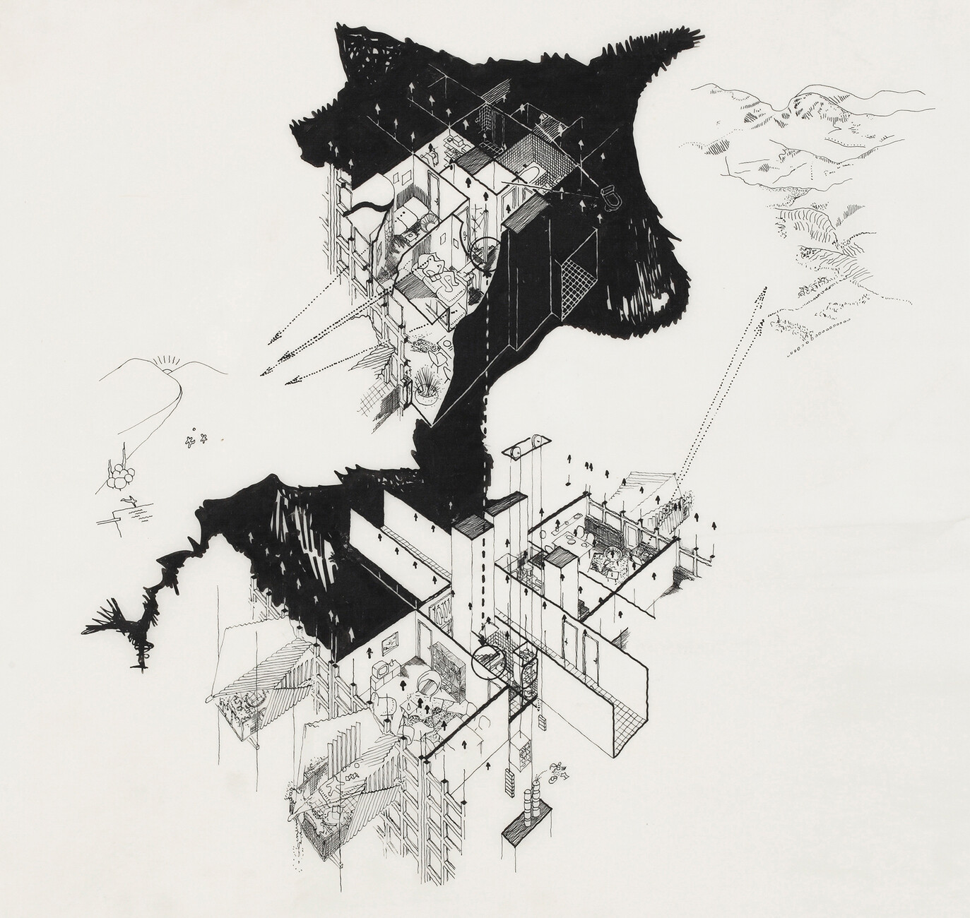 Something else that seems manic to me: his late drawings, large-format, artful hidden-object drawings, in which hand-written postulates meet building constructions.