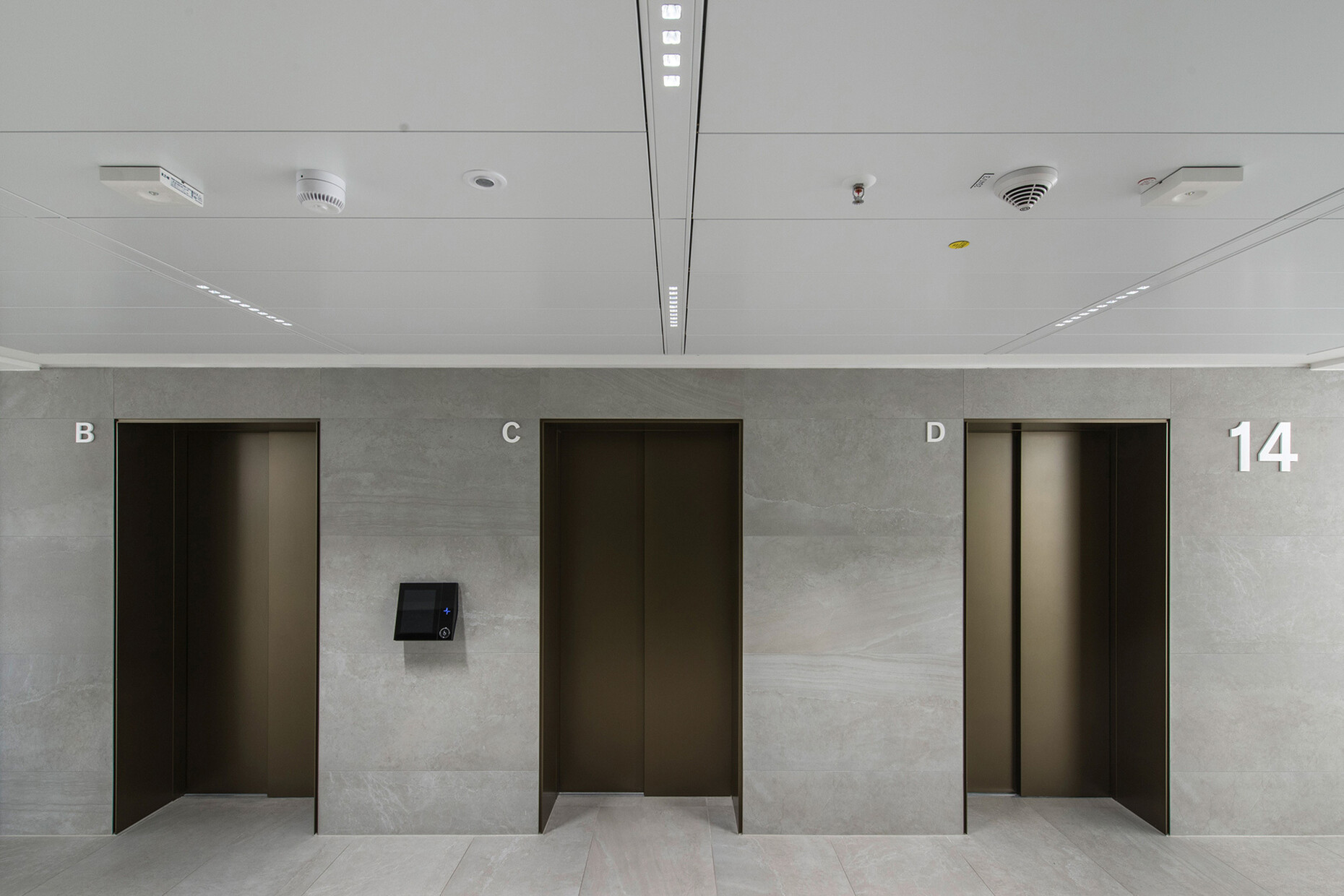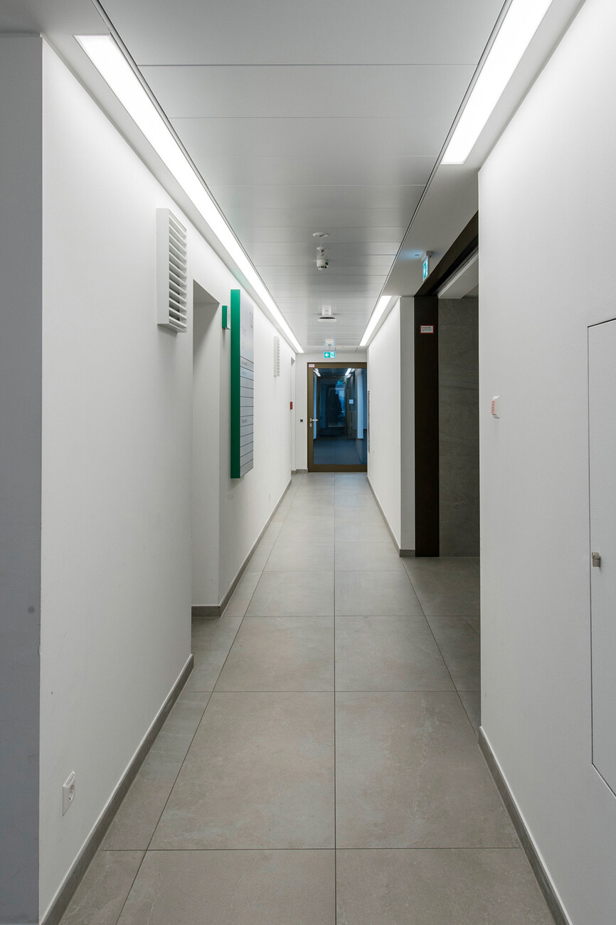 The elevator lobbies feature the dur-F30 fire protection ceiling, with a ceiling structure that incorporates the OMEGA 100 light channels with PUNTEO S25 spotlights. Thanks to the Easy-Click mechanism, the individual ceiling panels can be hinged downwards for inspection purposes and slotted into the bearing profile. The system is also used in the corridors. Here, the lighting channels are positioned to the side and equipped with a opal cover.