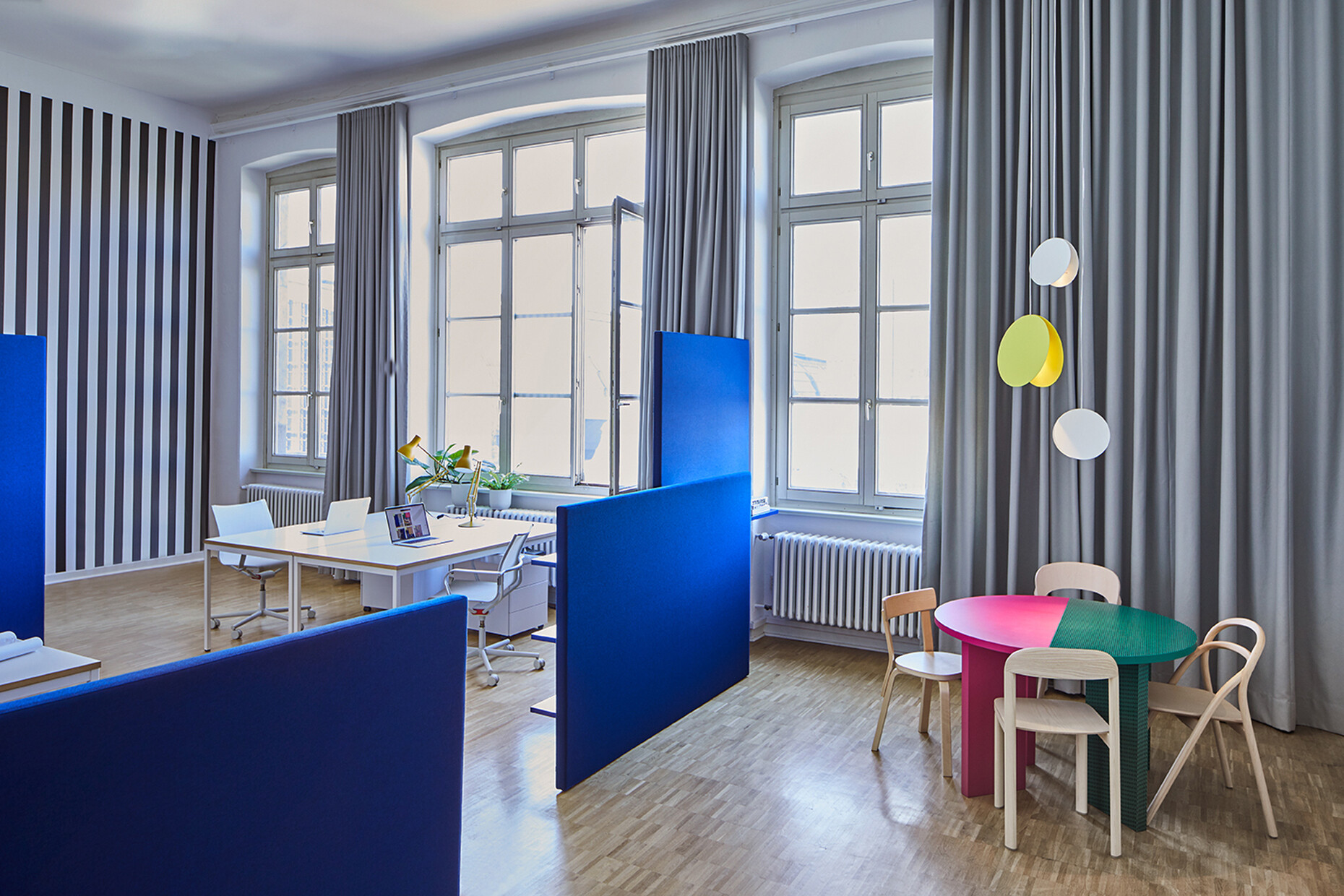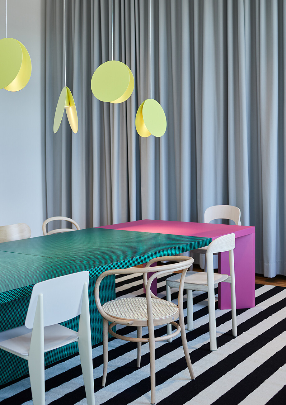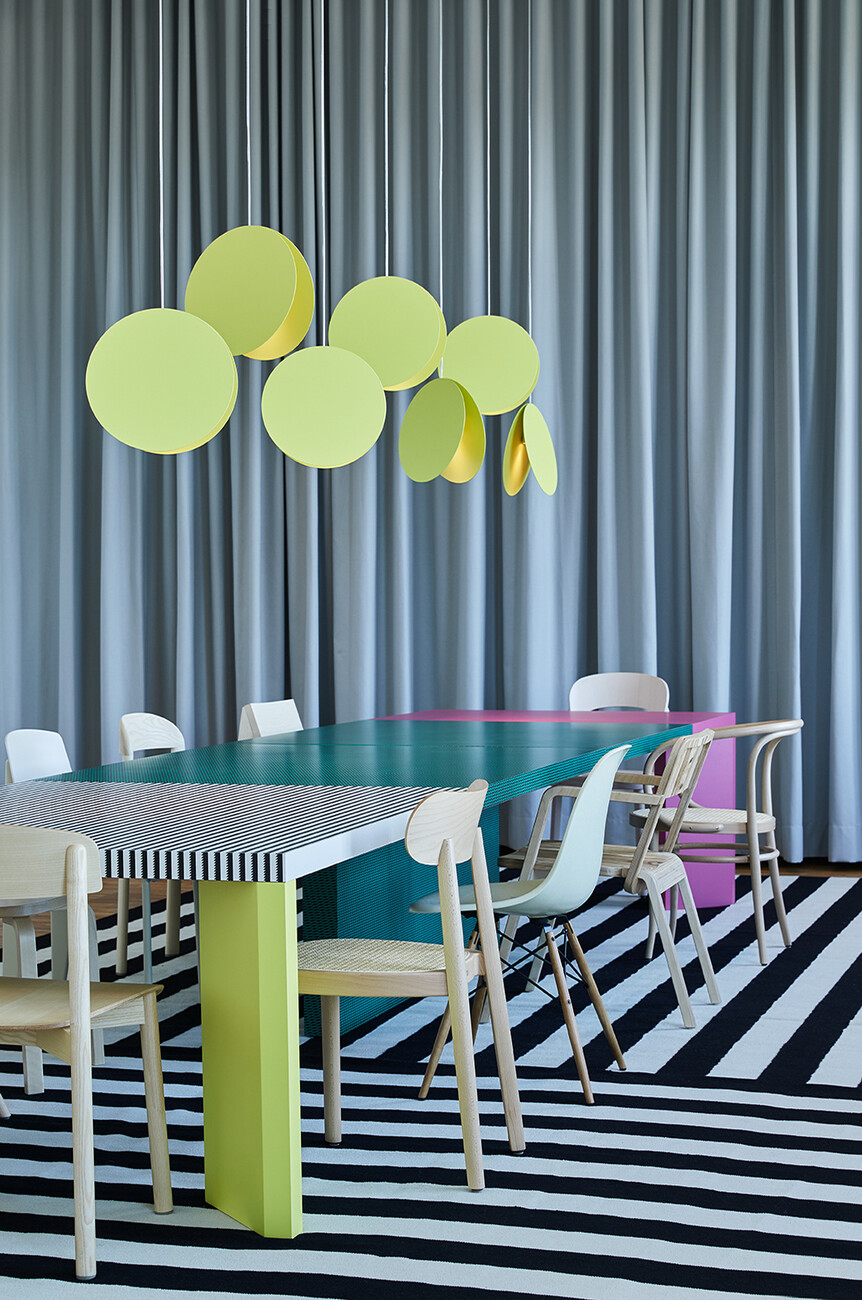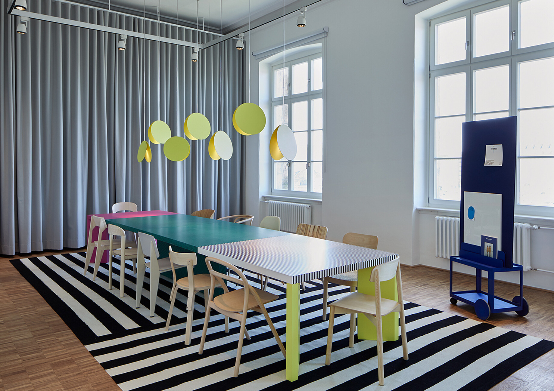 The starting point of Studio Besau-Marguerre is as sustainable as it is unique: Eva Marguerre and Marcel Besau noticed large multiplex panels with graphic patterns in the style of the works of the Milanese group Memphis while looking through the archives of the Museum für Kunst und Gewerbe in Hamburg. Without further ado, they made two tables from these: a large rectangular meeting table and a smaller, round version. "We always find it inspiring to tune in to the building, the location and the client when designing an interior, and we respond to this strongly. At MK&G we have a building with a lot of design history, there are endless exciting things stored here that tell stories, like the high-quality multiplex panels in Memphis style. We took these great finds as the starting point for our interior. Nevertheless, it was clear that we wanted to counter this part of the design history with other elements, and so the idea of the eclectic interior was born. The sustainability aspect also appealed to us," says Eva Marguerre.