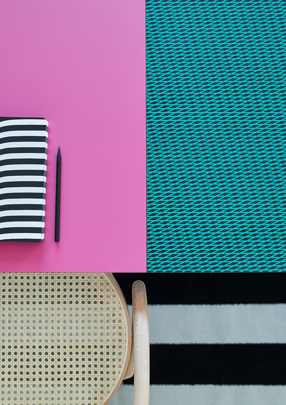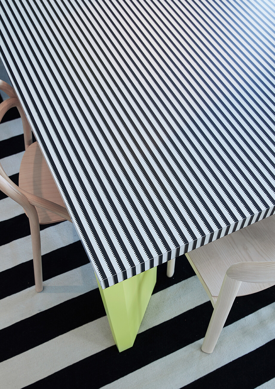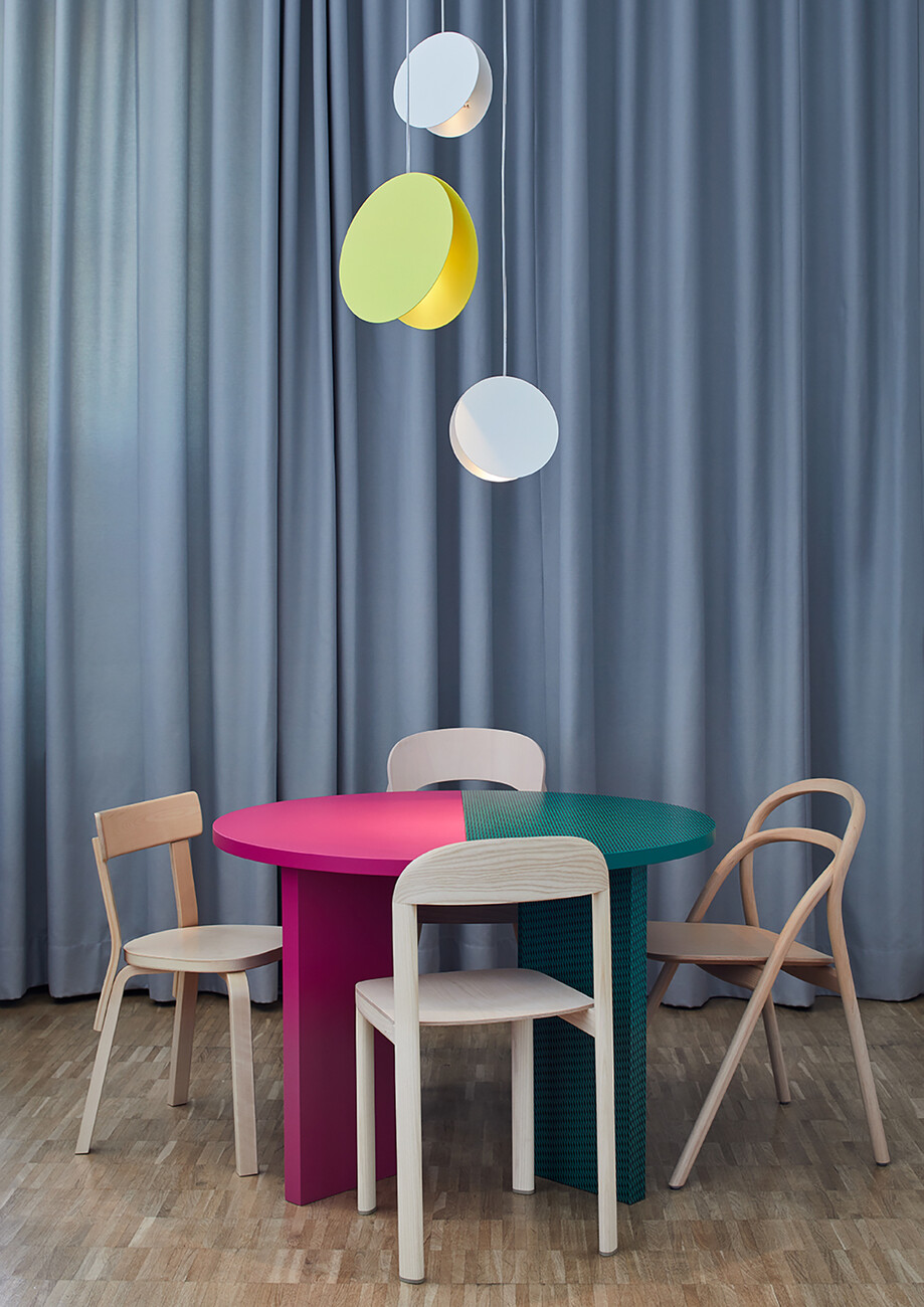 The starting point of Studio Besau-Marguerre is as sustainable as it is unique: Eva Marguerre and Marcel Besau noticed large multiplex panels with graphic patterns in the style of the works of the Milanese group Memphis while looking through the archives of the Museum für Kunst und Gewerbe in Hamburg. Without further ado, they made two tables from these: a large rectangular meeting table and a smaller, round version. "We always find it inspiring to tune in to the building, the location and the client when designing an interior, and we respond to this strongly. At MK&G we have a building with a lot of design history, there are endless exciting things stored here that tell stories, like the high-quality multiplex panels in Memphis style. We took these great finds as the starting point for our interior. Nevertheless, it was clear that we wanted to counter this part of the design history with other elements, and so the idea of the eclectic interior was born. The sustainability aspect also appealed to us," says Eva Marguerre.