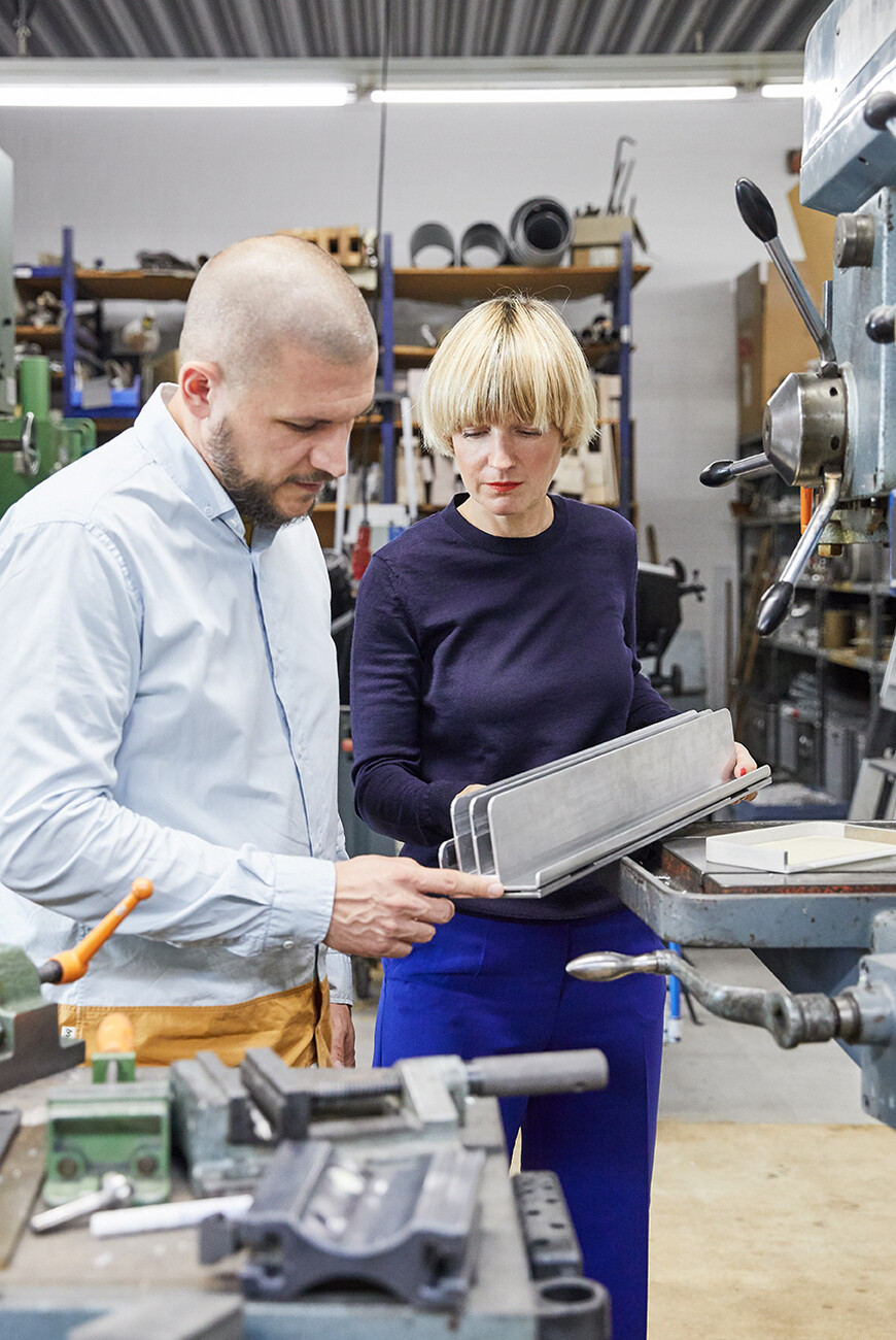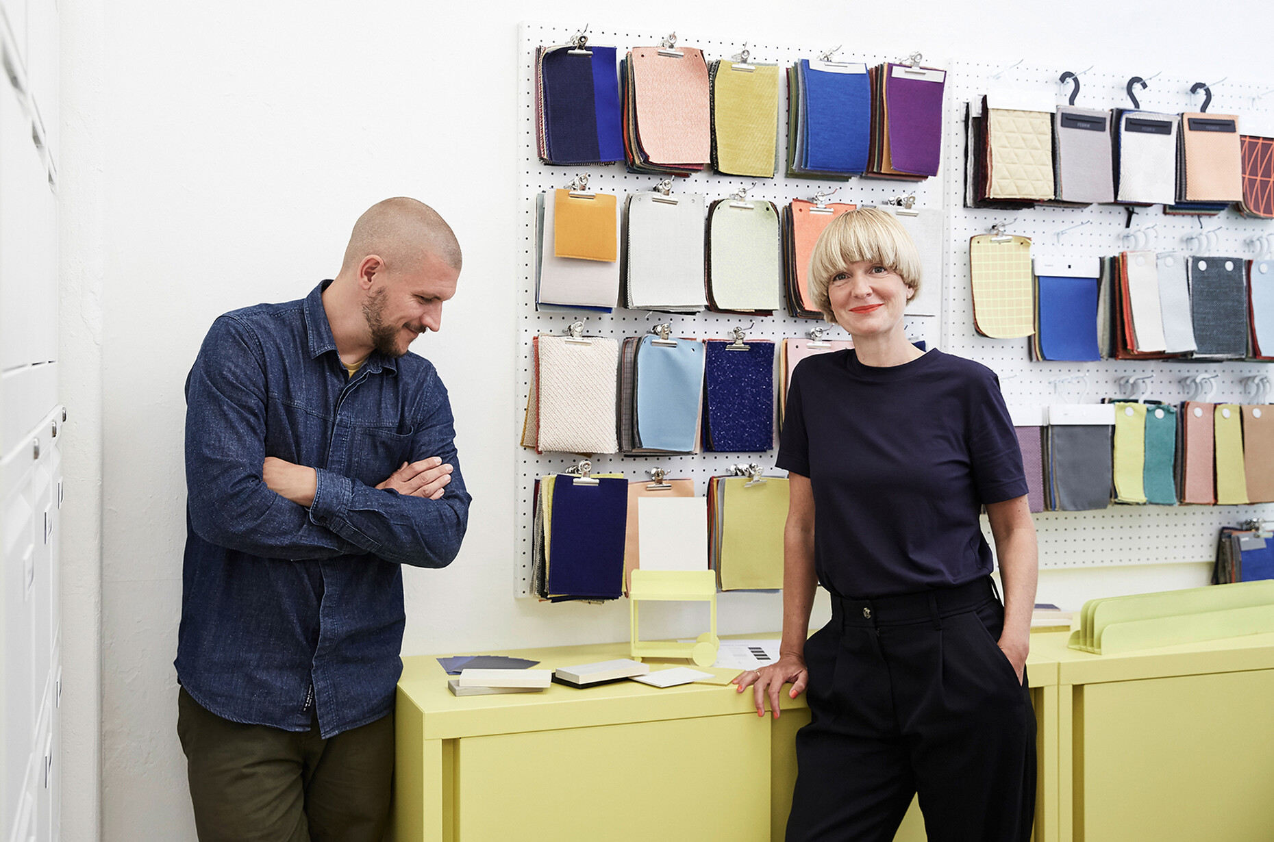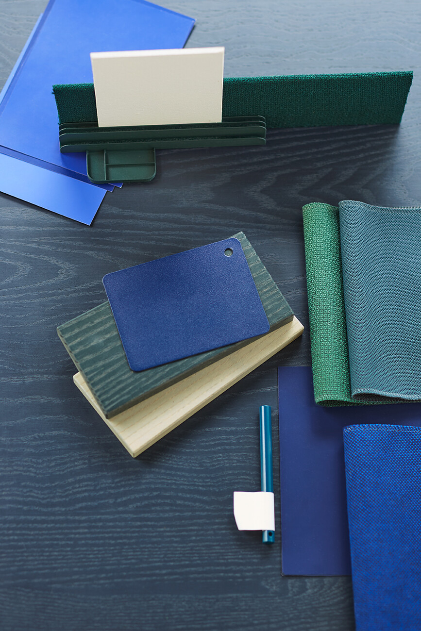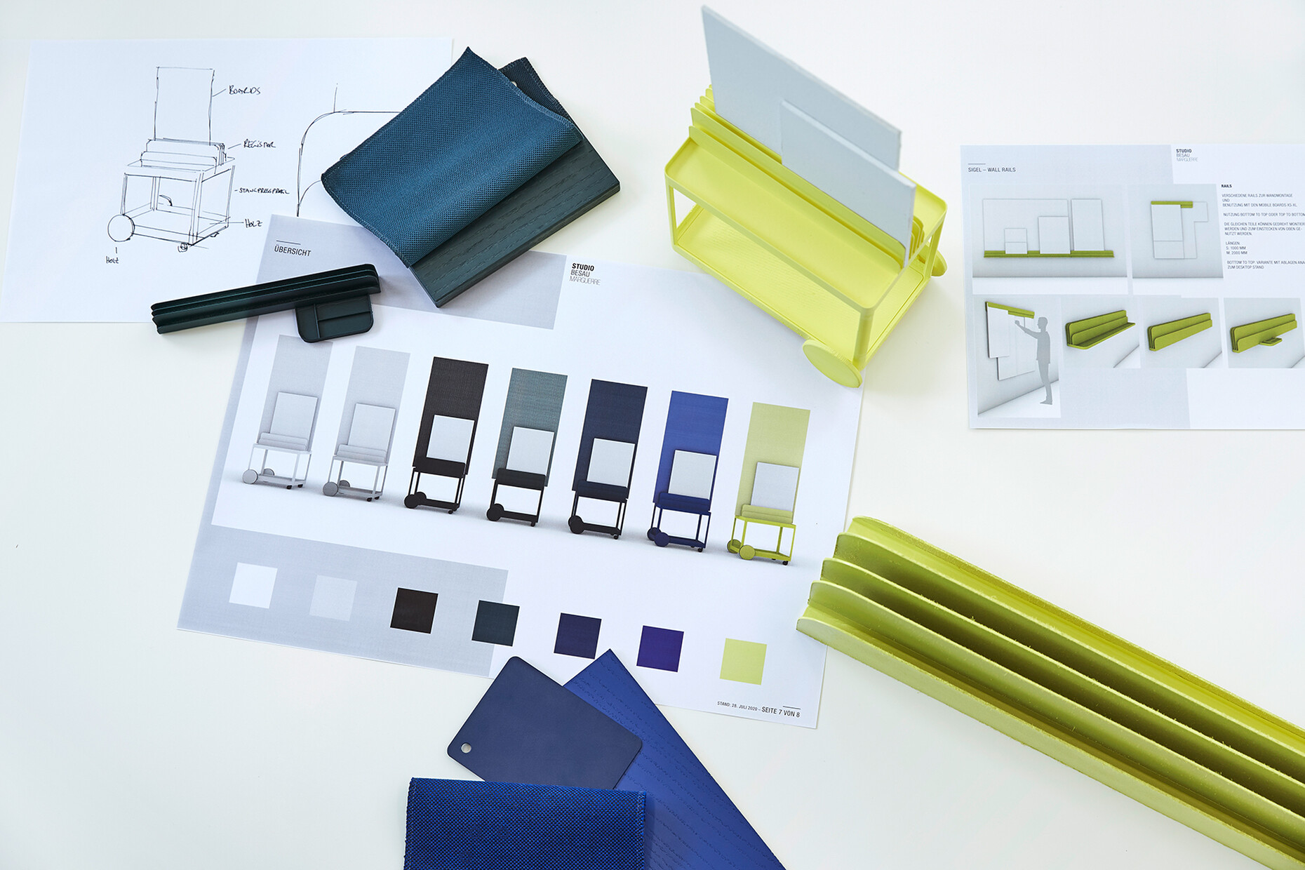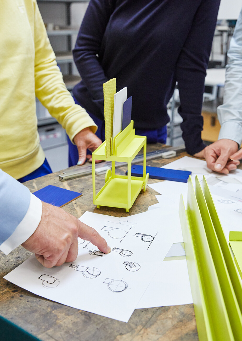 None of the elements of "SIGEL Mocon" are rigidly designed; each part can be used flexibly. At the same time, the unit is strikingly compact: “We wanted to get away from heavy, solid partition walls,” explains Marguerre. Instead, the design appears homely, incorporating wood and metal with rounded edges, and in its typology it is not unlike a serving trolley. Meanwhile, the register in which the boards are held can also be used for other objects in the home office. Depending on the individual requirements, it offers a very attractive way to present magazines, records or picture frames, for example. “The product is not supposed to be cold and impersonal, but rather to be perceived as a piece of furniture,” explains Marcel Besau. As color experts, Studio Besau Marguerre have come up with a range of elegant variations, ranging from classic black and white to cobalt blue and black green. For a more striking impression, there is also a combination of two statement shades in pared-back sulfur yellow and ultramarine blue. “A timeless color for the office doesn’t have to mean apple green,” says Eva Marguerre.