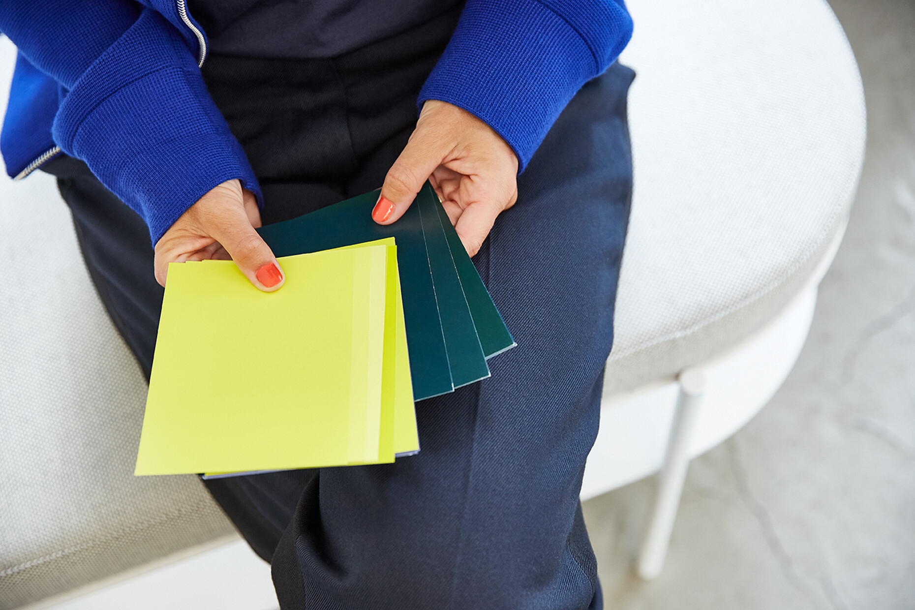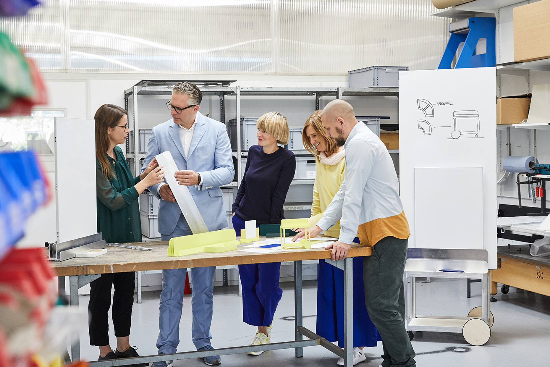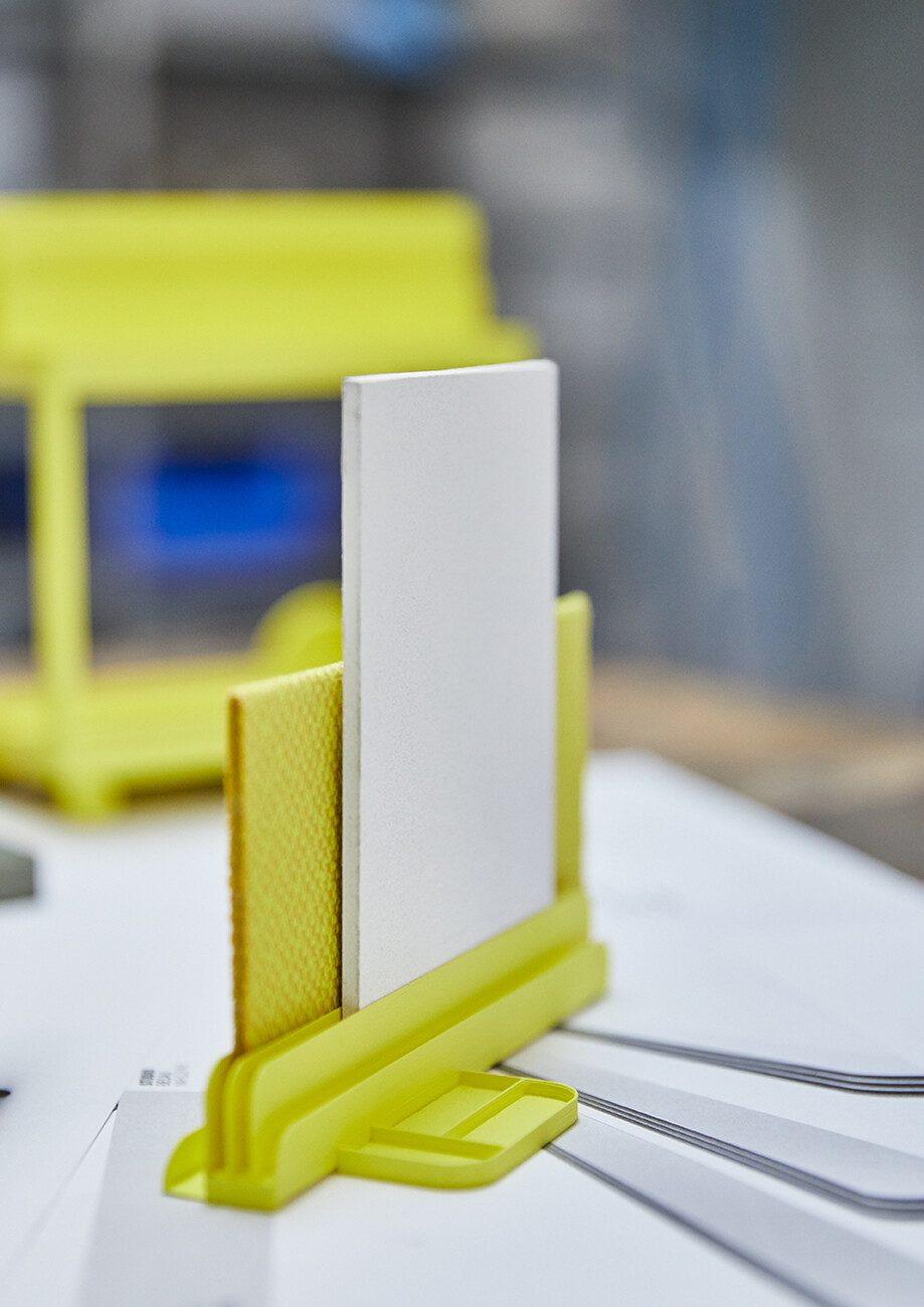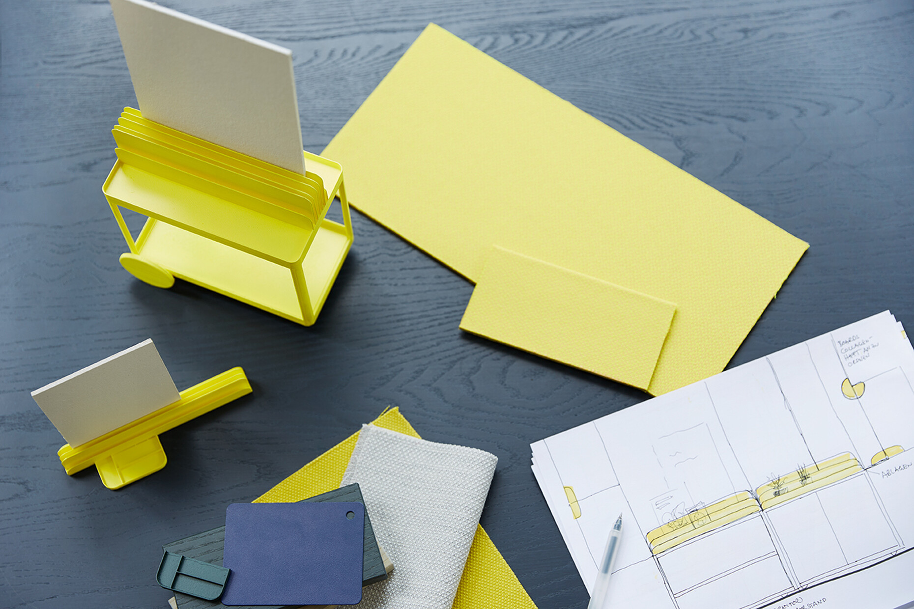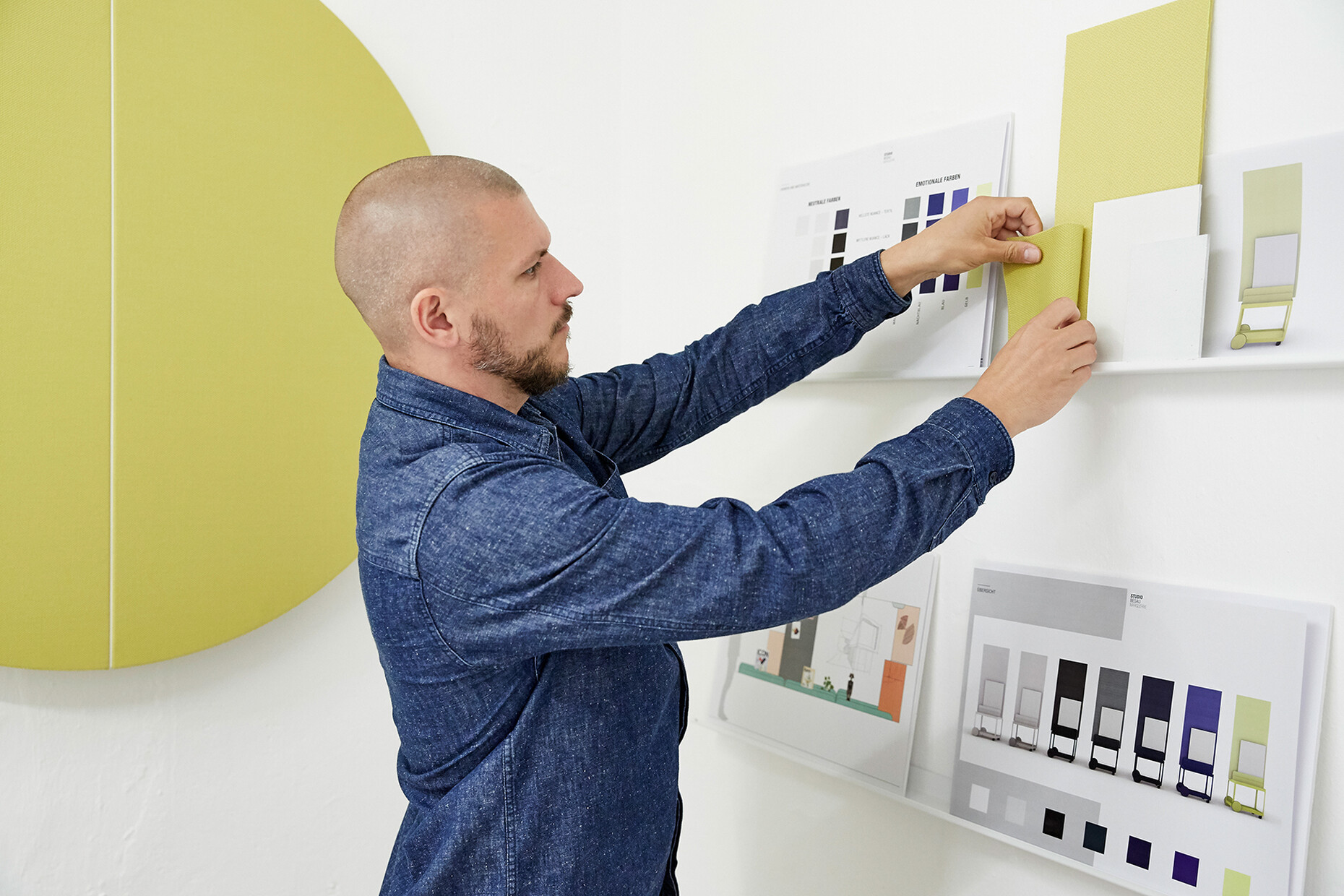 None of the elements of "SIGEL Mocon" are rigidly designed; each part can be used flexibly. At the same time, the unit is strikingly compact: “We wanted to get away from heavy, solid partition walls,” explains Marguerre. Instead, the design appears homely, incorporating wood and metal with rounded edges, and in its typology it is not unlike a serving trolley. Meanwhile, the register in which the boards are held can also be used for other objects in the home office. Depending on the individual requirements, it offers a very attractive way to present magazines, records or picture frames, for example. “The product is not supposed to be cold and impersonal, but rather to be perceived as a piece of furniture,” explains Marcel Besau. As color experts, Studio Besau Marguerre have come up with a range of elegant variations, ranging from classic black and white to cobalt blue and black green. For a more striking impression, there is also a combination of two statement shades in pared-back sulfur yellow and ultramarine blue. “A timeless color for the office doesn’t have to mean apple green,” says Eva Marguerre.