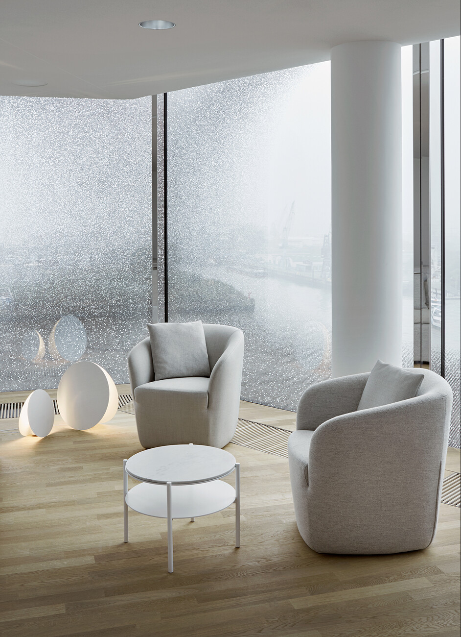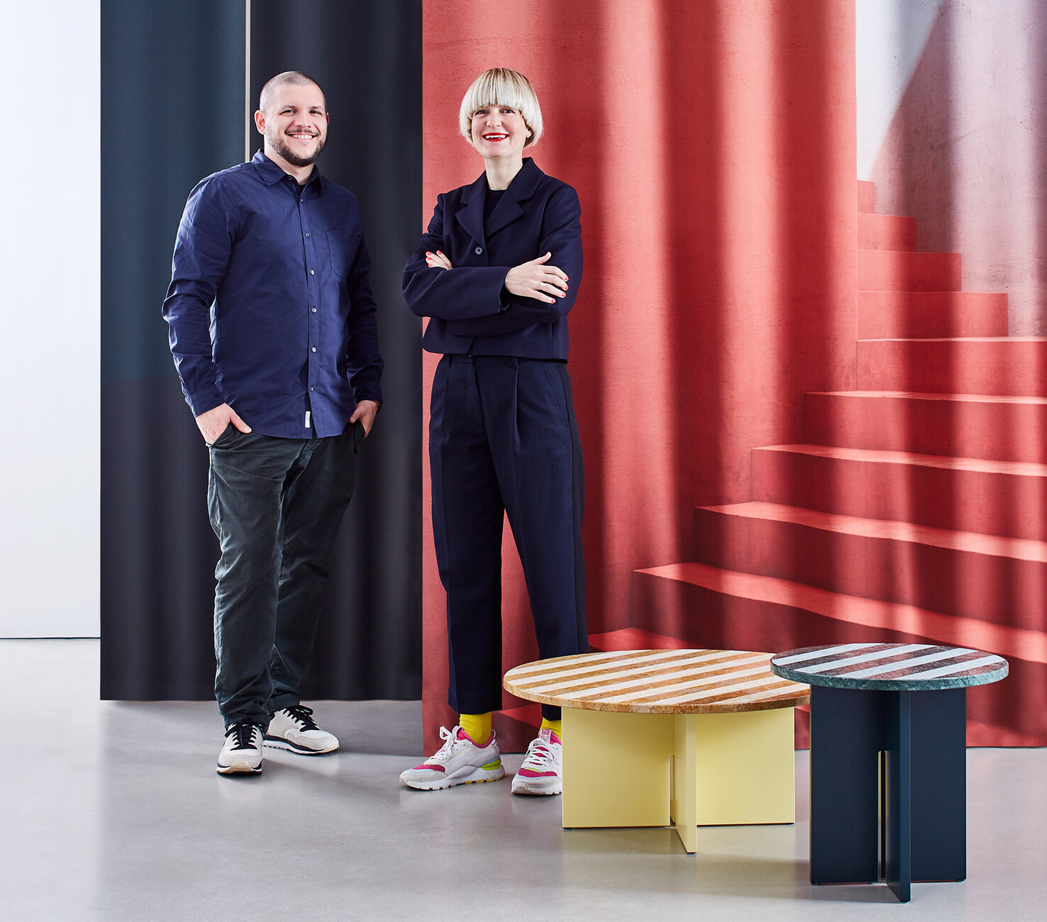 Working from premises on the ground floor of a charming old building in Hamburg’s Eimsbüttel district, Besau Maguerre kick off every new project with an internal workshop: The duo sit down with their three-strong team of architects and designers to play a kind of interdisciplinary ping-pong. This is followed up by moodboards with the help of their materials library, research on production methods 3D-sketches and first experiments in their own workshop. “It is always a shared journey,” explains Eva Marguerre. Color is an important factor in all of their projects. It assumes the role of telling stories, transporting an identity. “We are not primarily concerned with the effect but with finding the right color for the particular shape, and vice versa,” Marguerre continues. As with the color concept for the “214” coffee house chair by Thonet, which was produced in black, white, velvet red, and sage to mark the company’s 200th anniversary. By staining the connecting elements several shades lighter than the seat ring and legs a fascinating interplay of color arises and with it a modern interpretation of this classic product. The “Simetria” colored wall elements for Schönbuch which premiered at imm cologne 2020 also leave ample scope for a personal touch: Customers can choose from a large range of matt lacquers when it comes to the colors of the eight slim circular, semi-circular, rectangular or square cabinets. By contrast, Besau Maguerre chose many shades of white for their furniture series for the Elbphilharmonie concert hall, where the focus was on surfaces with a differing feel, ranging from steel via upholstery to marble. The design idiom is restrained and geometric. “A clear matter of reducing to the essentials,” the duo suggests.
